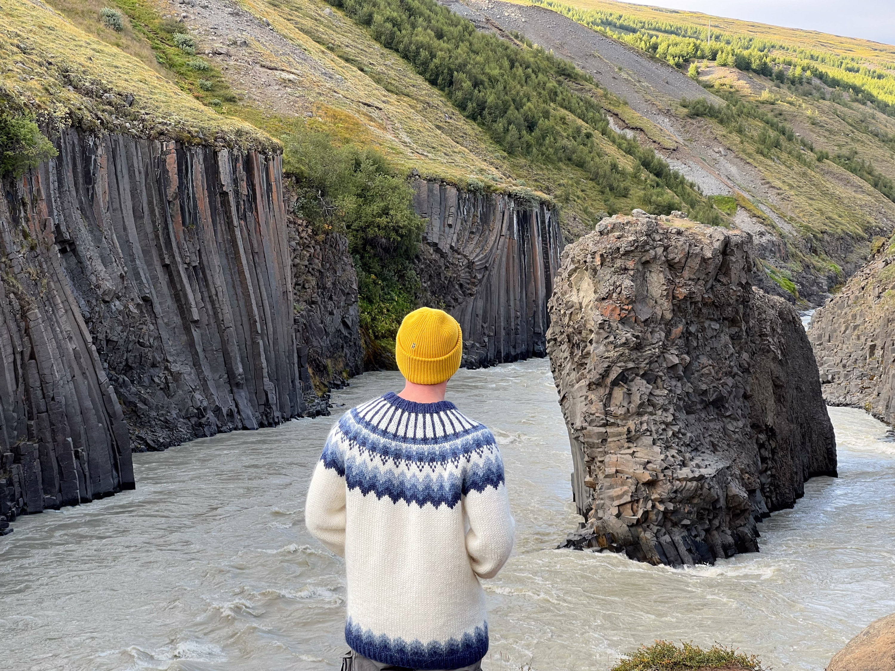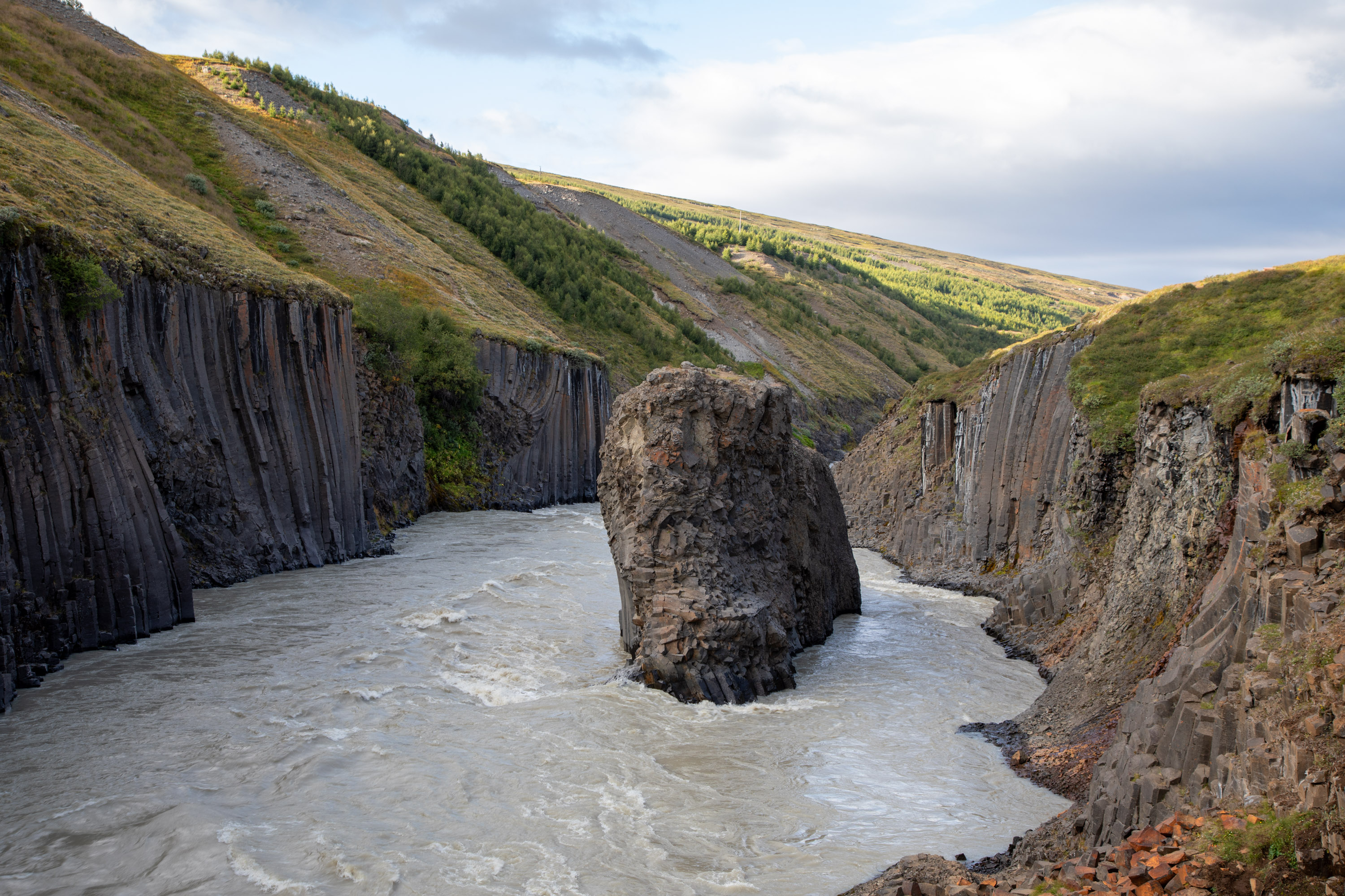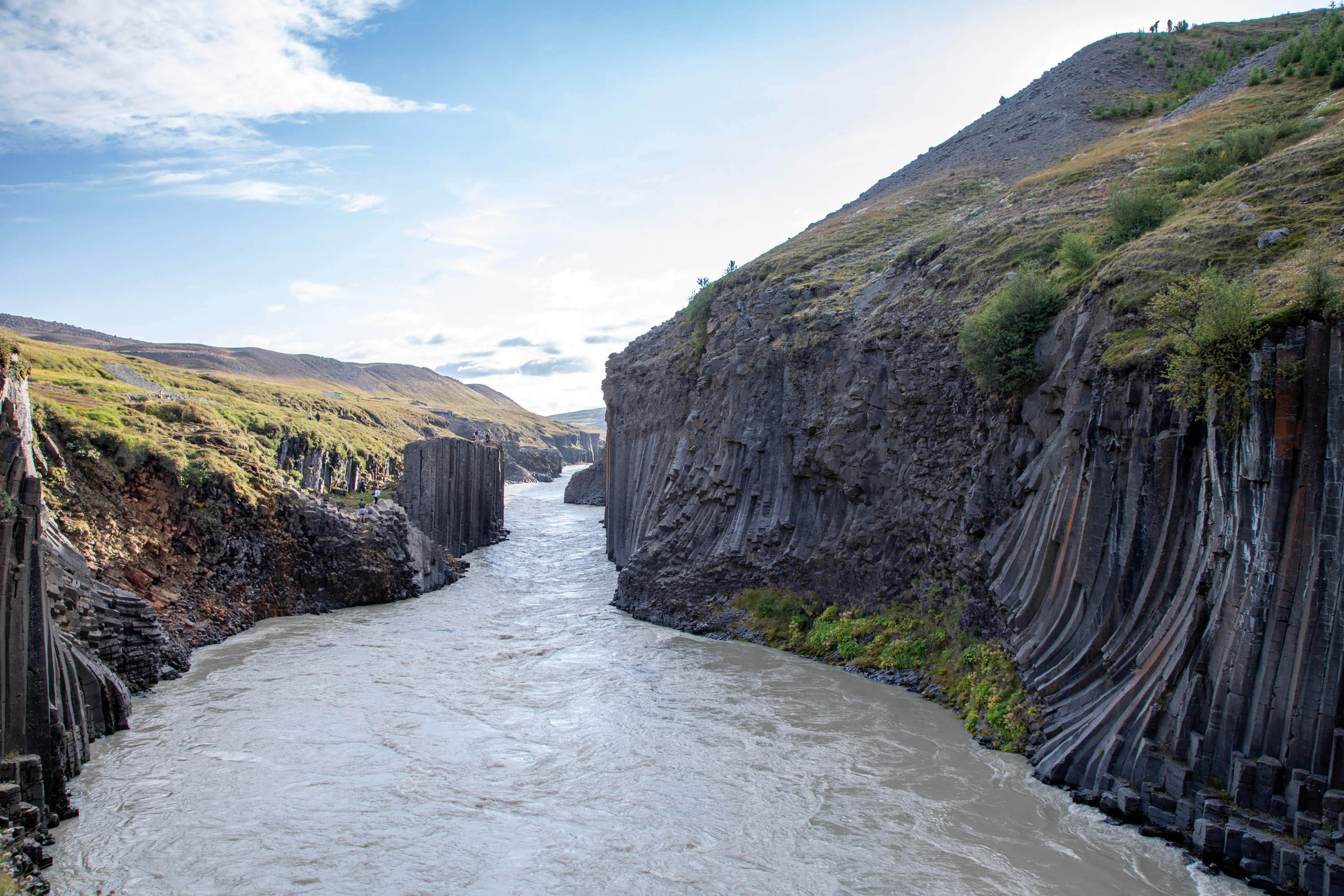 Un autre détour intéressant, un peu plus loin de la route que prévu c’est le canyon Stuðlagil. Il faut sortir de la route n°1 et prendre une piste jusqu’à l’entrée du canyon. Attention, la piste longe des prairies herbeuses où les moutons broutent gaiement sans faire attention aux véhicules qui croisent. Ils traversent la route sans regarder et c’est très dangereux. Une voiture qui nous précédait à fini en tonneau sur le bord de la piste, la voiture sur le toit car ils ont essayé d’esquiver l’animal au dernier moment. Cela nous calme et on roule au pas jusqu’au parking. Attention, on arrive d’abord au parking de l’Ouest et on se rend compte que les plus beaux points de vue se trouve de l’autre côté et il n’y a pas de pont. On peut quand même apercevoir face à nous la roche du canyon qui est en forme de bâtonnets.