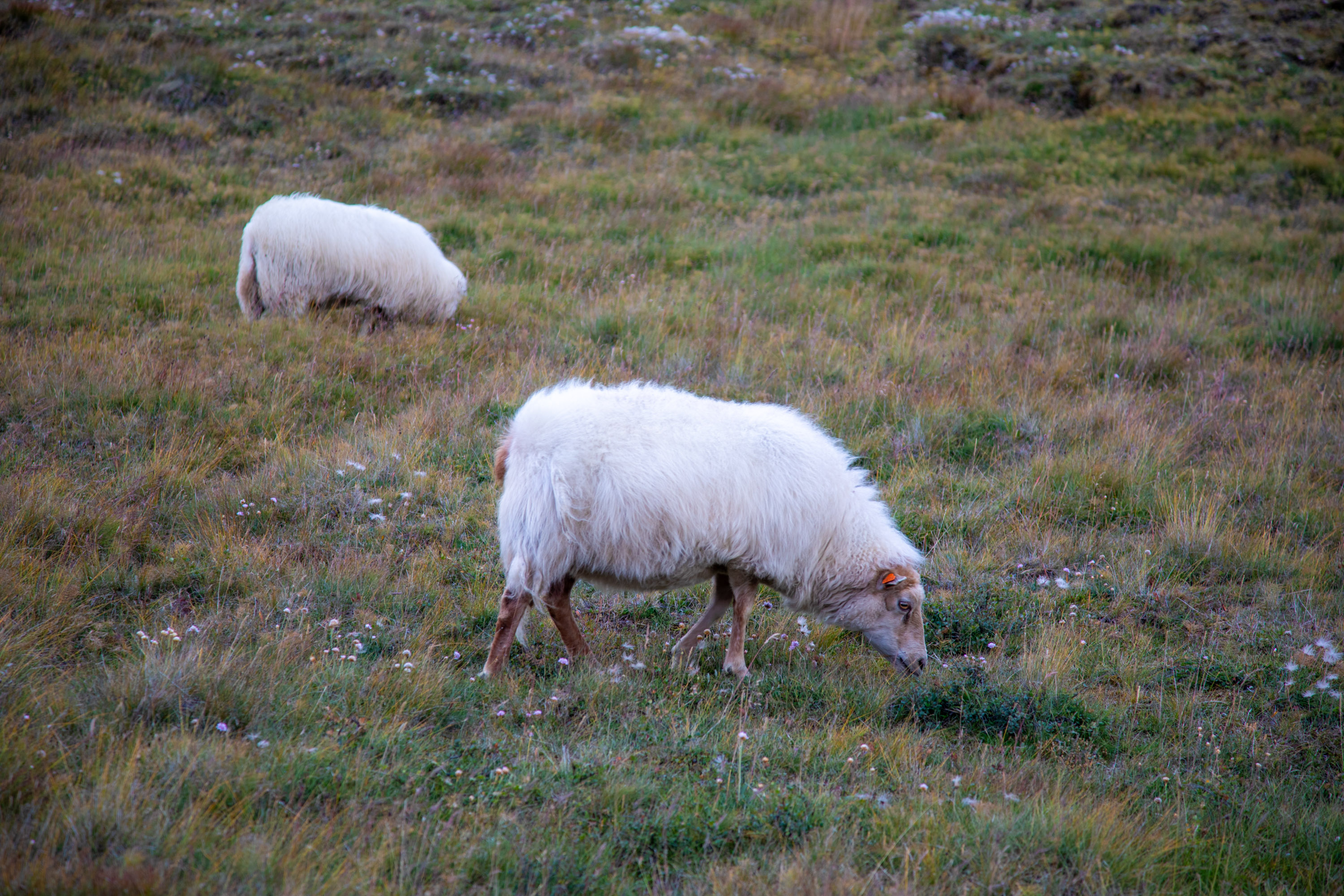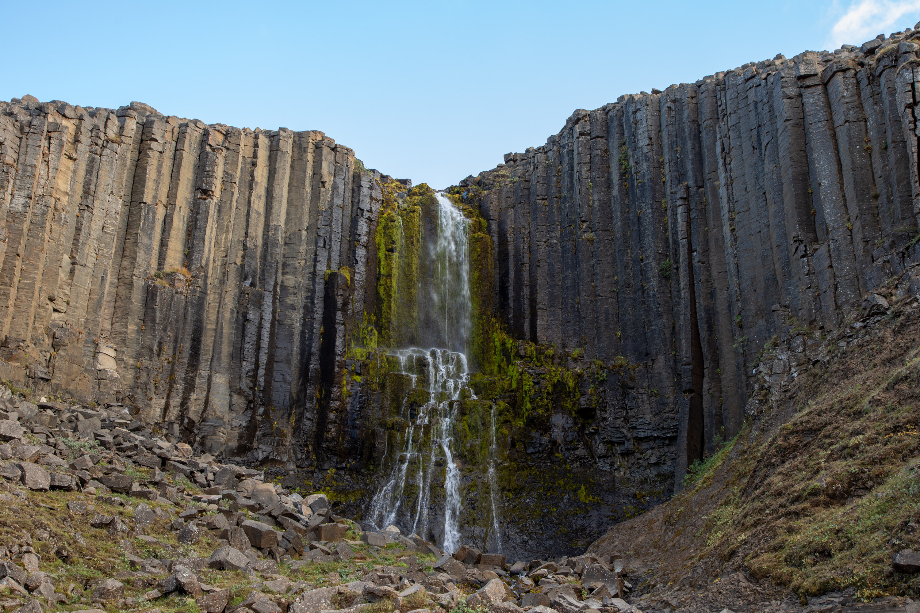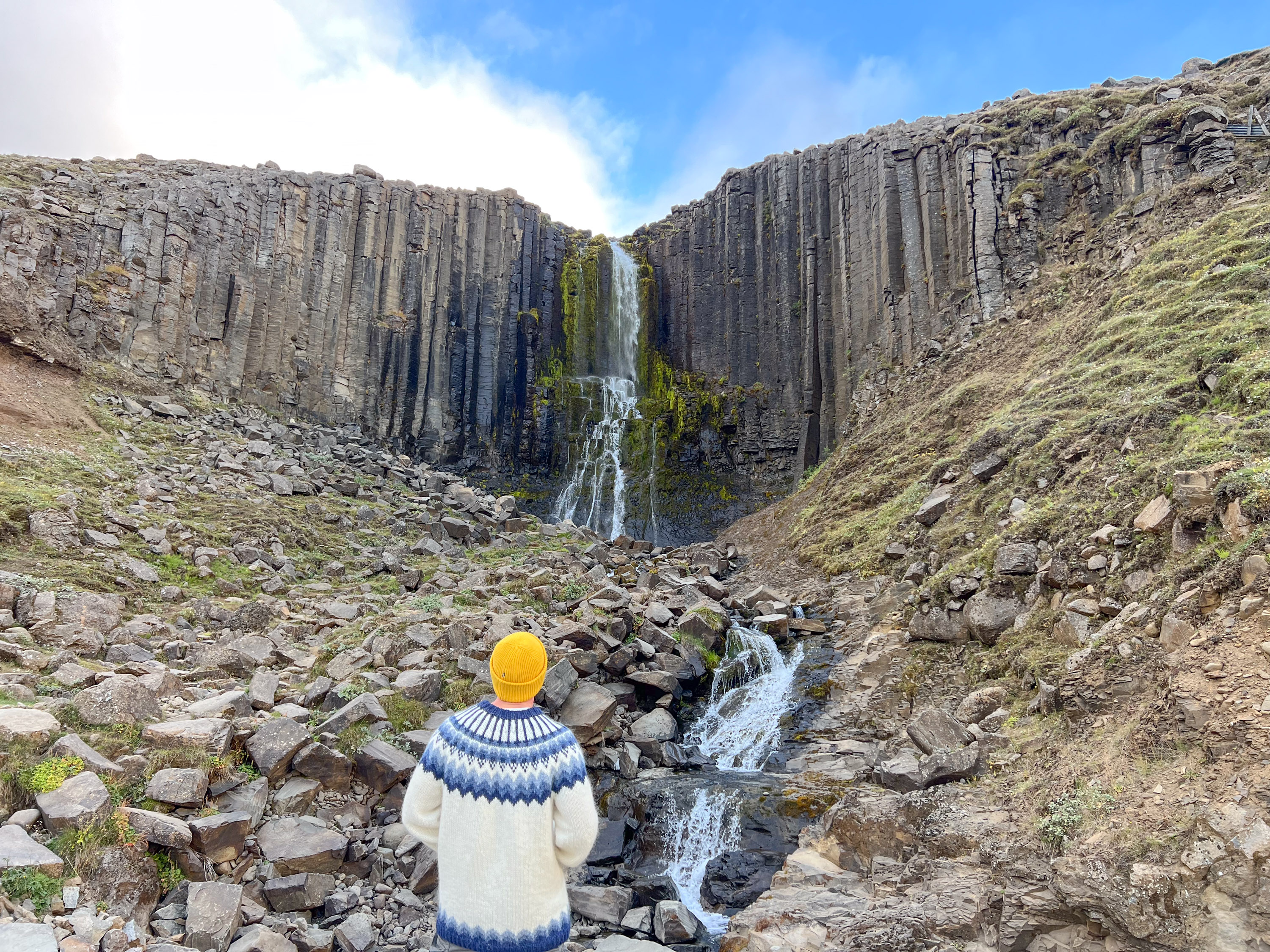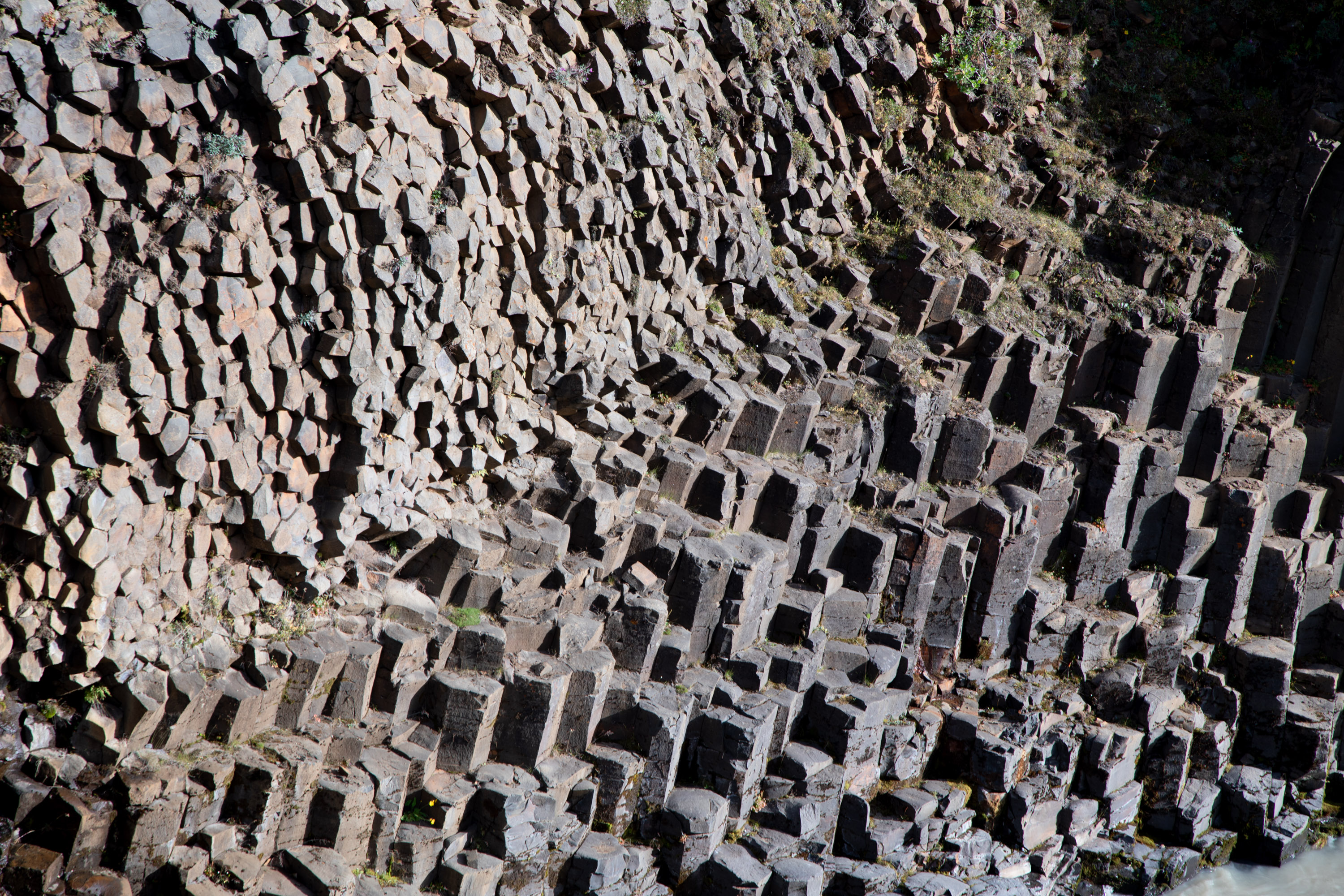 Un autre détour intéressant, un peu plus loin de la route que prévu c’est le canyon Stuðlagil. Il faut sortir de la route n°1 et prendre une piste jusqu’à l’entrée du canyon. Attention, la piste longe des prairies herbeuses où les moutons broutent gaiement sans faire attention aux véhicules qui croisent. Ils traversent la route sans regarder et c’est très dangereux. Une voiture qui nous précédait à fini en tonneau sur le bord de la piste, la voiture sur le toit car ils ont essayé d’esquiver l’animal au dernier moment. Cela nous calme et on roule au pas jusqu’au parking. Attention, on arrive d’abord au parking de l’Ouest et on se rend compte que les plus beaux points de vue se trouve de l’autre côté et il n’y a pas de pont. On peut quand même apercevoir face à nous la roche du canyon qui est en forme de bâtonnets.