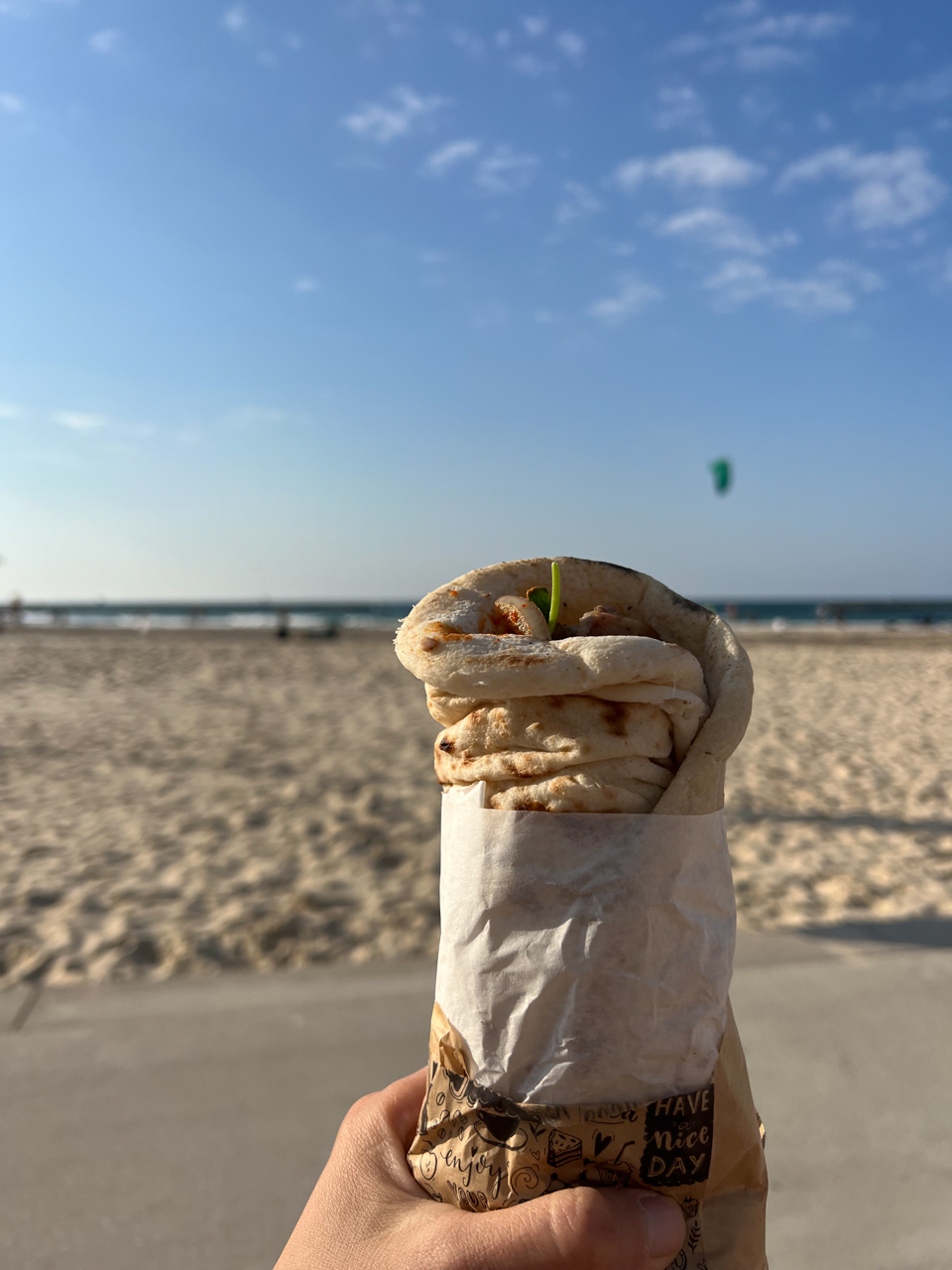 On est parti de la Savoie il fait très froid ce matin et on arrive à Tel Aviv la température approche des 30°C en ce début Novembre. On se change, et range les chaussures, jeans, pulls, et manteaux dans la valise, pour les échanger avec short, claquettes et lunettes de soleil. On achète notre premier shisch kebab du voyage, vendu à un prix d’or 15 Euro l’unité, pour le manger au bord de la plage. L’ambiance est dynamique sur cette promenade, entre les joggeurs, les plagistes, les joueurs de volley ou tout simplement les nombreux couples qui marchent tranquillement le long de cette belle zone piétonne qui fait face à la Mer Méditerranée. Quel changement d’univers en une demie journée.