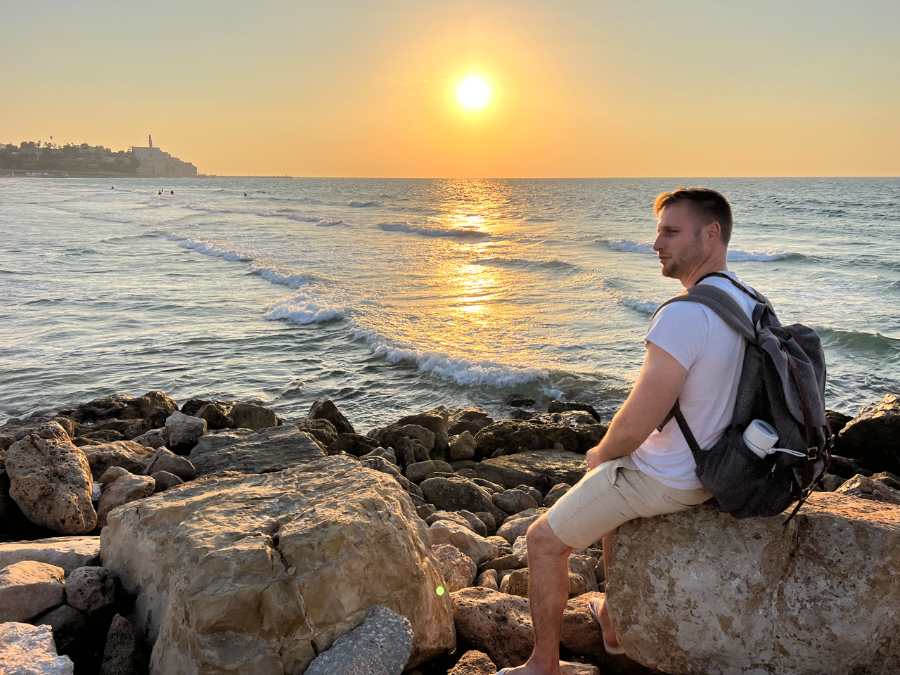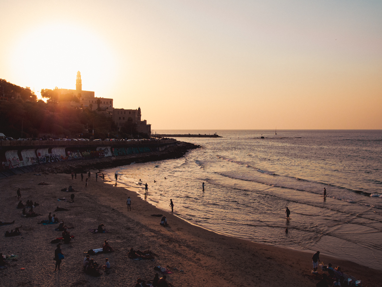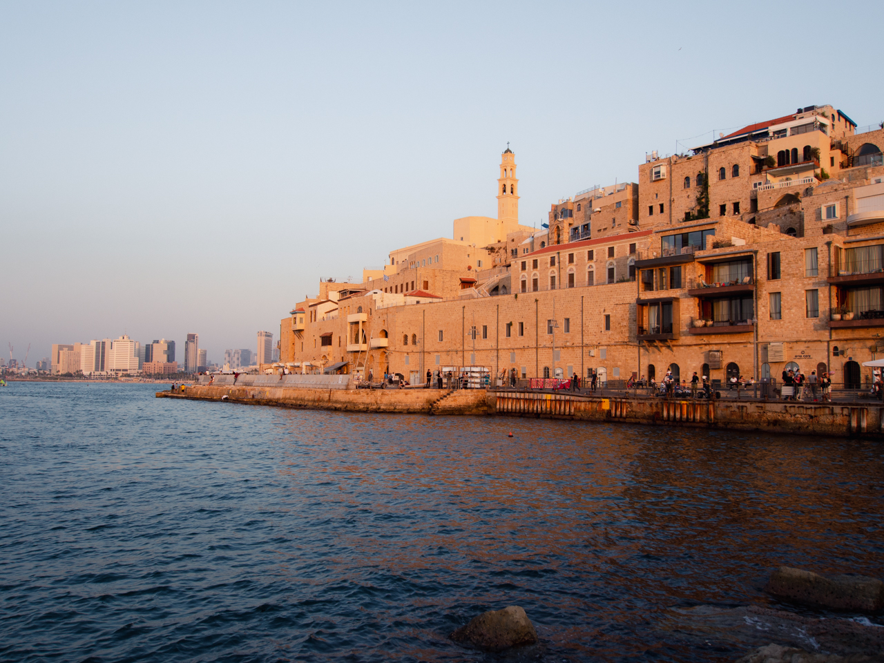 On s’installe sur les rochers qui donnent de l’autre côté de la plage, vers la vieille ville de Jaffa et son clocher. Ce quartier est le quartier historique de Tel Aviv, avec une population arabe plus importante, qui est stratégiquement installé sur une colline face à la mer.