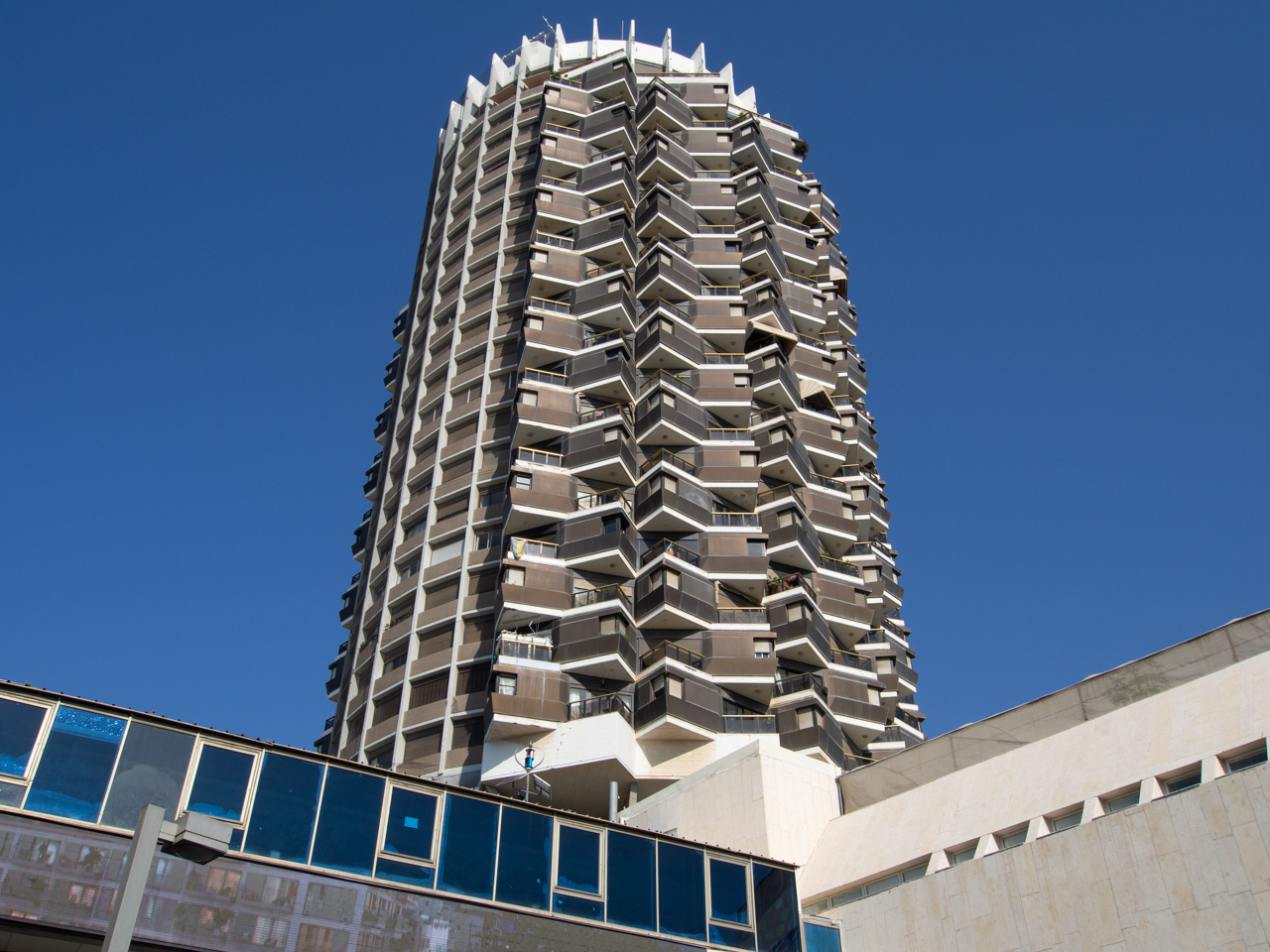 Autour de ce quartier, il y a beaucoup de cafés ouverts avec terrasses. Les bancs sont remplis de clients avec leurs chiens. Je crois que l’on n’a jamais autant de chiens qu’à Tel Aviv. Au dessus du Dizengoff Center une tour circulaire aux balcons pointus attirent notre attention. Encore un autre bâtiment qui fait la spécificité de Tel Aviv.