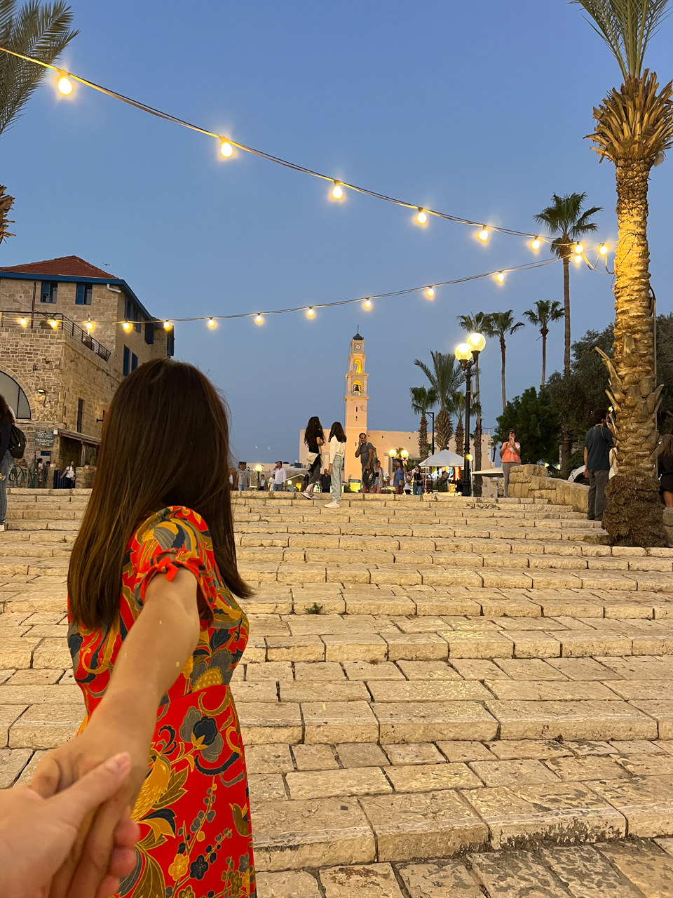 Les lumières de Jaffa s’allument et on aperçoit le minaret de la mosquée en vert à côté du clocher de l’église qui domine la colline.