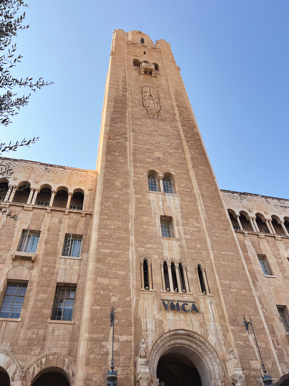 La gare de Jérusalem est magnifique, moderne, et on doit remonter plusieurs Escalators pour arriver à en sortir. Il fait beaucoup plus frais ici. Le vent souffle, le soleil tape fort, mais le fond de l’air est beaucoup moins doux et agréable qu’à Tel Aviv. On a vraiment l’impression de changer d’univers, il n’y a plus beaucoup de jeunes en débardeurs qui courent au contraire la plupart des gens sont habillées très sobrement. On éprouve encore une fois des difficultés pour se repérer et prendre le bon bus jusqu’à notre hôtel. Finalement après quelques errements le bus arrive et on s’installe pour une dizaine de minutes dans les embouteillages de la ville. Notre hôtel est le YMCA Three arches, situé en face de la vieille ville de Jérusalem, c’est un hôtel emblématique de la ville, construit par le même architecture que celui qui a construit l’Empire State Building de New York, il est aussi dans le style des années 30.