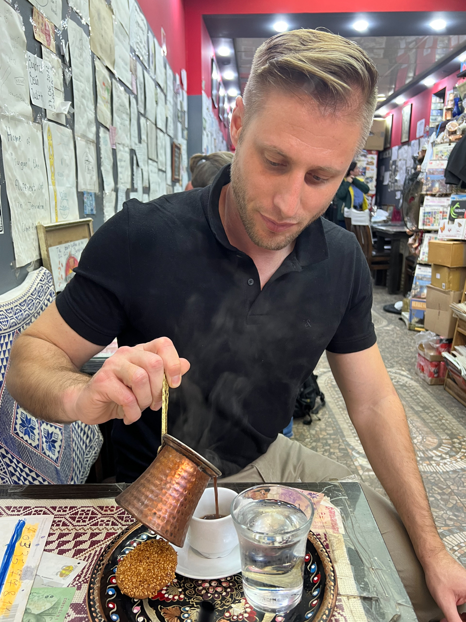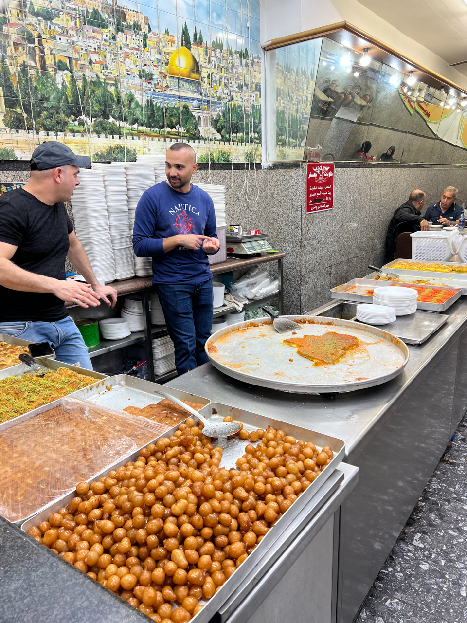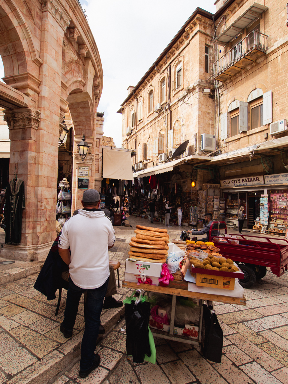Puis on fait un arrêt déjeuner au marché avec les meilleurs sandwich au falafel que l’on a mangé du séjour - les moins chères à 12 NIS l’unité - chez Hidmi Falafel au niveau du carrefour vers la Damascus gate. En face, un vendeur de café nous permet de finir le repas avec un café des sables pour 7 NIS, notre repas le plus économique de toute la semaine. On est accompagné par les appels à la prière depuis le minaret, et on s’installe sur le côté de la rue pour en voir l’animation passionnante en étant absorbé par cette atmosphère orientale que l'on aime tant.