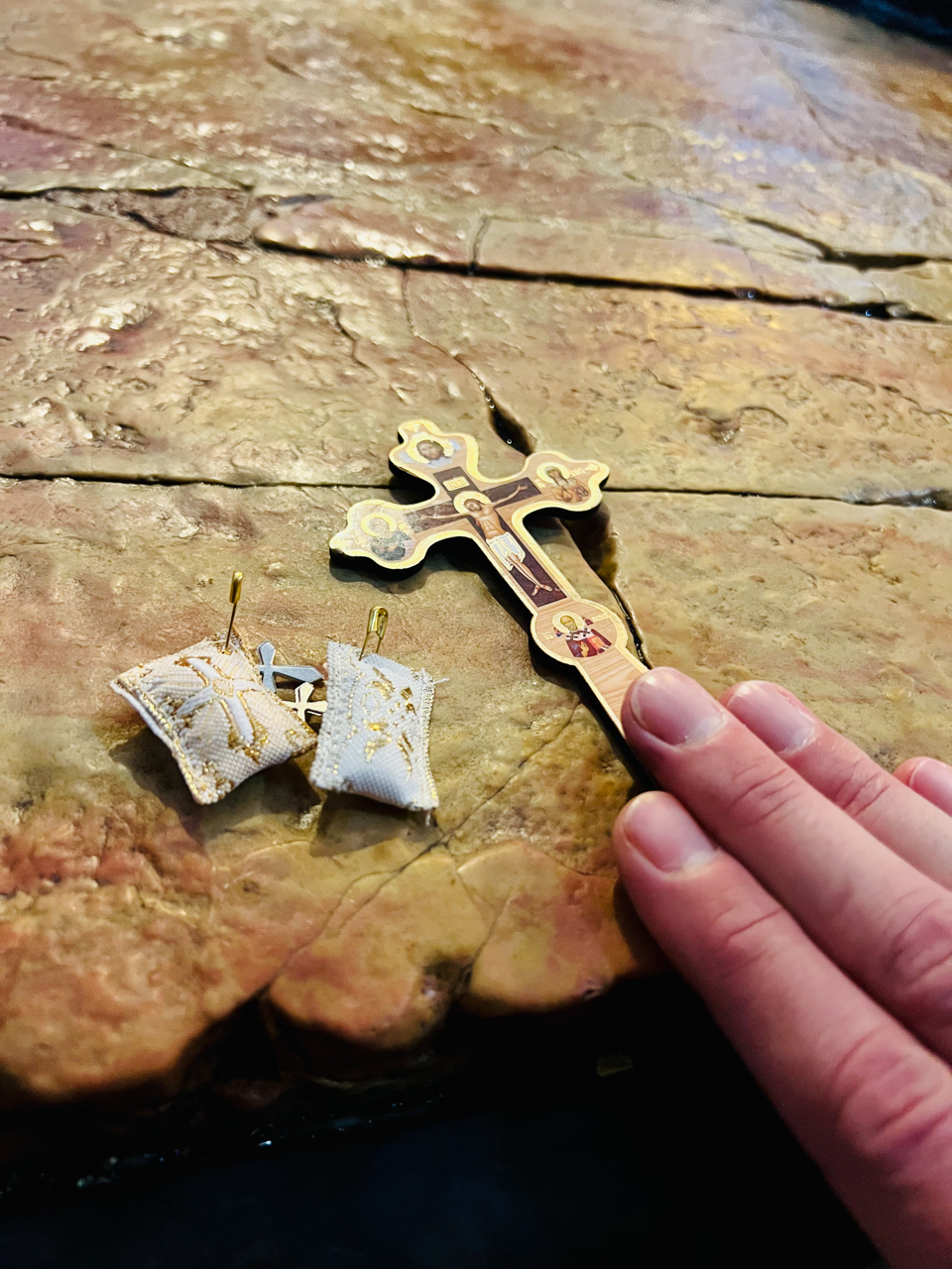 Les pèlerins veulent tous s’agenouiller et toucher la pierre qui est couverte d’huile d’onction. Cette pierre est l’objet d’une grande dévotion, située à l’entrée de la basilique.