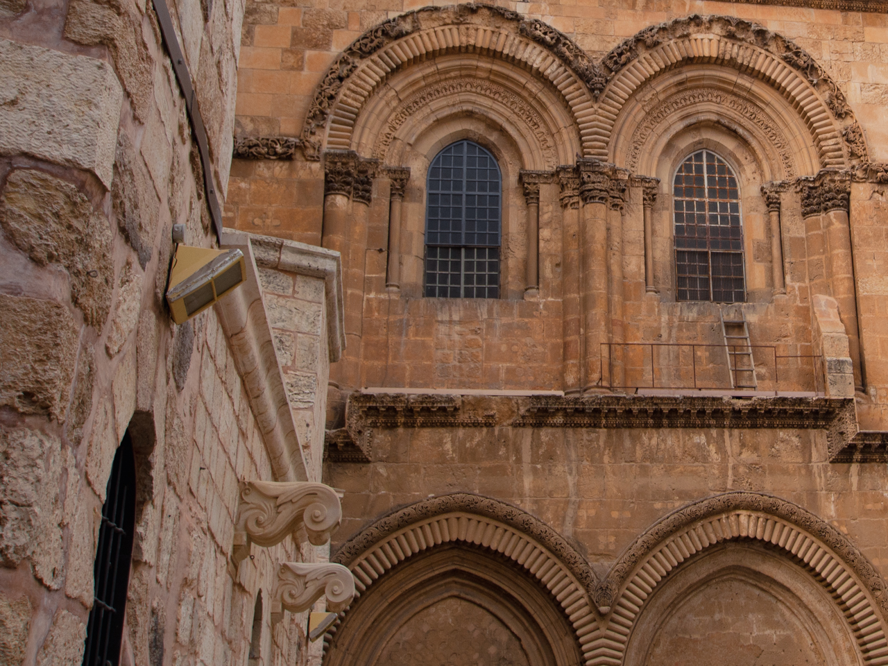 On peut imaginer la complexité de la relation entre les communautés qui gèrent ce lieu de culte tellement sacré lorsque l’on revient devant la façade extérieure. On aperçoit une échelle sur un des balcons devant la fenêtre de l’église. Ce qui semblerait être une simple échelle pour un chantier en cours est en fait un des symboles les plus connus de cette complexité. Il y a plus de 300 ans lorsque les règles ont été établis par l'Empire Ottoman sur le partage de la gestion de l’édifice, du jour au lendemain l’échelle a été abandonnée et elle n’a depuis pas bougée. Elle appartient à une communauté alors que l’accès à la fenêtre appartient à la communauté, personne ne veut prendre la responsabilité pour un autre de toucher à cet objet au risque de créer un conflit. Ce qui fait que l’on retrouve cette fameuse échelle sur les gravures du XVIIIe, XIXe, les photographies du XXe et même sur la photo que j’ai fait en 2022.