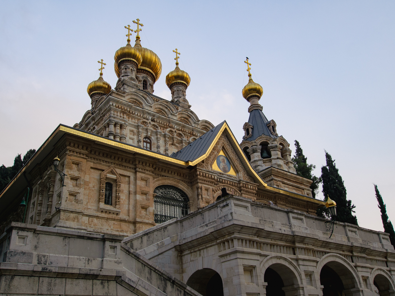 Il fait froid et le vent redouble d’intensité. On ne reste pas pour le coucher de soleil qui est dans quelques minutes car on risque de se transformer en glaçon. On décide de redescendre pour visiter l’église avec ses bulbes dorées que l’on voyait depuis le sommet, l’église de Marie Madeleine offerte par le Tsar de Russie et qui a une architecture orthodoxe magnifique. Mais lorsque l’on arrive devant la porte en même temps qu’un couple de russes, on se rend compte que les visites ne sont que le matin. Ils sonnent quand même à l’interphone et une nonne vient voir ce qu’ils se passent. On comprend dans leur intonation qu’ils demandent à pénétrer dans l’église pour prier. La nonne acquiesce et nous regarde, elle nous demande en russe si nous sommes chrétiens, en fait je ne sais pas trop ce qu’elle nous dit mais encore une fois par l’intonation on essaye de deviner. Puis elle nous fait signe de la suivre avec le couple de russes. Elle nous accompagne au pieds de cette église splendide.