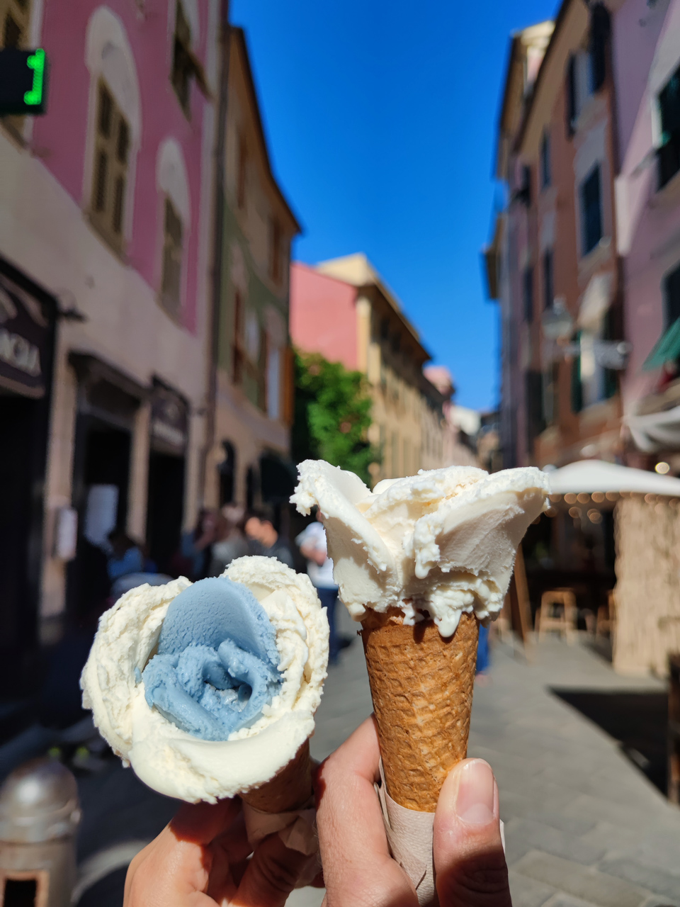 On se prend une glace dans un glacier réputé, qui nous sert deux cônes en forme de pétales de fleurs.