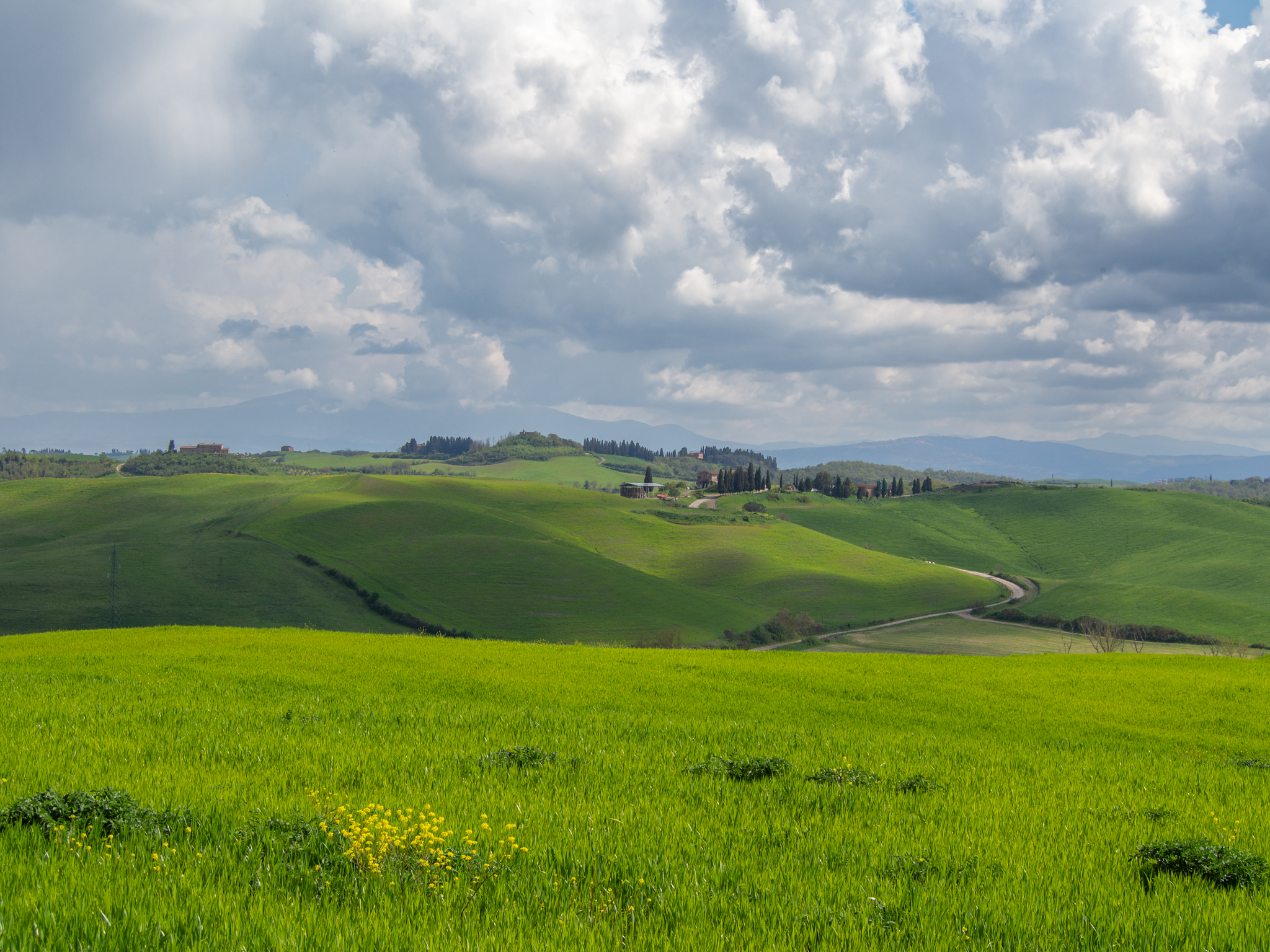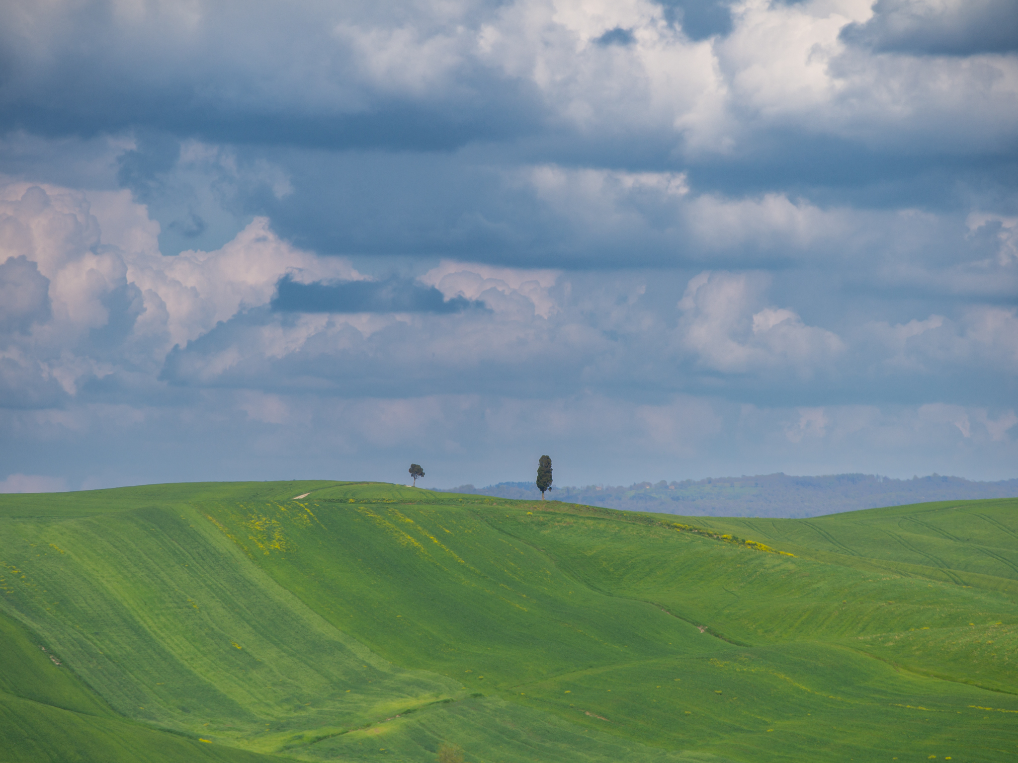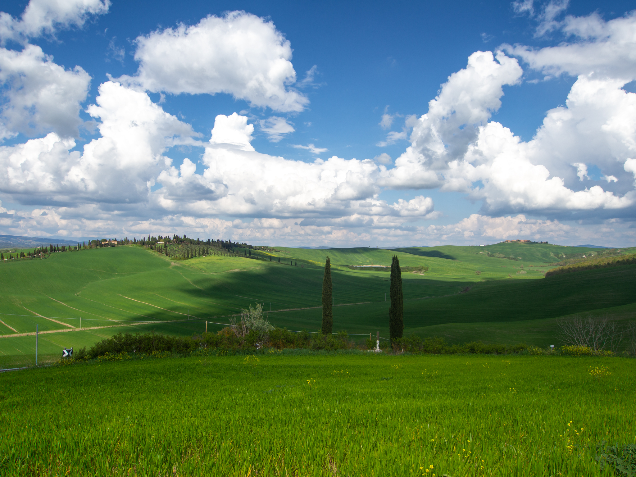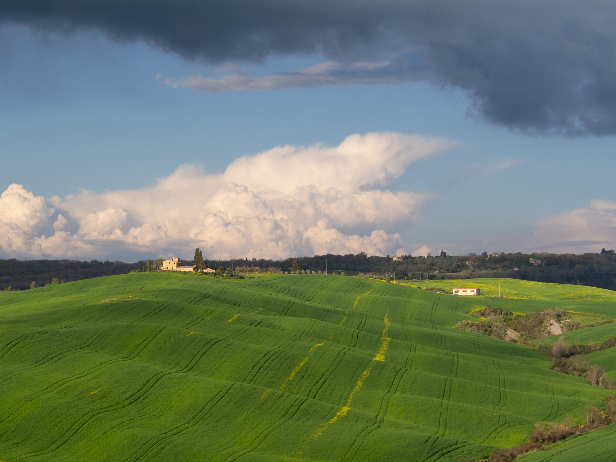 En sortant de Sienne, on part en direction du village d’Asciano, la route nous amène directement dans ce décor de collines couvertes de prairies aux couleurs intenses seulement interrompues par des fermes et quelques arbres. On est dans la région des Crete Senesi. En plus, de gros nuages annonciateurs de l’orage qui claque tous les après midi ajoutent de belles ombres.