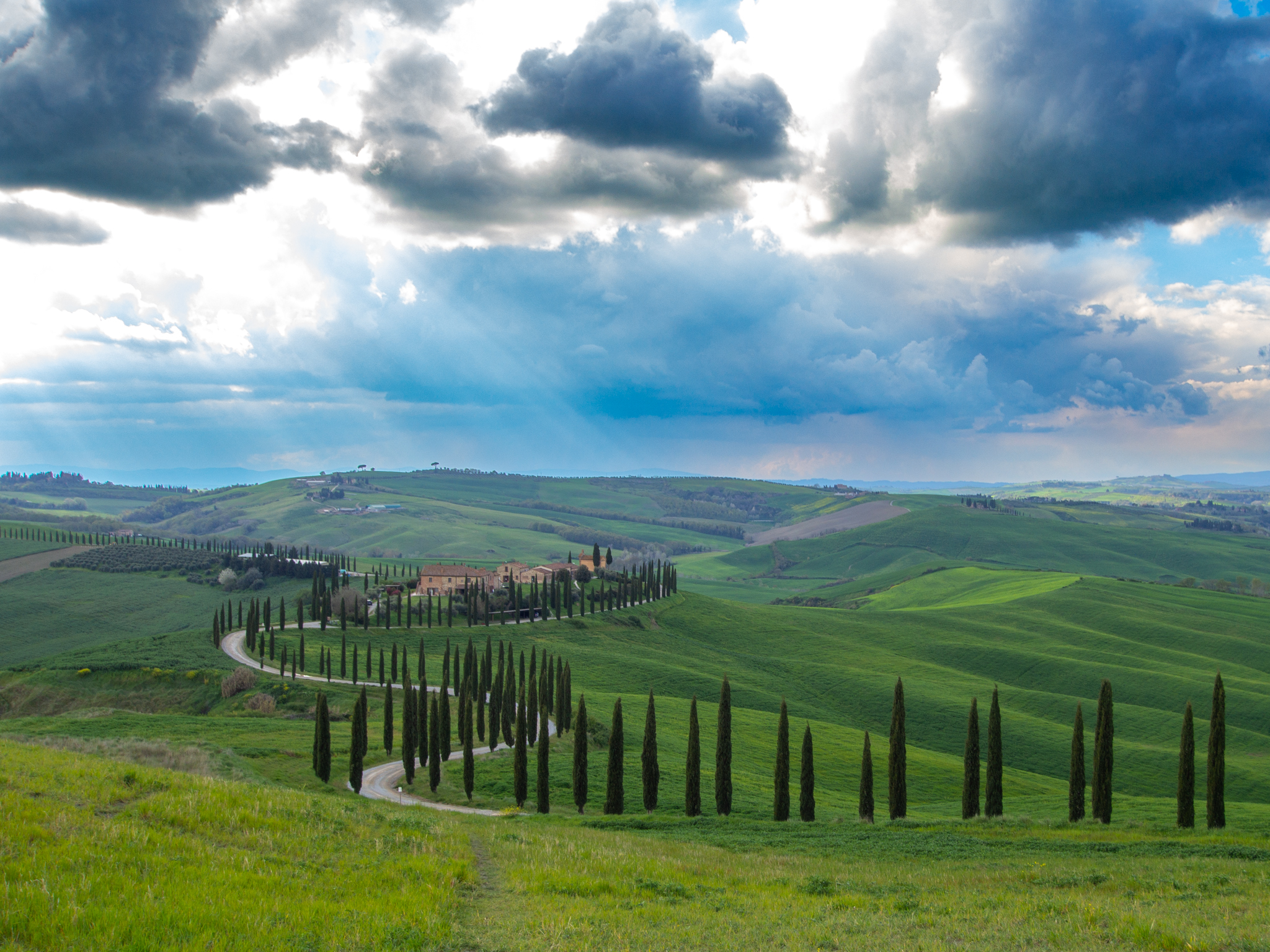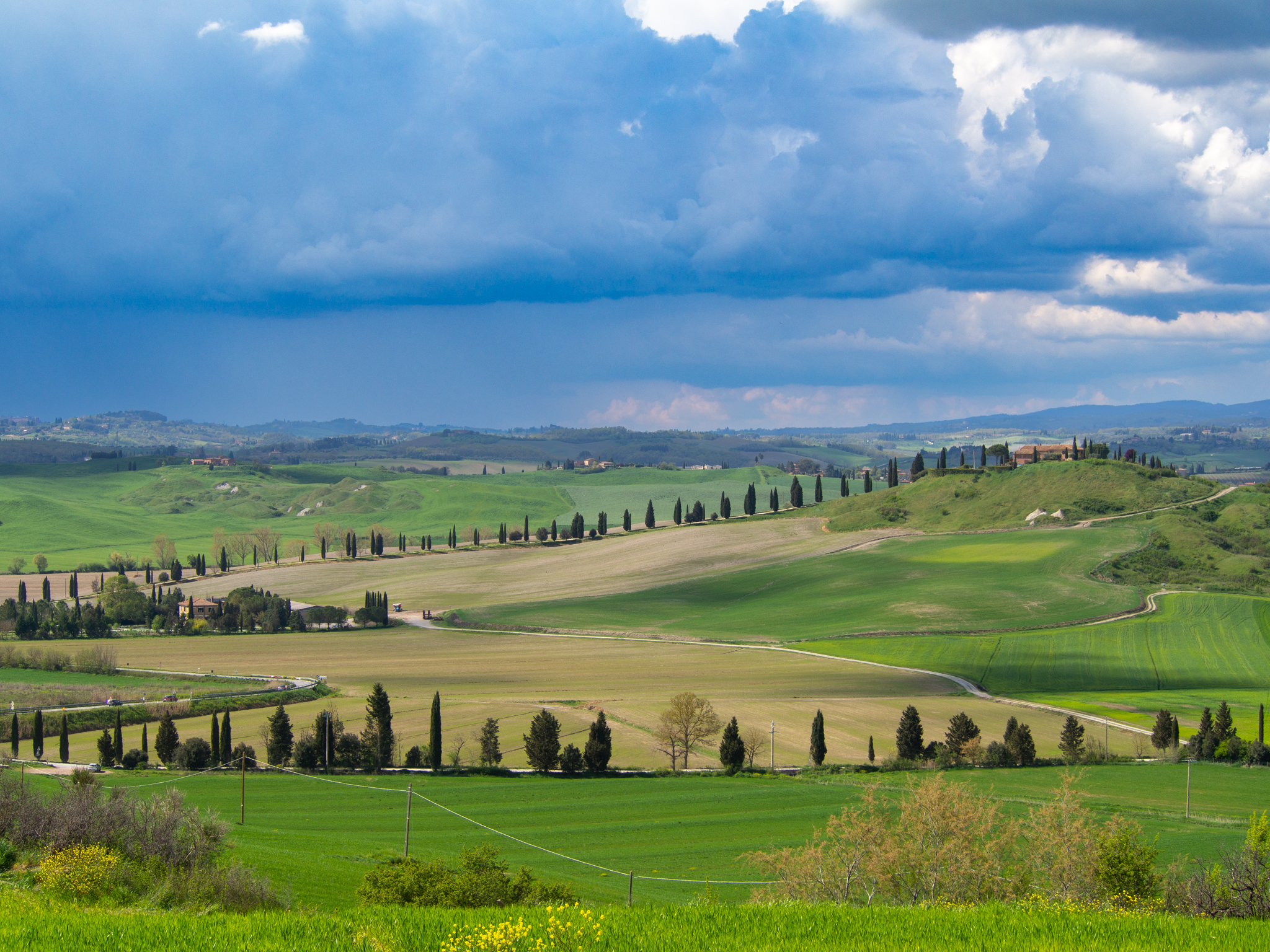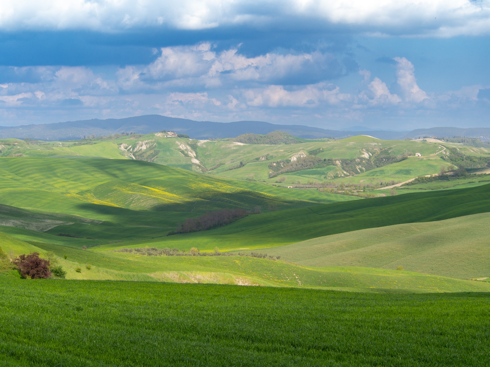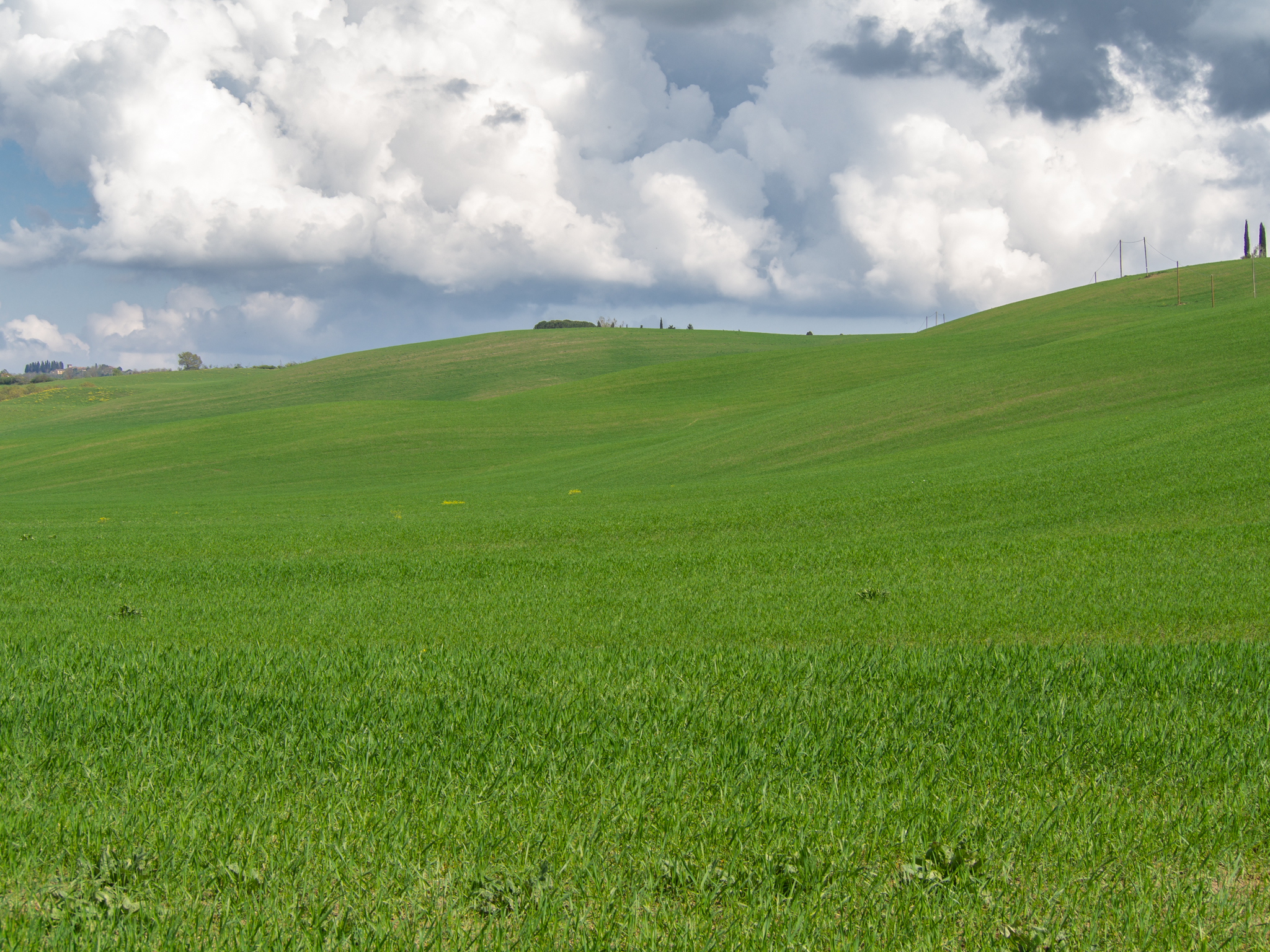 En sortant de Sienne, on part en direction du village d’Asciano, la route nous amène directement dans ce décor de collines couvertes de prairies aux couleurs intenses seulement interrompues par des fermes et quelques arbres. On est dans la région des Crete Senesi. En plus, de gros nuages annonciateurs de l’orage qui claque tous les après midi ajoutent de belles ombres.