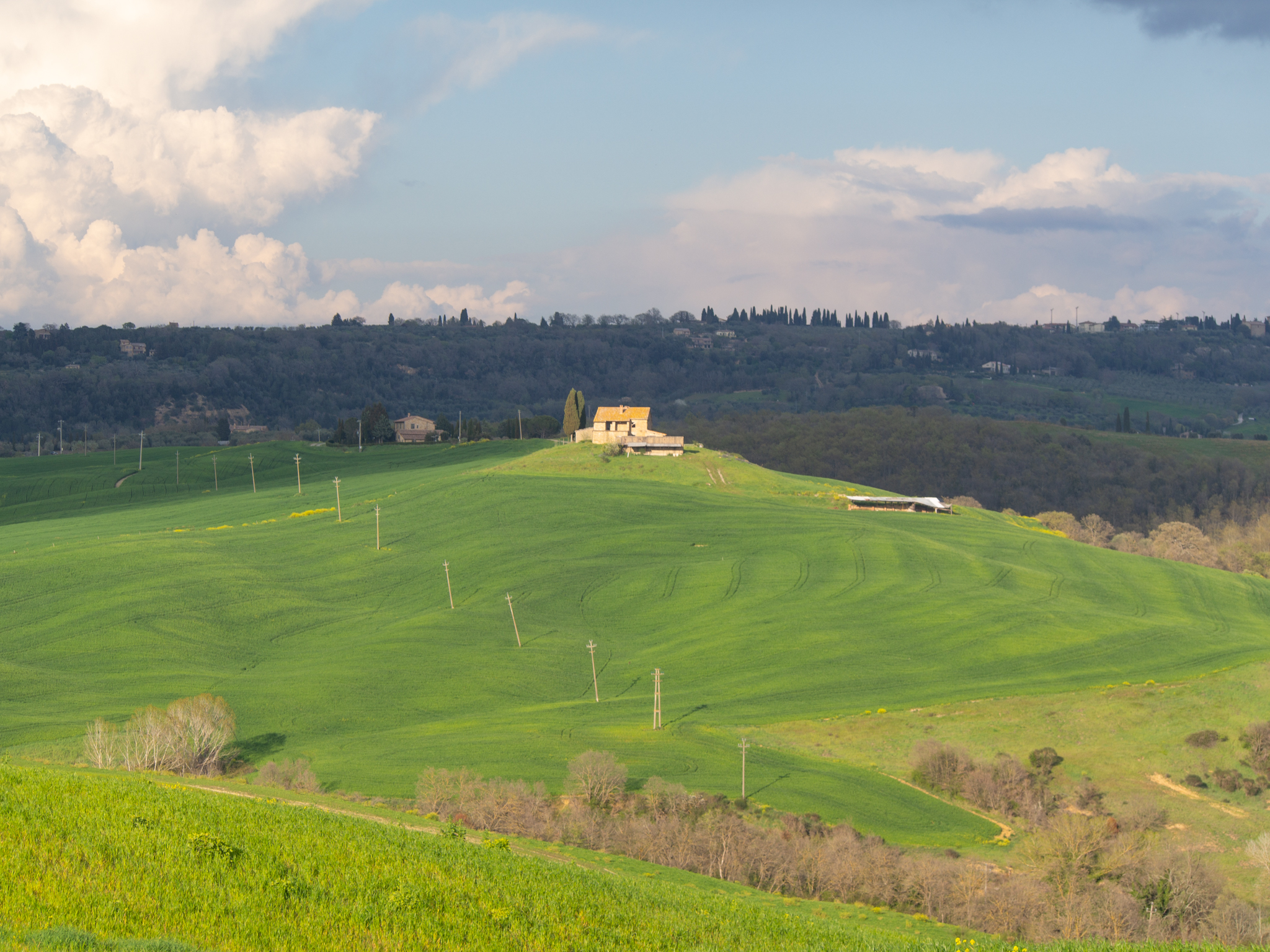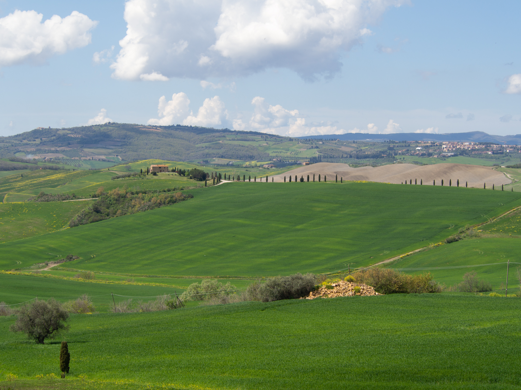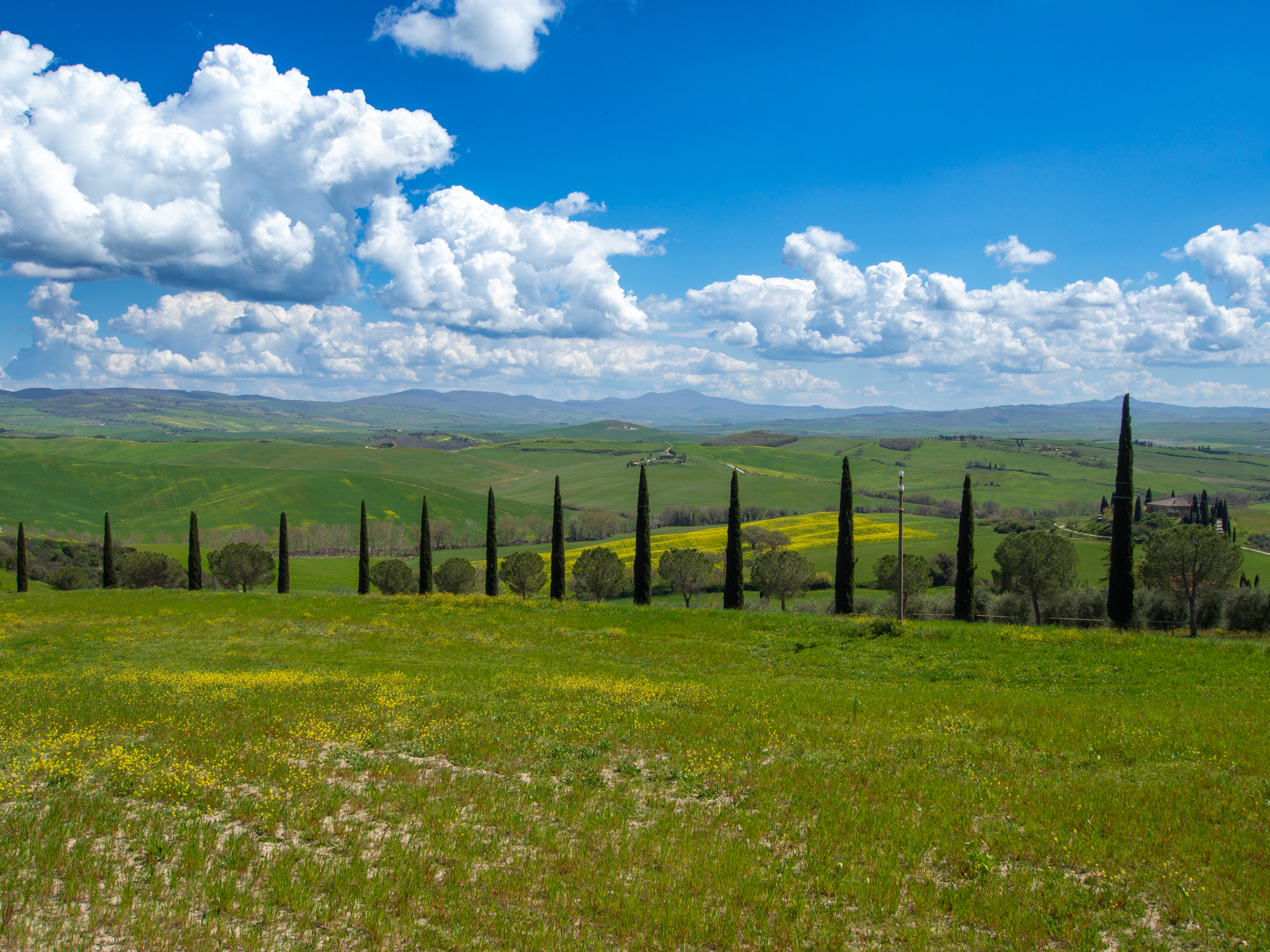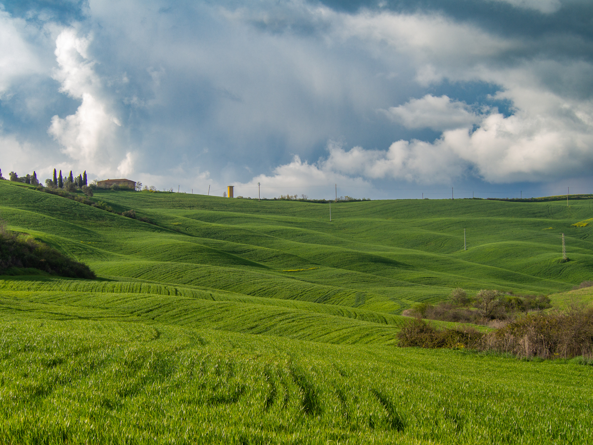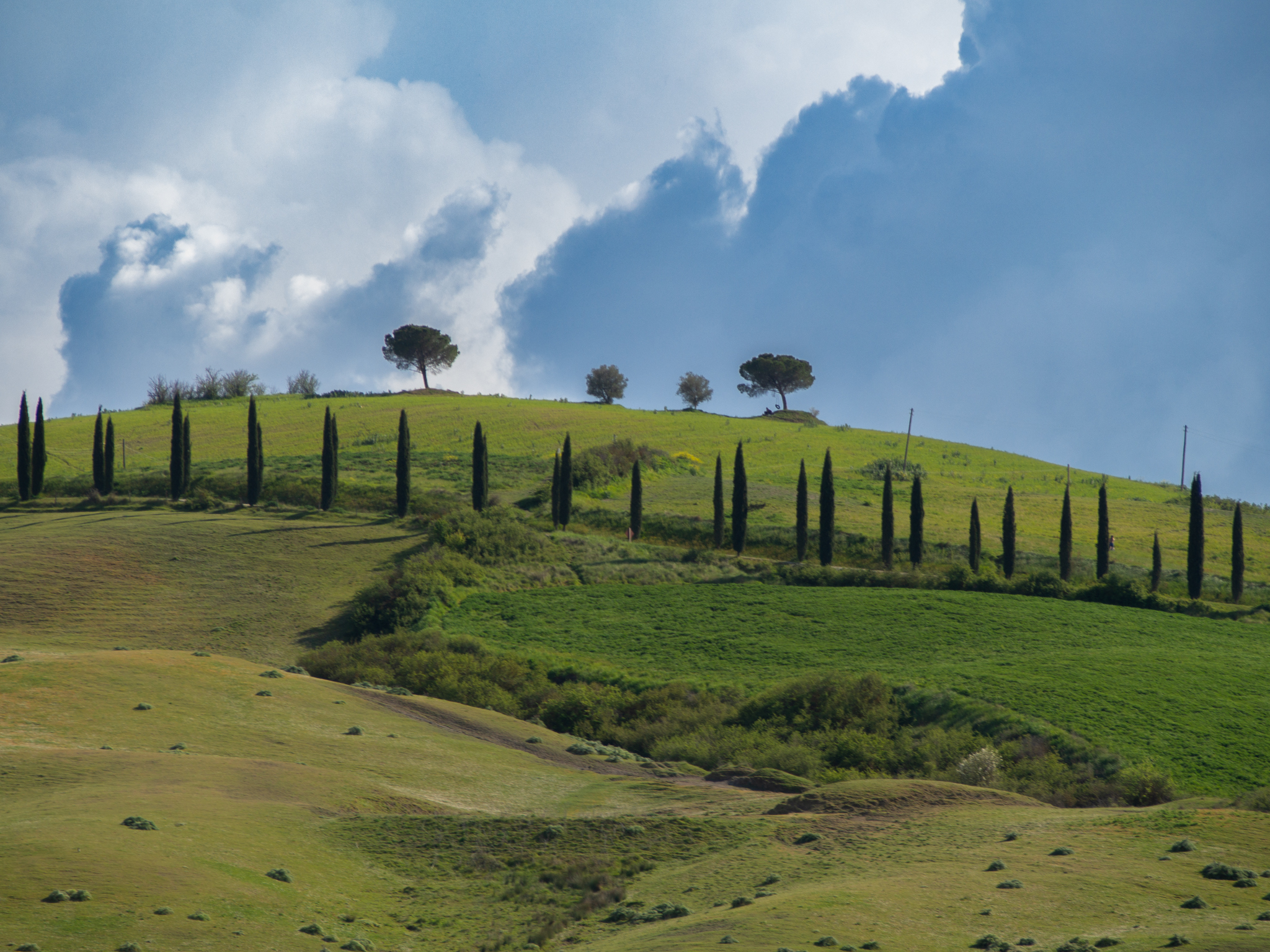 En sortant de Sienne, on part en direction du village d’Asciano, la route nous amène directement dans ce décor de collines couvertes de prairies aux couleurs intenses seulement interrompues par des fermes et quelques arbres. On est dans la région des Crete Senesi. En plus, de gros nuages annonciateurs de l’orage qui claque tous les après midi ajoutent de belles ombres.