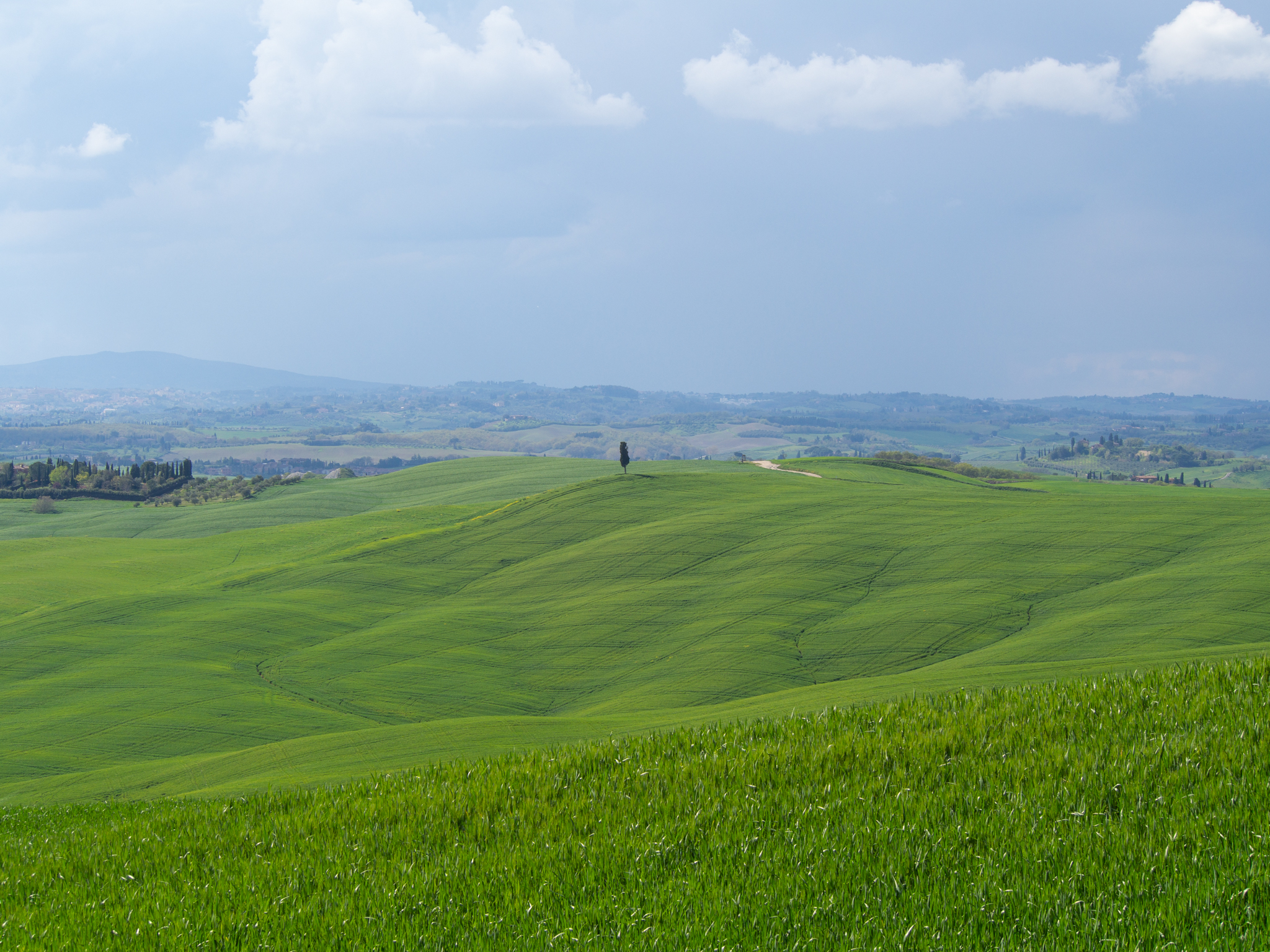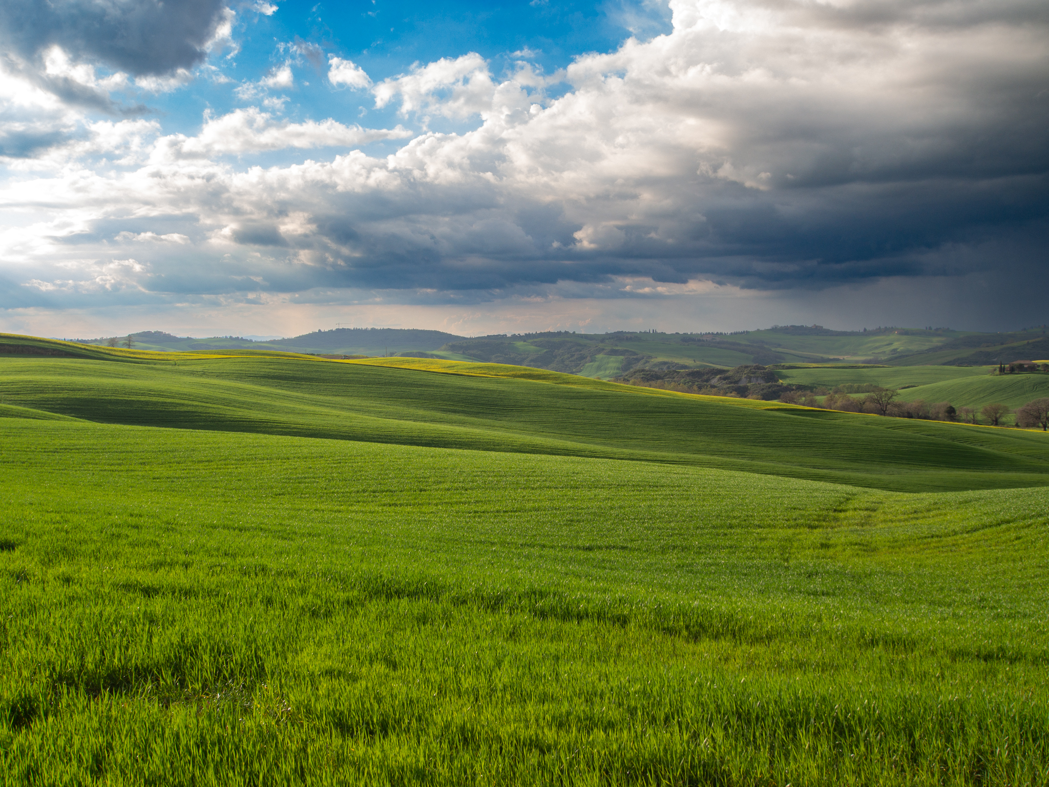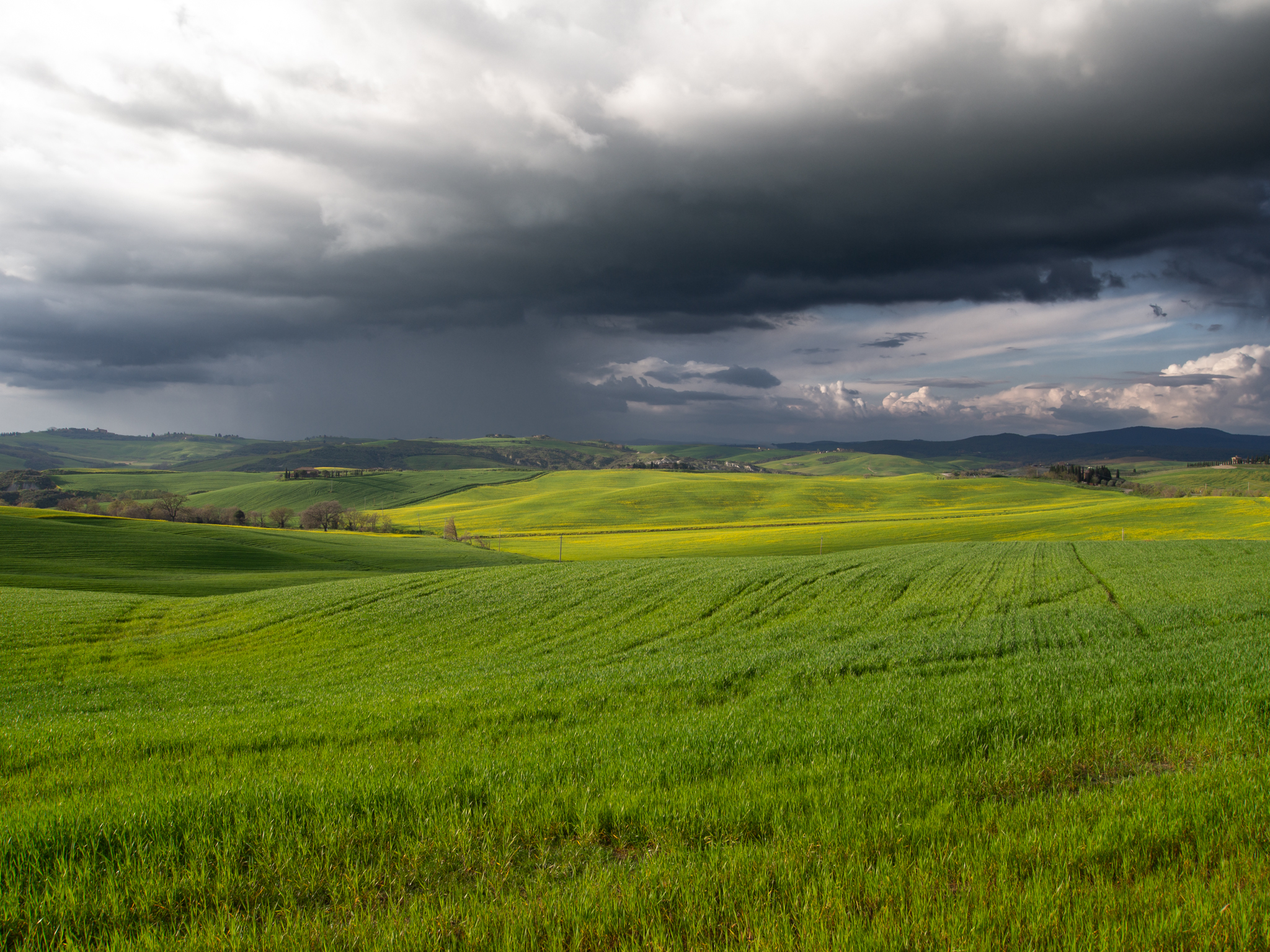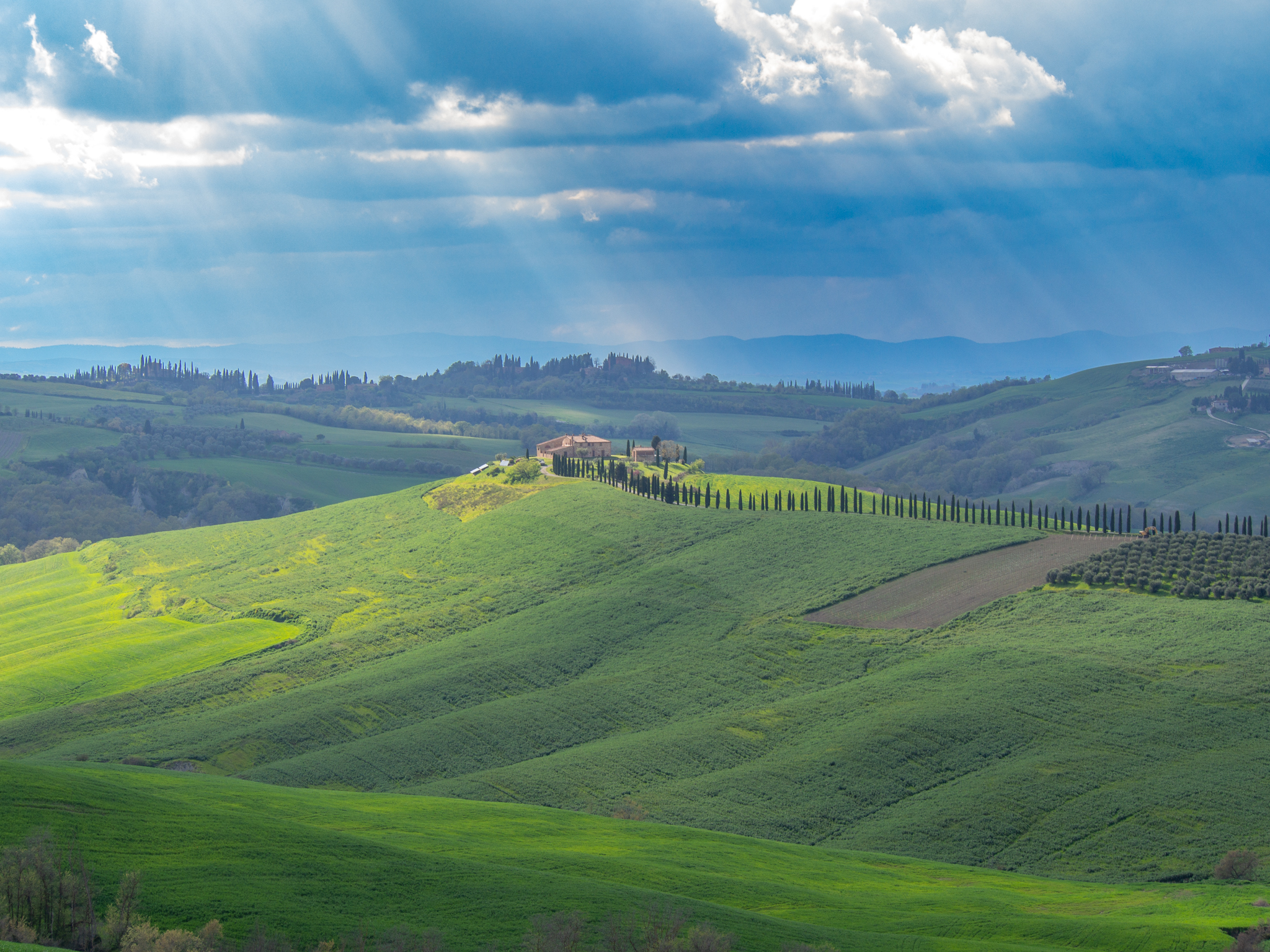 En sortant de Sienne, on part en direction du village d’Asciano, la route nous amène directement dans ce décor de collines couvertes de prairies aux couleurs intenses seulement interrompues par des fermes et quelques arbres. On est dans la région des Crete Senesi. En plus, de gros nuages annonciateurs de l’orage qui claque tous les après midi ajoutent de belles ombres.