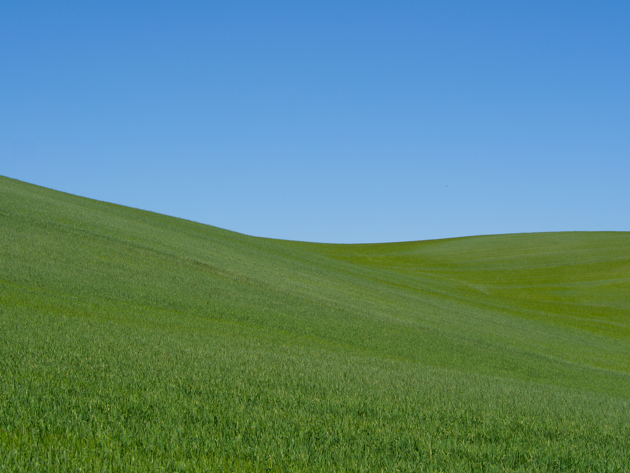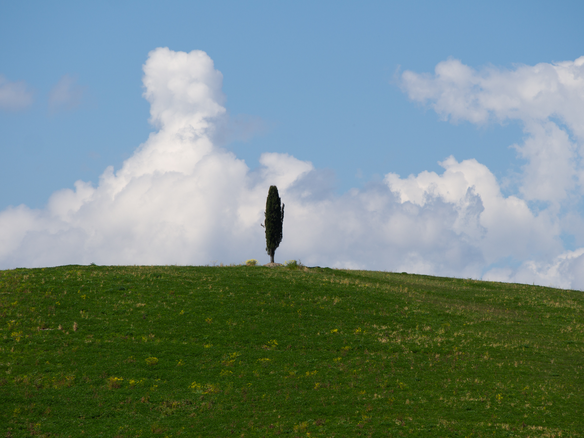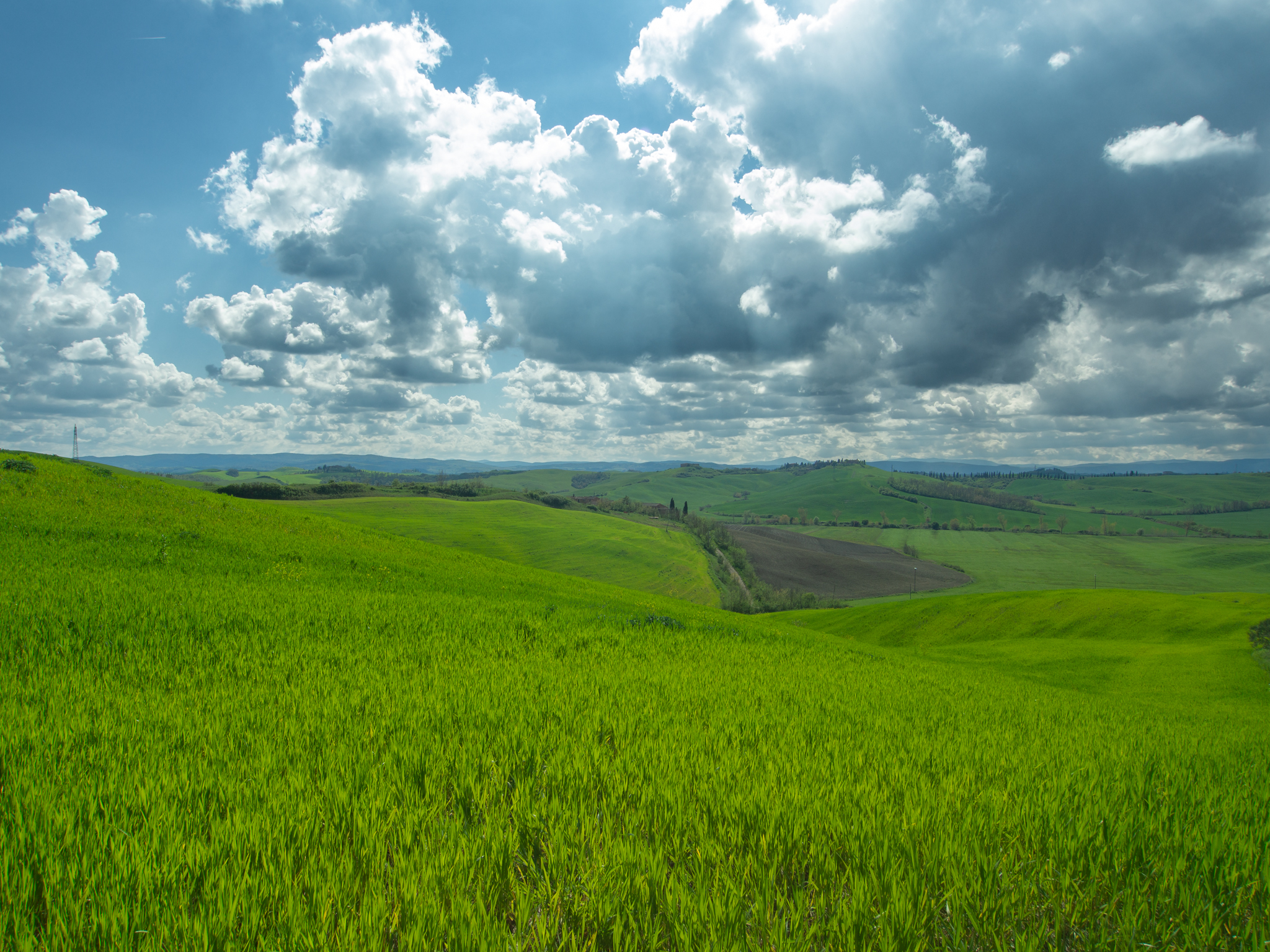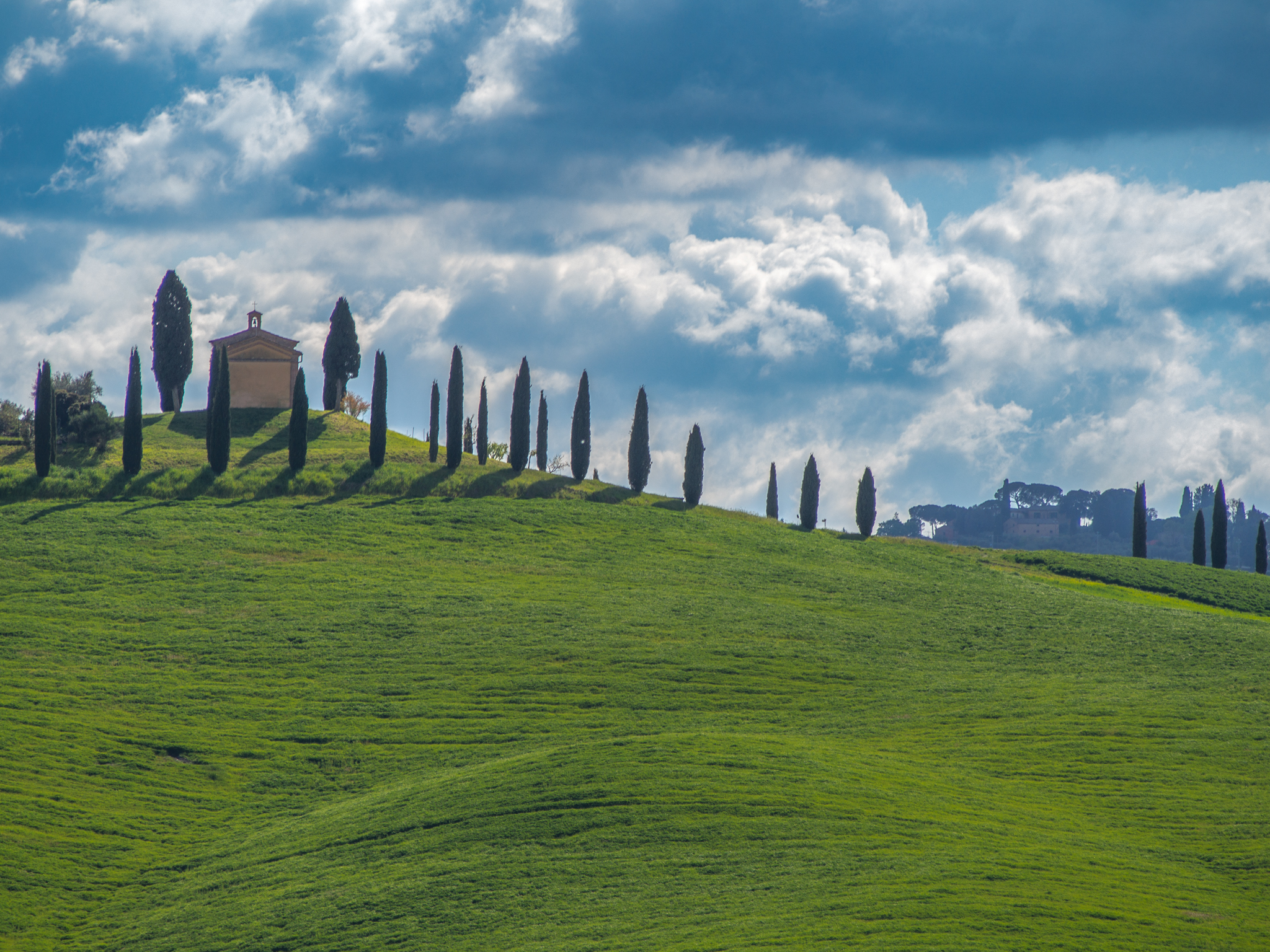 En sortant de Sienne, on part en direction du village d’Asciano, la route nous amène directement dans ce décor de collines couvertes de prairies aux couleurs intenses seulement interrompues par des fermes et quelques arbres. On est dans la région des Crete Senesi. En plus, de gros nuages annonciateurs de l’orage qui claque tous les après midi ajoutent de belles ombres.
