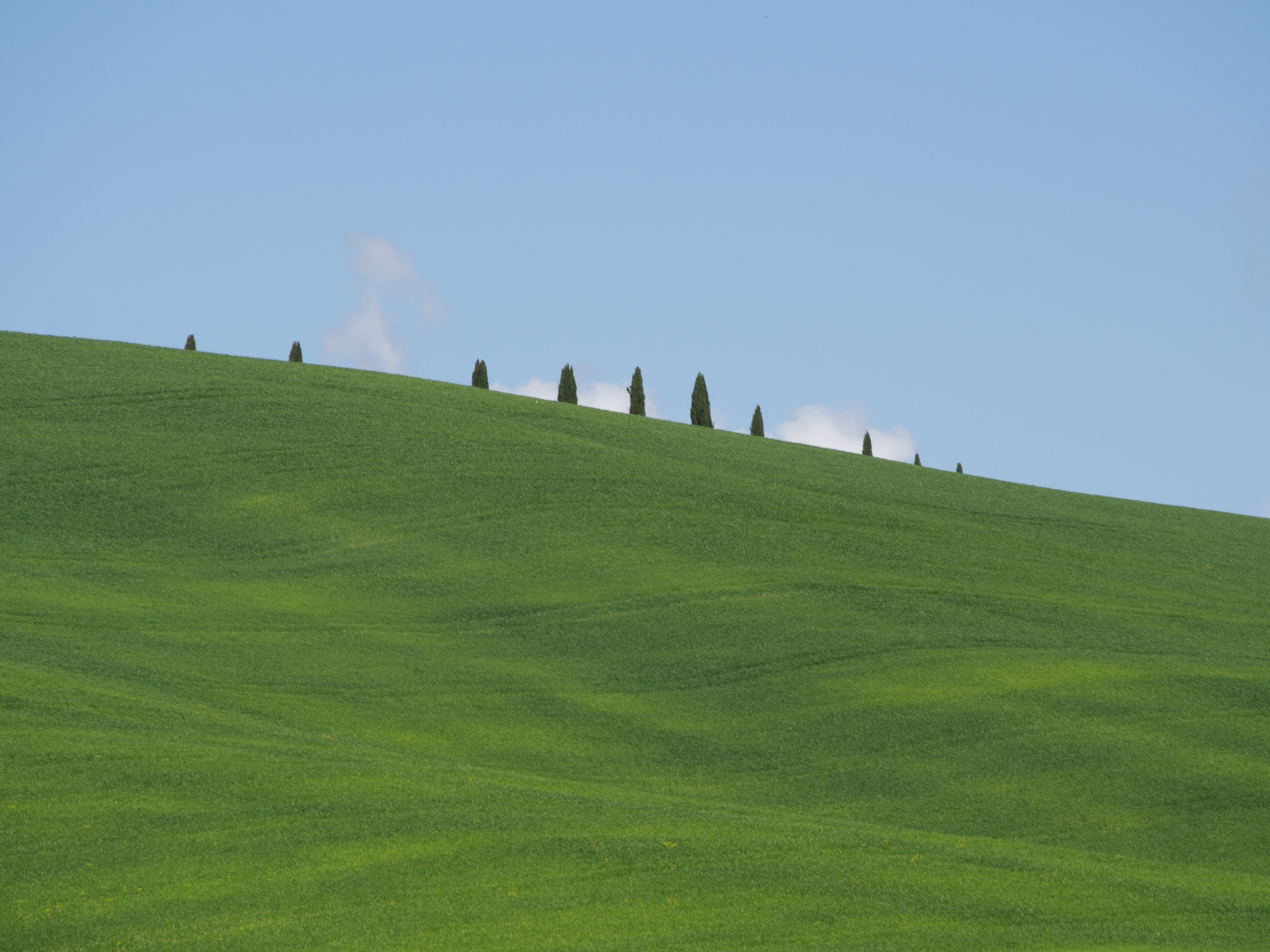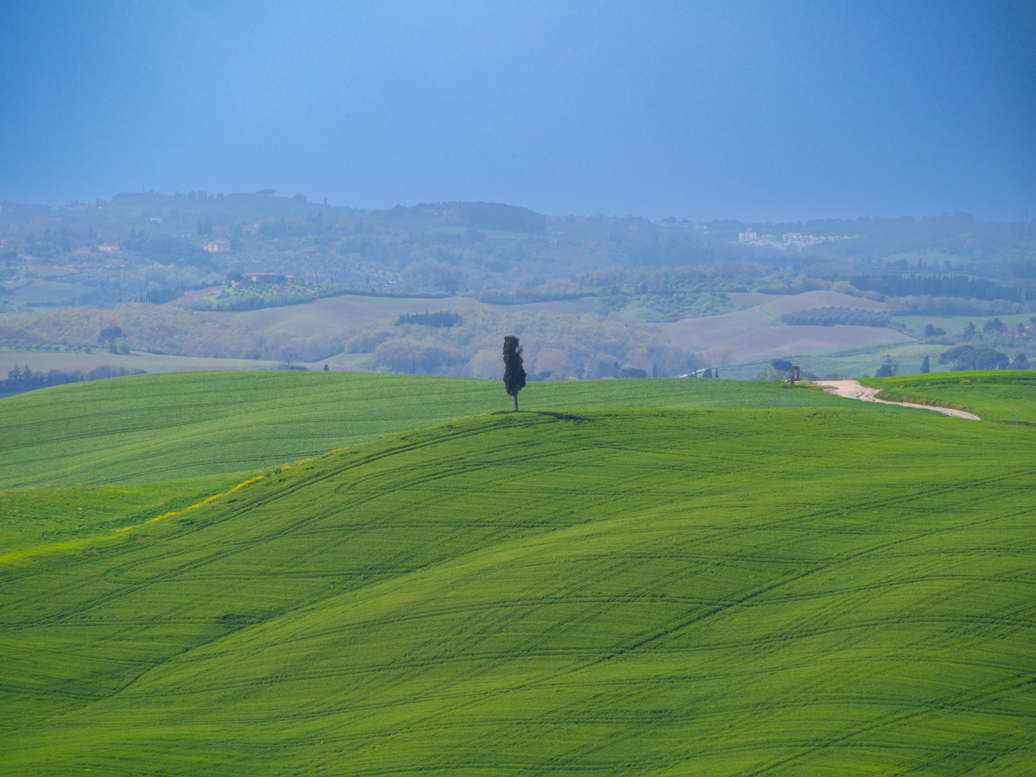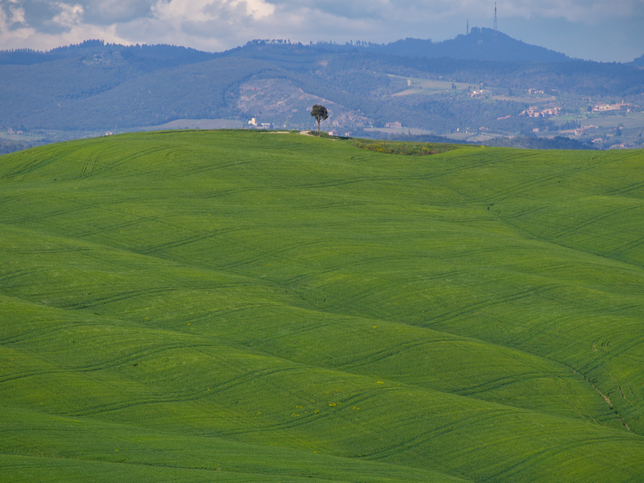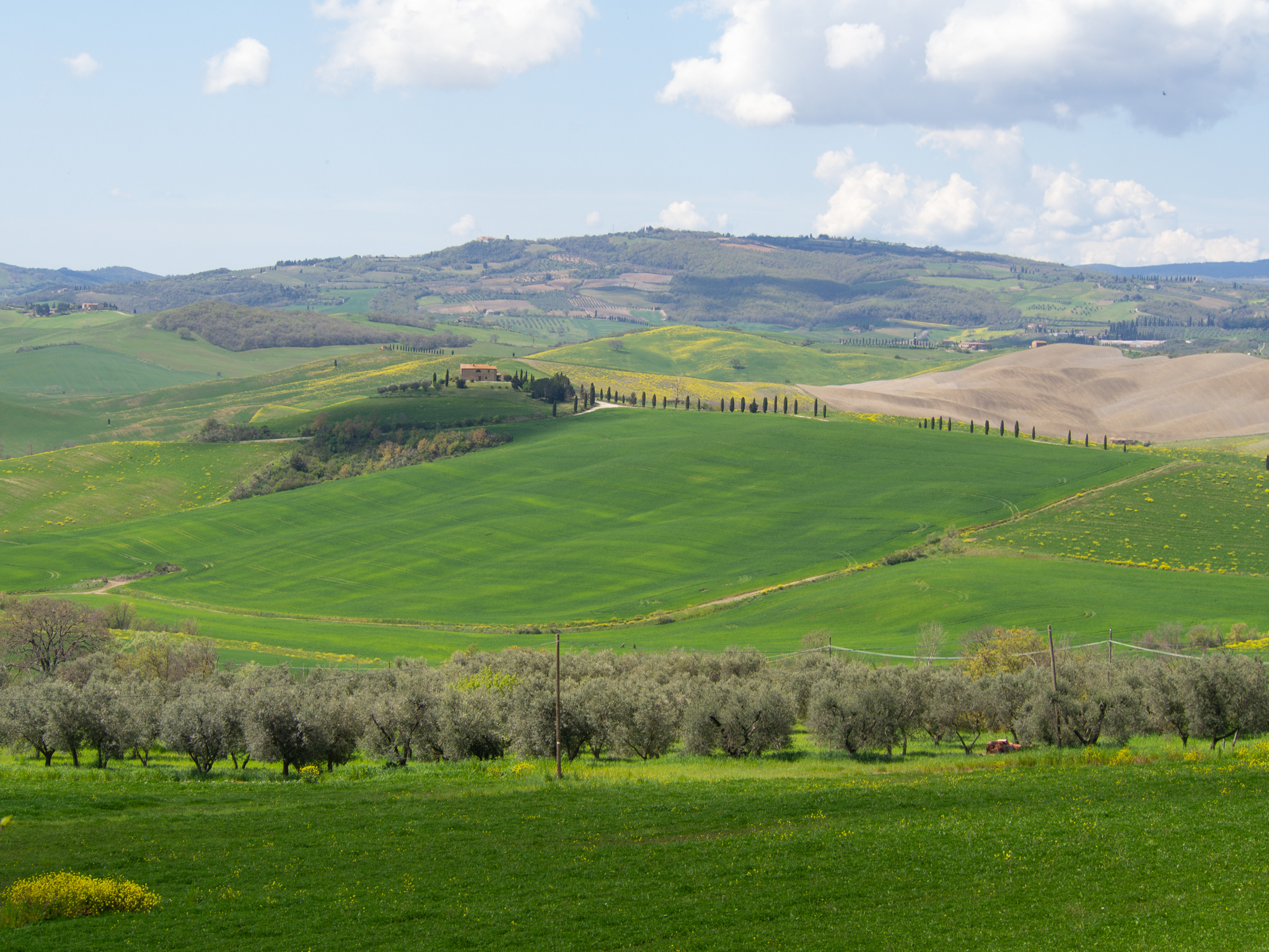 Les paysages révèlent l’absence d’arbres et de foret, ces terres agricoles ont été exploitées par les Hommes depuis l’Antiquité, une des raisons de la richesse de la Toscane. Avec l’absence d’arbres, les collines sont nues et révèlent toutes leurs rondeurs.