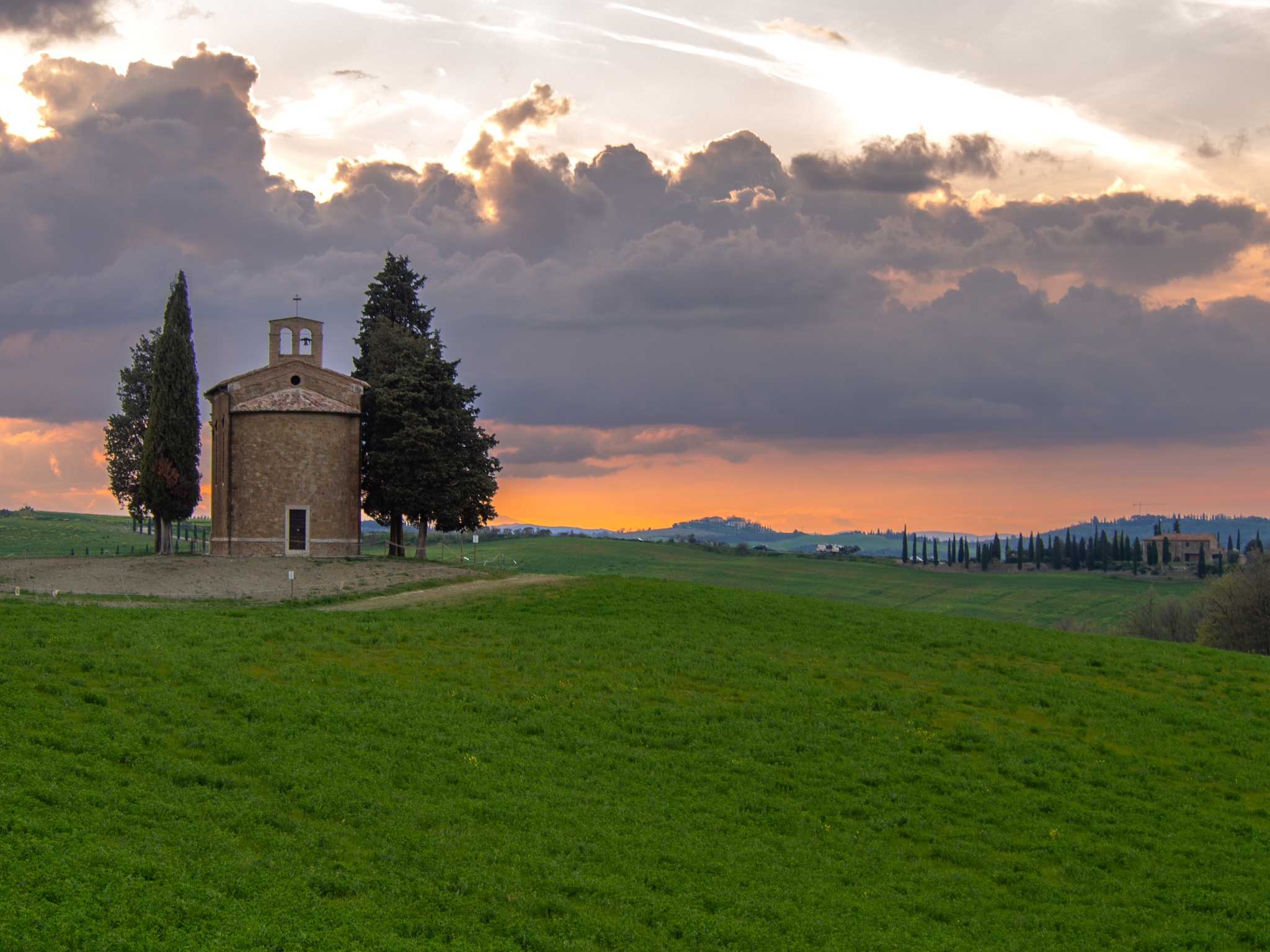 Avant d’aller diner à Pienza, on termine la journée par une dernière promenade jusqu’à la chapelle de Vitaleta. Une petite église plantée au milieu des collines et cernée de cyprès. On arrive au moment du coucher de soleil.