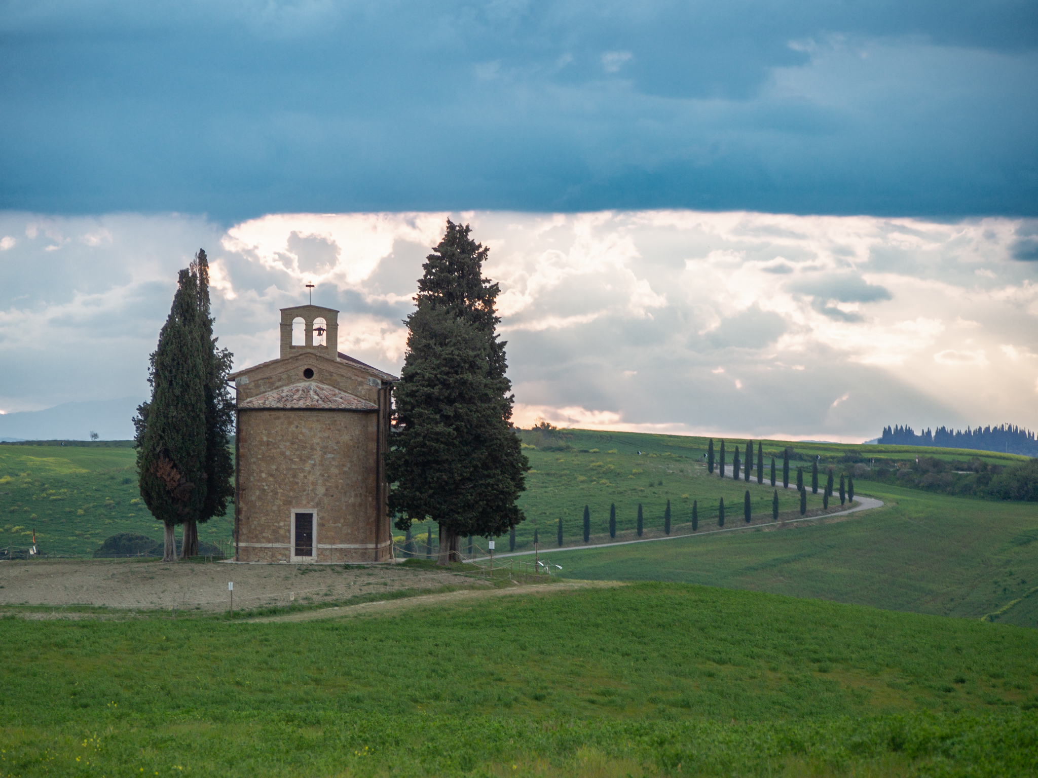 Alors que l’orage vient nous tomber sur la tête, c’est le moment de partir pour notre prochaine étape. Nous roulons en direction de San Quirico d’Orcia alors que l’orage partait dans une autre direction. Le temps est terriblement orageux cette semaine mais son passage laisse derrière son passage des couleurs magnifiques et un temps d’une grande clarté.