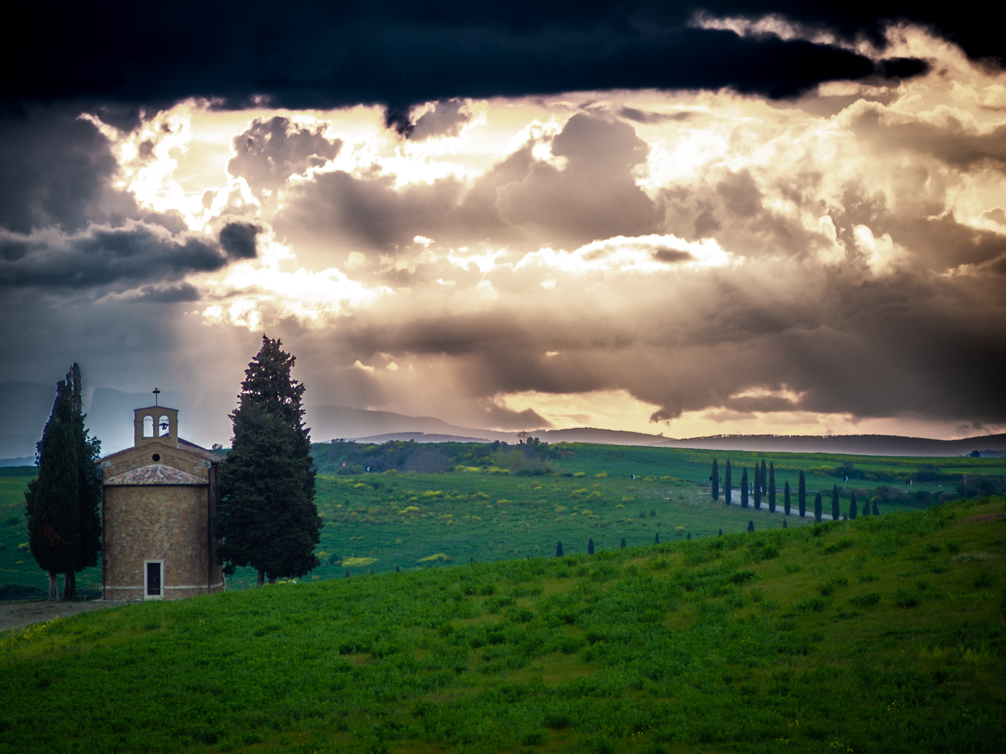 Un coucher de soleil malheureusement bouché par les nuages, mais qui avec un peu de retouches donne une image originale et torturée de la Toscane.