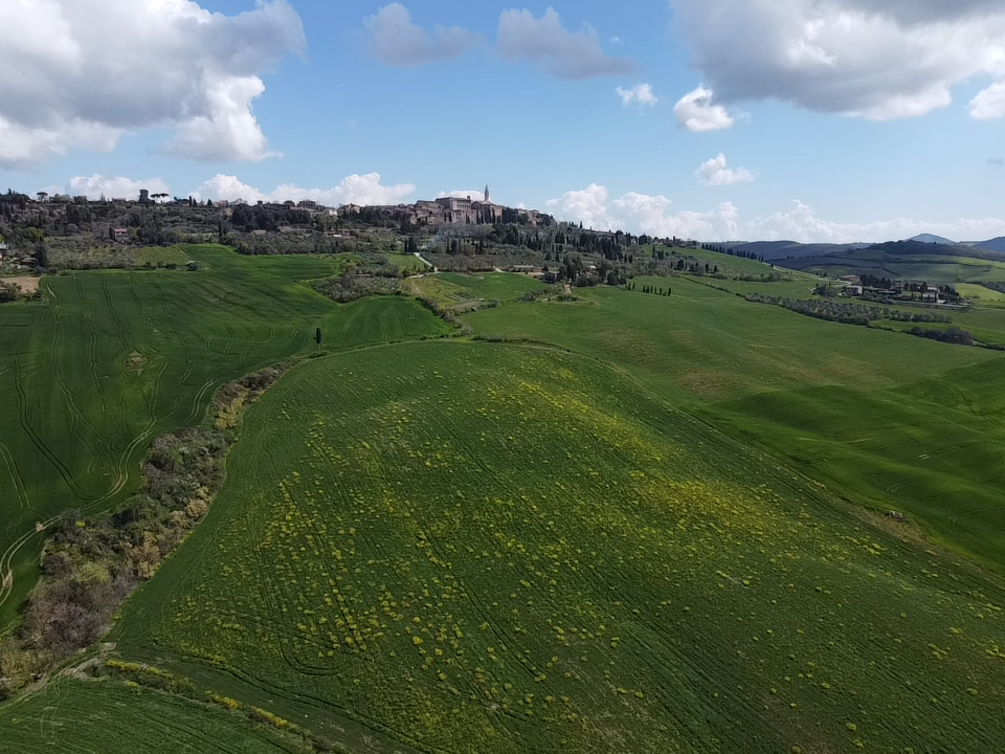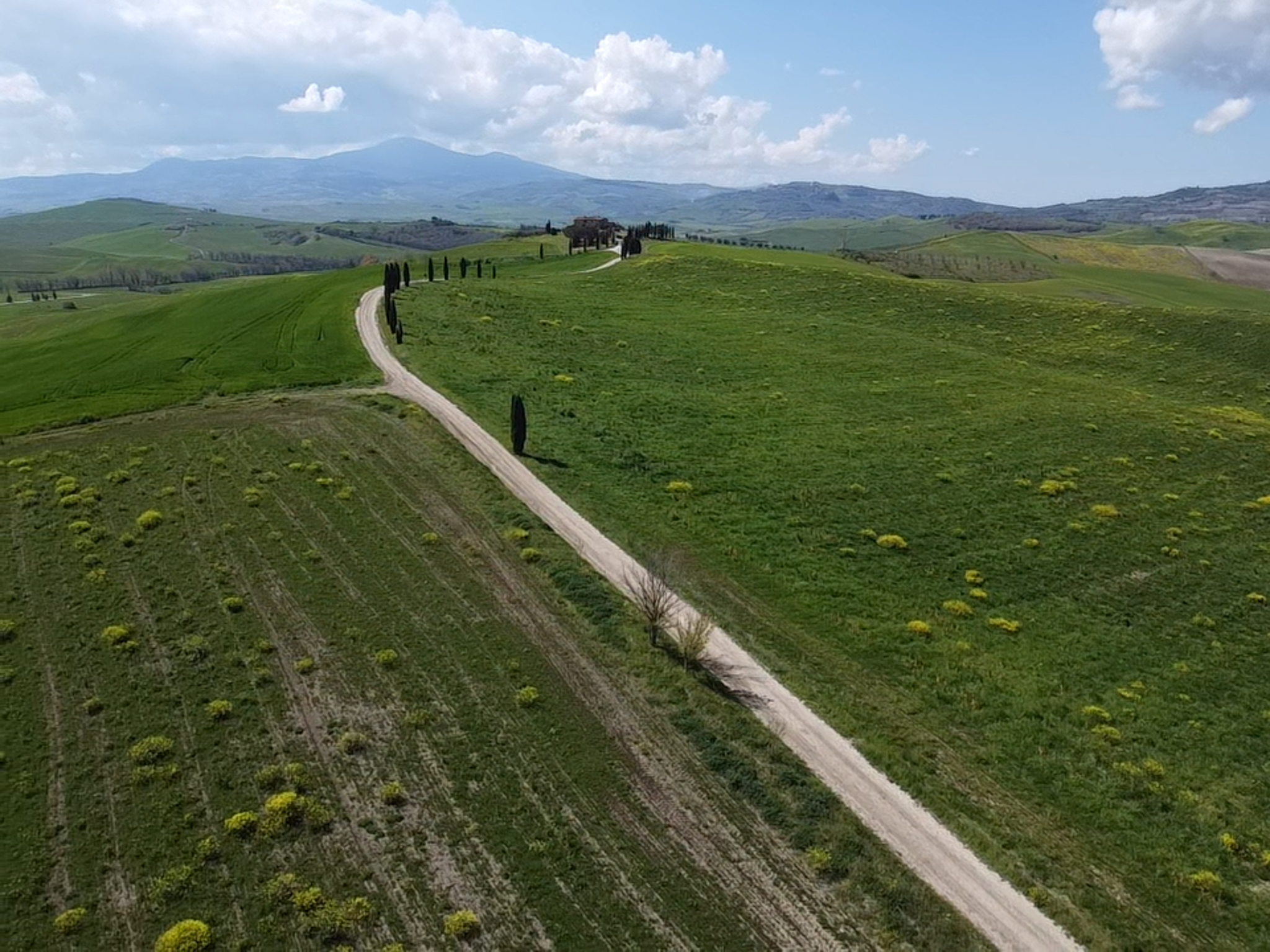 Après le petit déjeuner, le drone décolle depuis le toit de la voiture pour avoir un autre point de vue, il survole le chemin du film avec ces beaux cyprès et le village de Pienza.