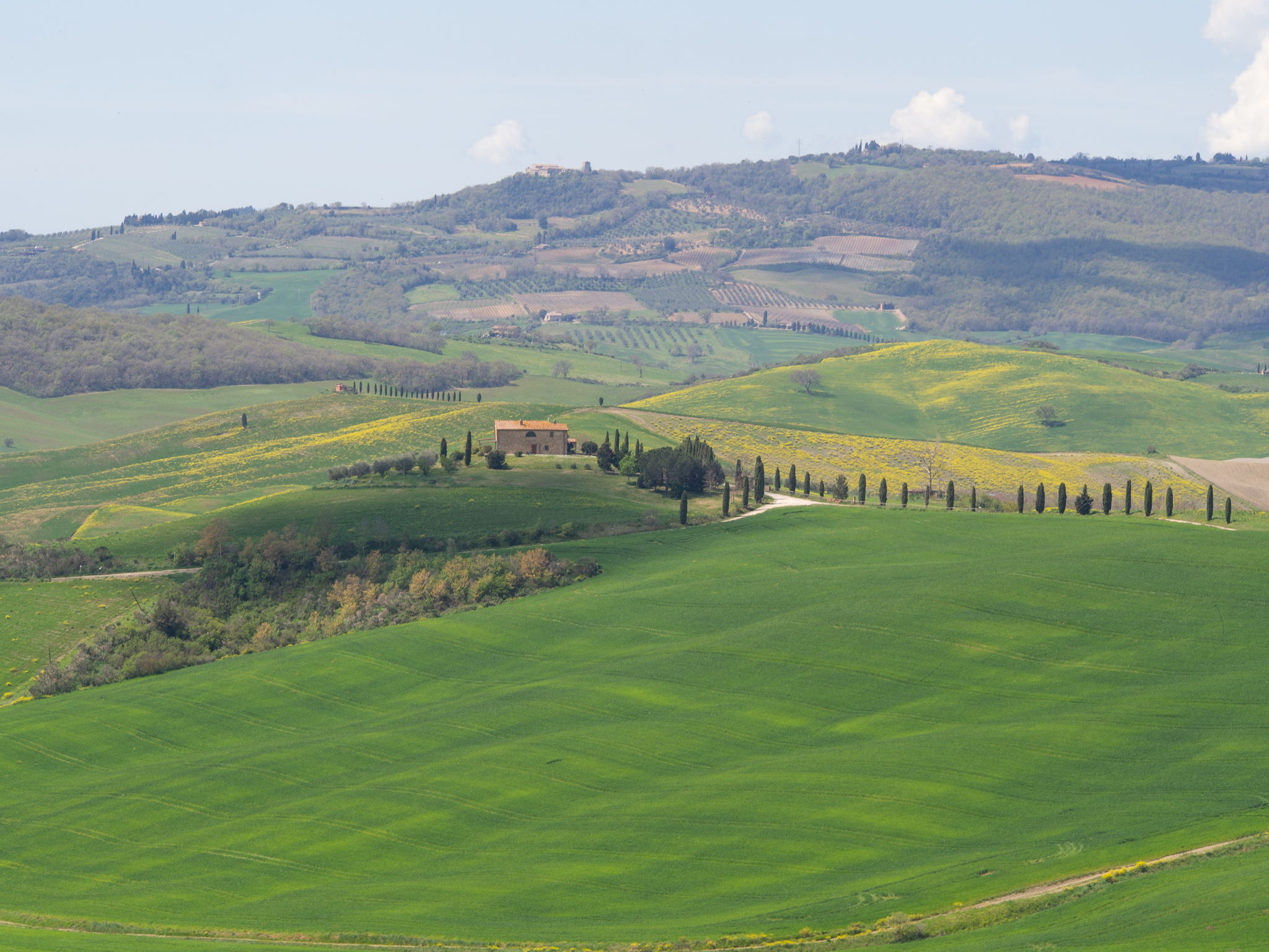 Après le village d’Asciano que l’on traverse directement sans s’arrêter alors qu’il a l’air très mignon, on continue la route en direction de Val d’Asso. C’est dans cette zone des Crete Senesi que l’on peut découvrir les paysages les plus emblématiques de la région. Ici les fermes rénovées en hébergement de campagne, ou agriturismo, fleurissent, elles offrent un cadre enchanteur dans la campagne Siennoise. Les allées sont plantées de cyprès qui donnent un air luxueux et classe à ces propriétés.