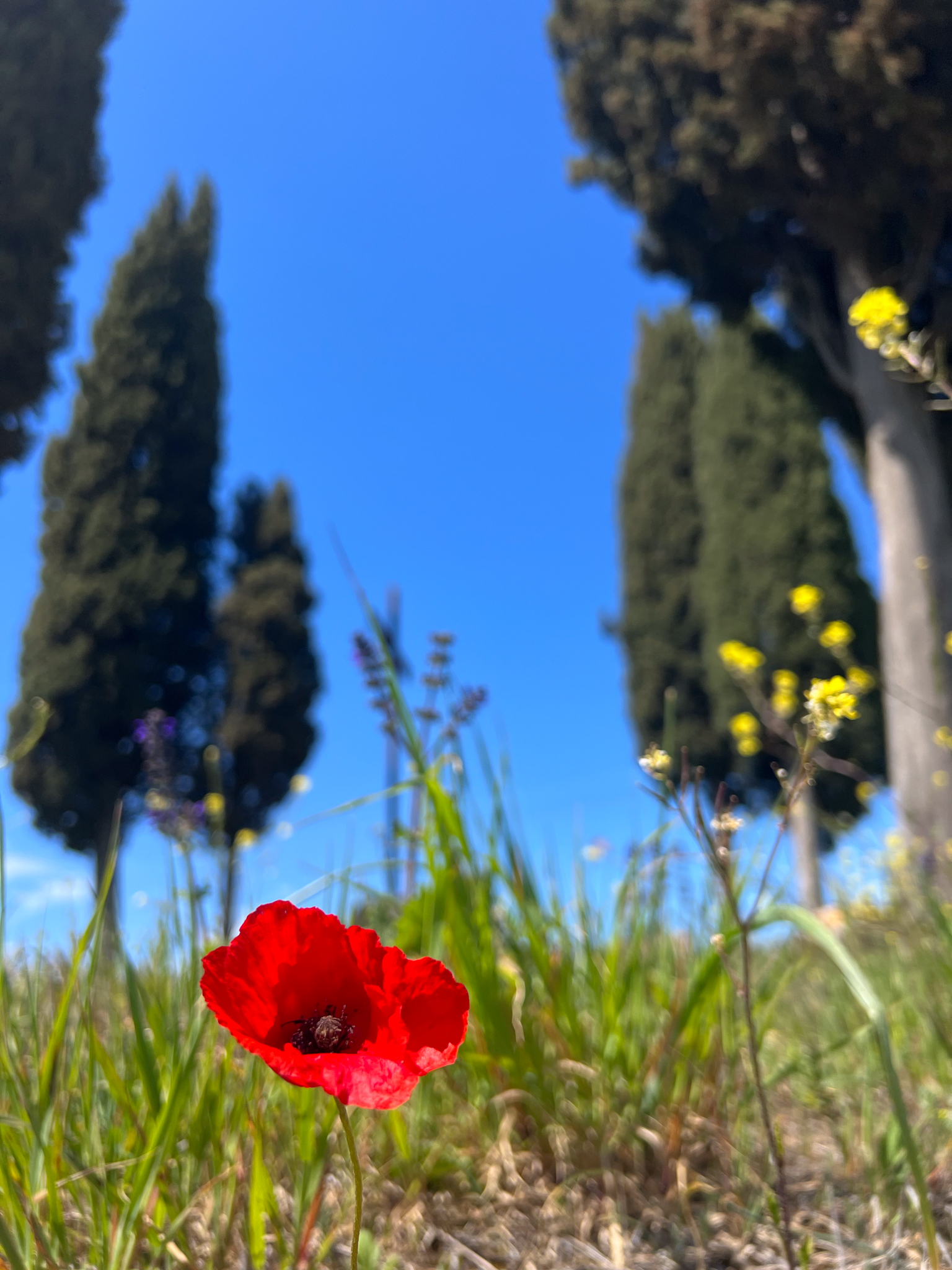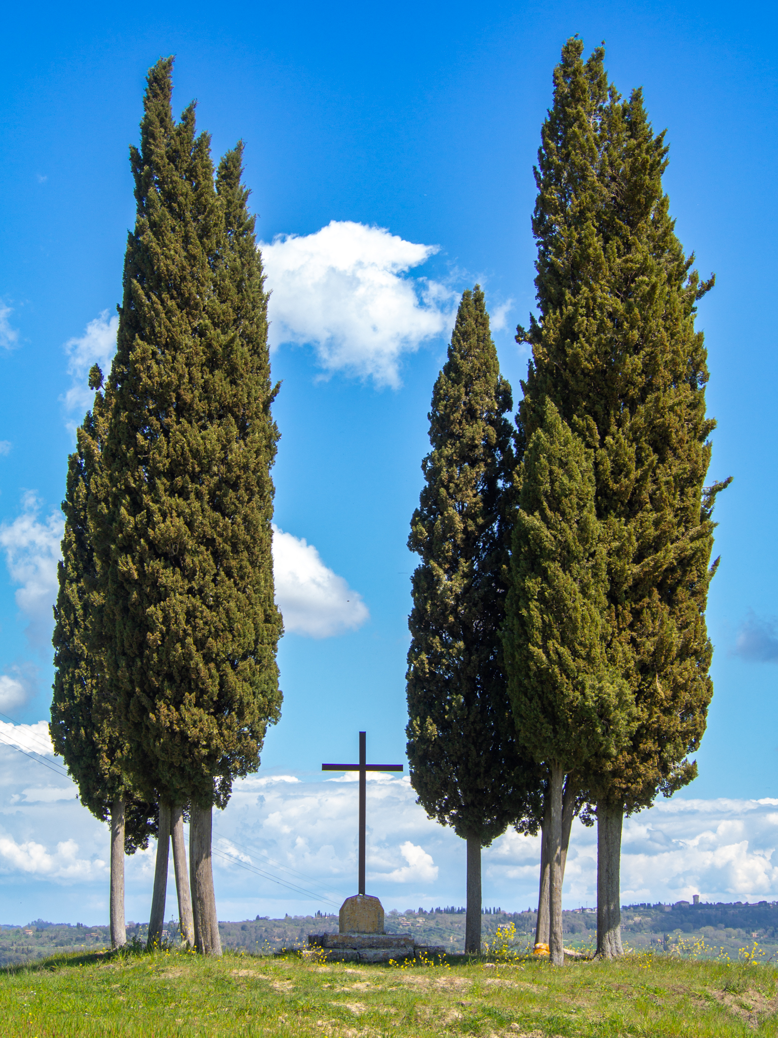 On a envie de sortir de la voiture après cette deuxième demi journée à rouler le long des routes sinueuses de la région. On décide de trouver un endroit pour s’installer et profiter d’une vue panoramique avant de partir pour notre prochaine destination. On retourne dans les alentours de San Quirico d’Orcia. A proximité de la vue sur la ferme du film Gladiator, dans les champs de blé, se trouve une croix entourée de hauts cyprès. On prend nos affaires et on fait une pause contemplative, la vue est parfaite.