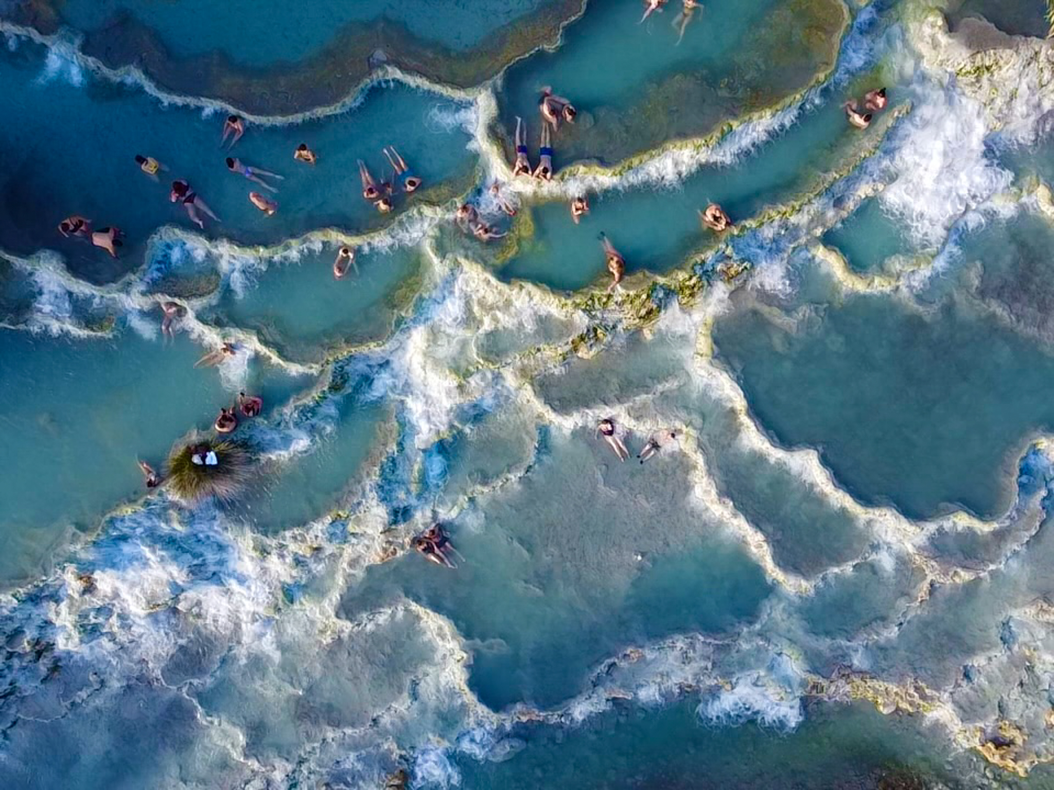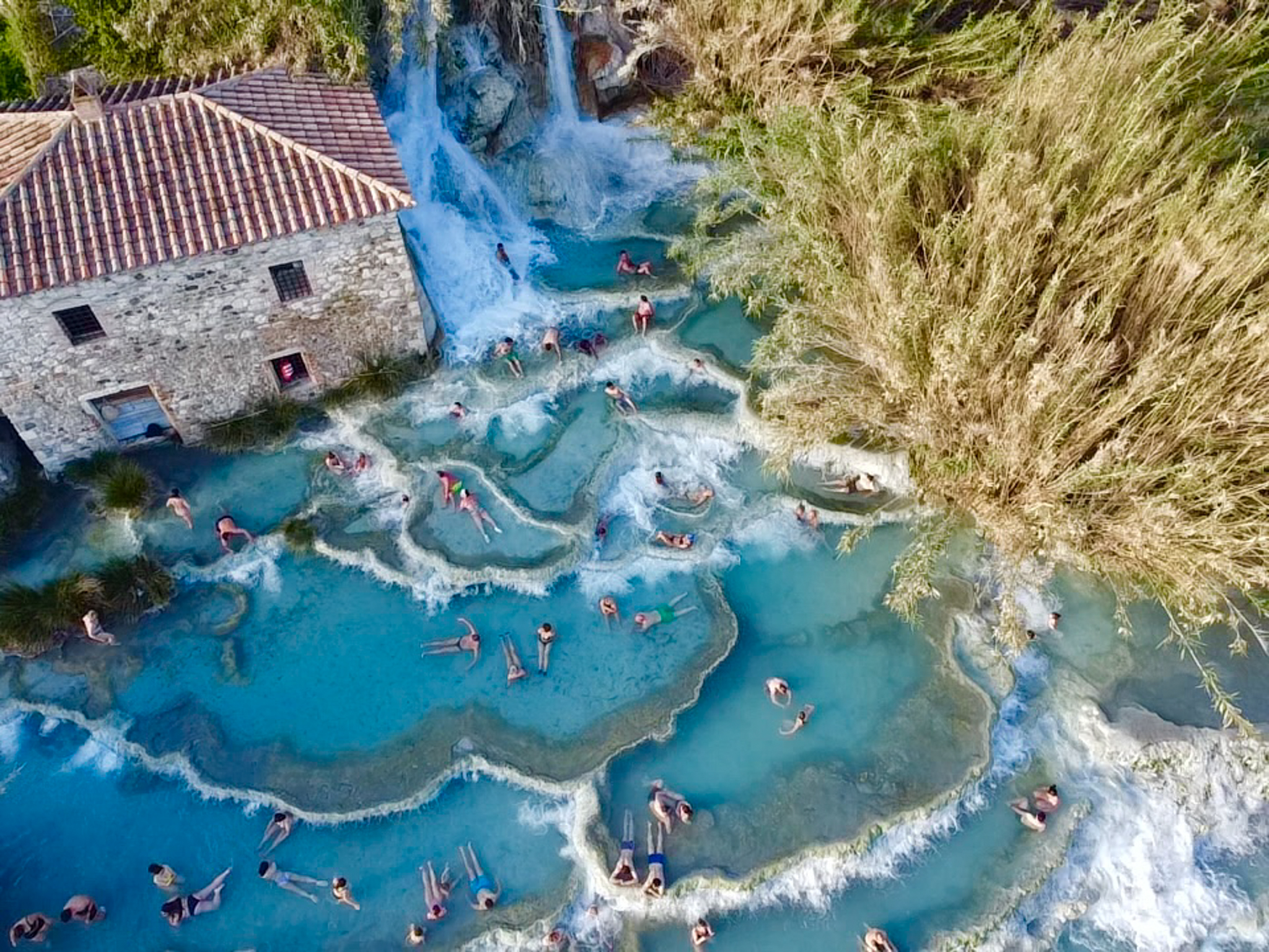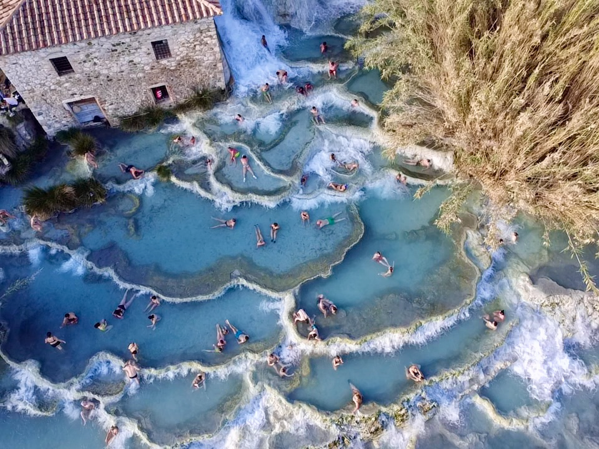Pour la suite du voyage, avant de remonter vers la France, on décide de pousser encore un peu plus loin jusqu’aux termes de Saturnia. Ce n’est pas la porte à côté depuis le Val D’Orcia, c’est dans la région de Grossetto tout au Sud de la Toscane mais on se dit que c’est cela aussi l’esprit d’un Road Trip. La route serpente toujours dans ces montagnes toscane mais on a quitté les belles collines nues des Crete Senesi, ce n’est pas aussi grandiose mais toujours très beau. On arrive en fin de journée aux termes. En journée, il y a énormément de monde, c’est pour cela que l’on avait prévu d’y aller à cette heure tardive. Ces termes naturels sont connus depuis l’Antiquité, il y a de nombreuses piscines naturelles à l’eau transparente.