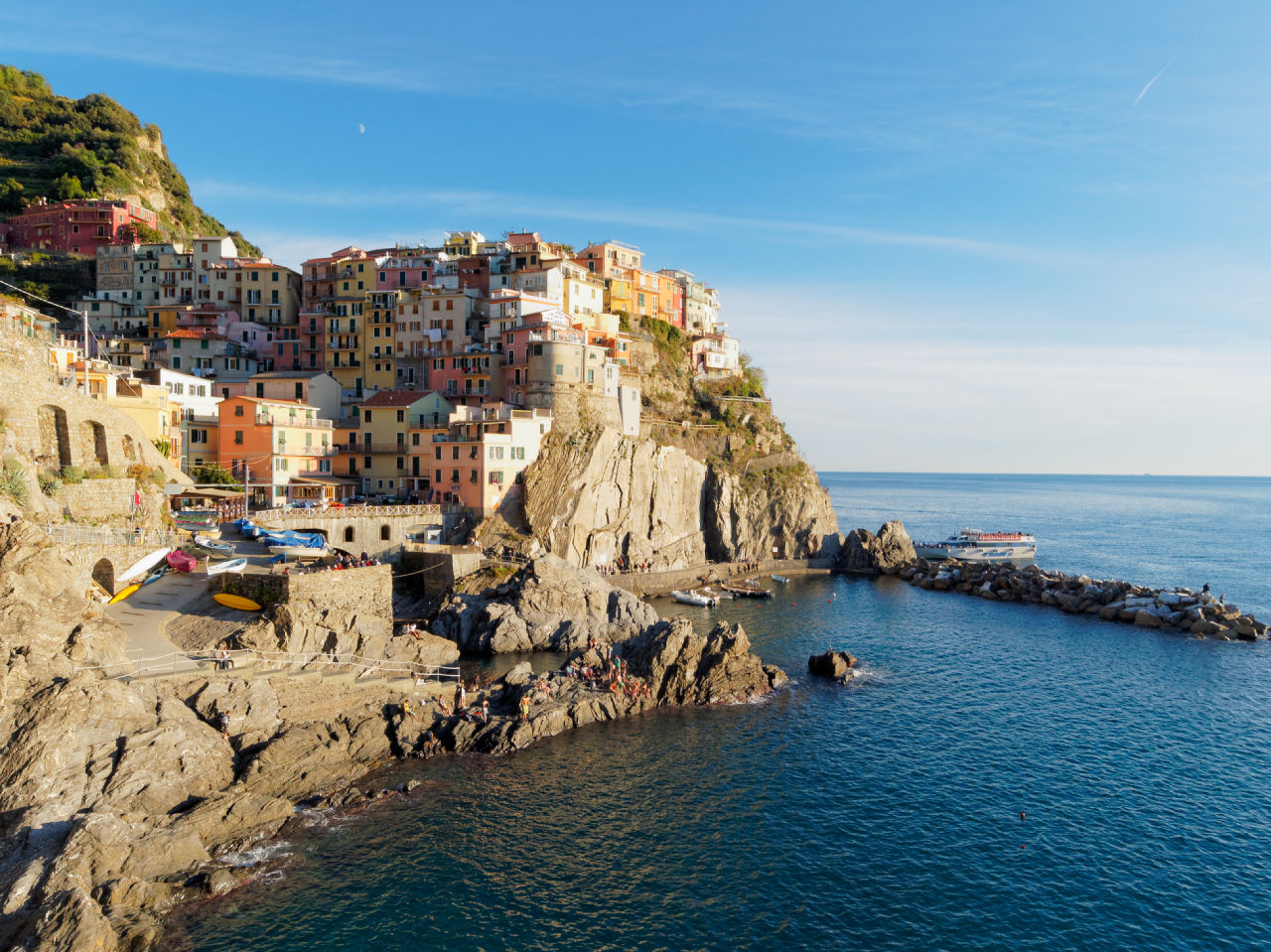 Manarola est un des plus petits villages des Cinque Terre, situé à proximité de Riomaggiore, la disposition des maisons construites autour d'une falaise en fer à cheval autour de son petit port est parmi les plus photogéniques du parc naturel.