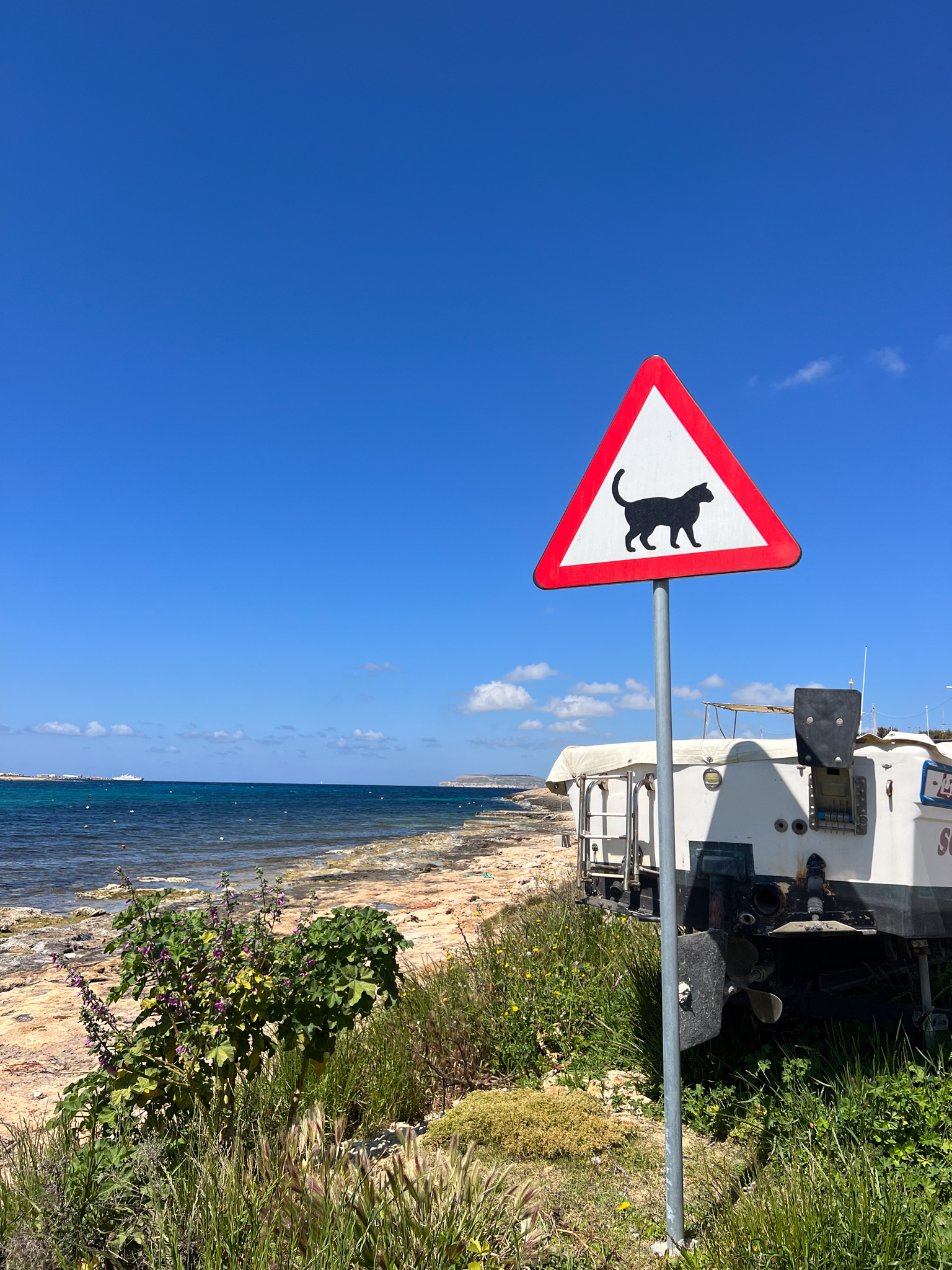 Amusant ici les panneaux d’avertissement de danger pour animaux sauvages sont différents de ce que l’on a l’habitude de voir par chez nous, ici attention aux chats et aux hérissons.