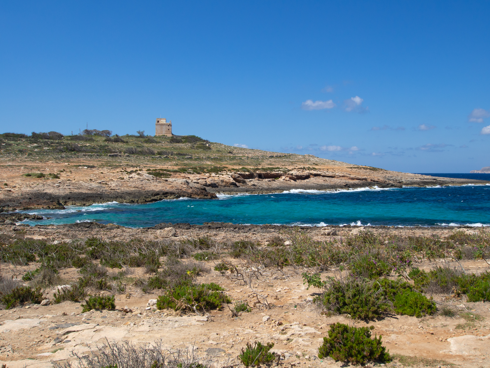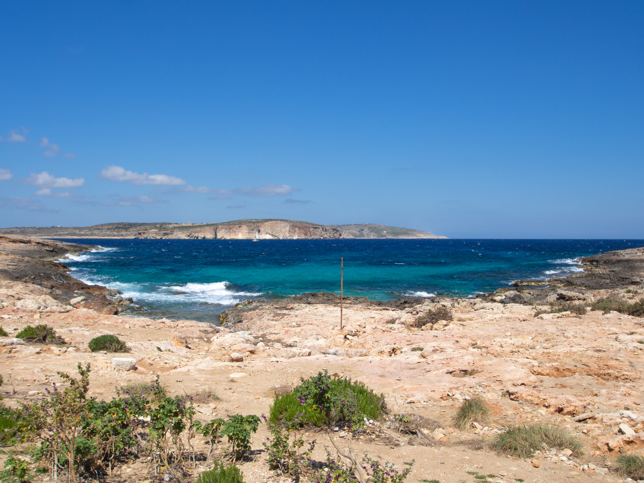 On arrive au niveau de la plage de Bajja tal-Qroll où l’on gare la voiture, on est vraiment au bout de l’île ici, on ne peut pas rouler plus en avant. On part à la découverte d’une plage sauvage à l’eau très bleue mais tellement agitée par le vent qui souffle très fort.