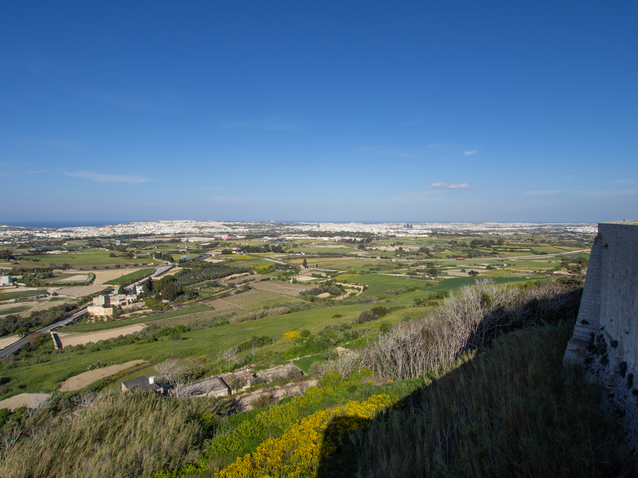 Tout au bout de la ville. On arrive à un point de vue sur les fortifications qui domine toute l’île, rien n’obstrue le regard qui porte jusqu’à la ligne d’horizon. On peut voir la mer entourer les terres. On voit la ville de La Valette et son étalement urbain impressionnant. Les domes des nombreuses églises au dessus des immeubles.