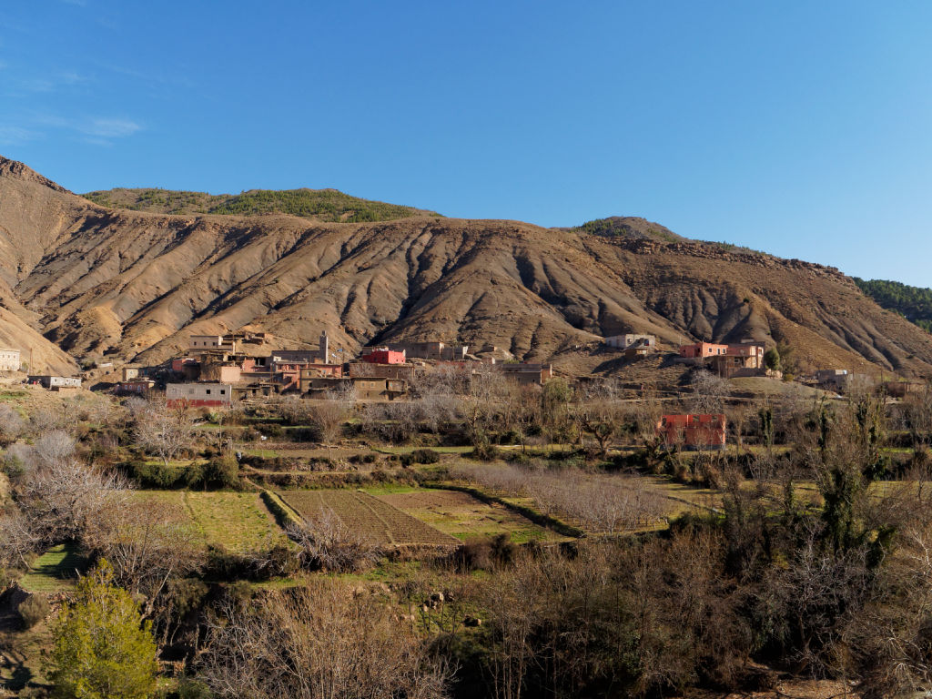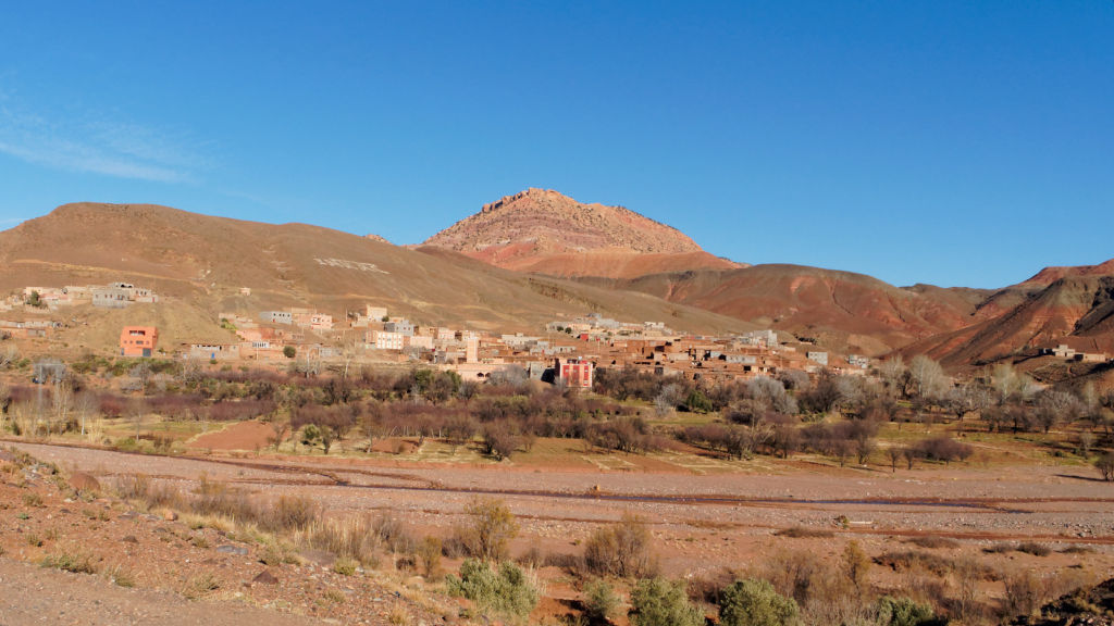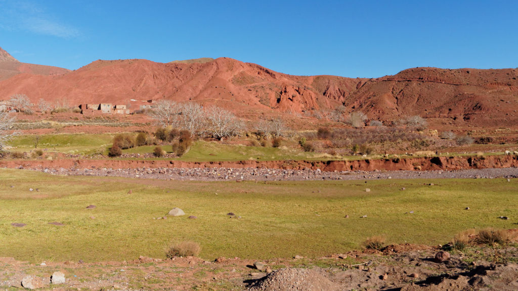 La descente vers Ouarzazate se fait dans un paysage de moins en moins montagnard, on suit une vallée ou les abords de la rivière sont cultivés, avec des petits villages en bordure de route.