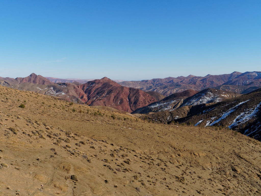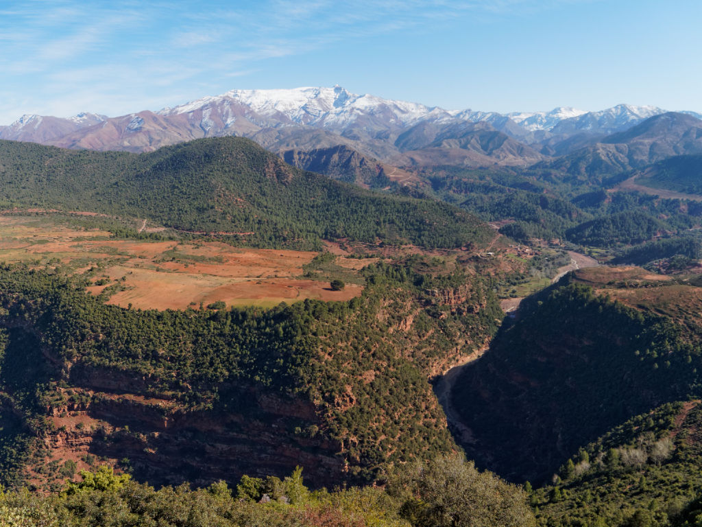 Je branche mon GPS et sort non sans mal de Marrakech, il y a beaucoup de circulation et je n’avais pas compris qu’il fallait bien passer sous les murailles pour entrer dans la ville pour la traverser et non pas essayer de la contourner. Puis rapidement on arrive dans un paysage de montagne semi aride. La route est en très bon état. Je ne peux m’empêcher de m’arrêter de temps en temps pour prendre quelques photos du paysage grandiose.