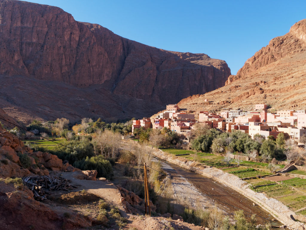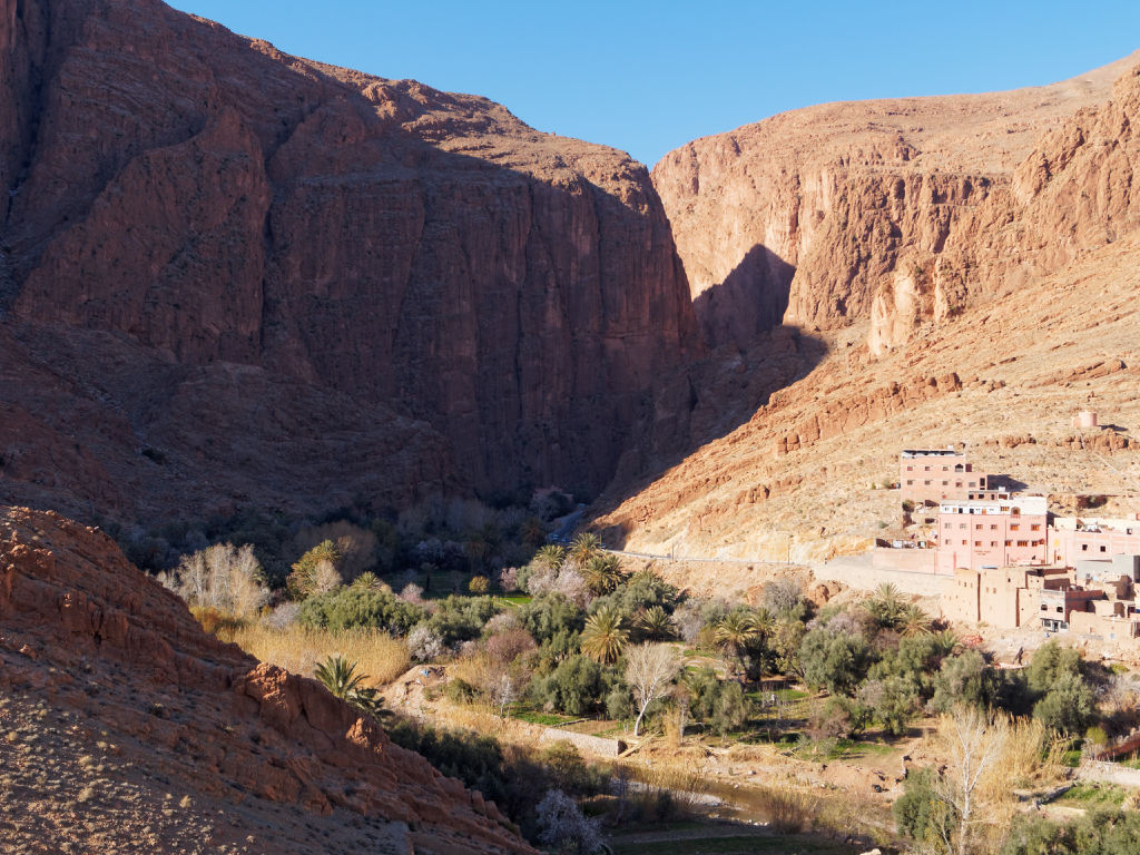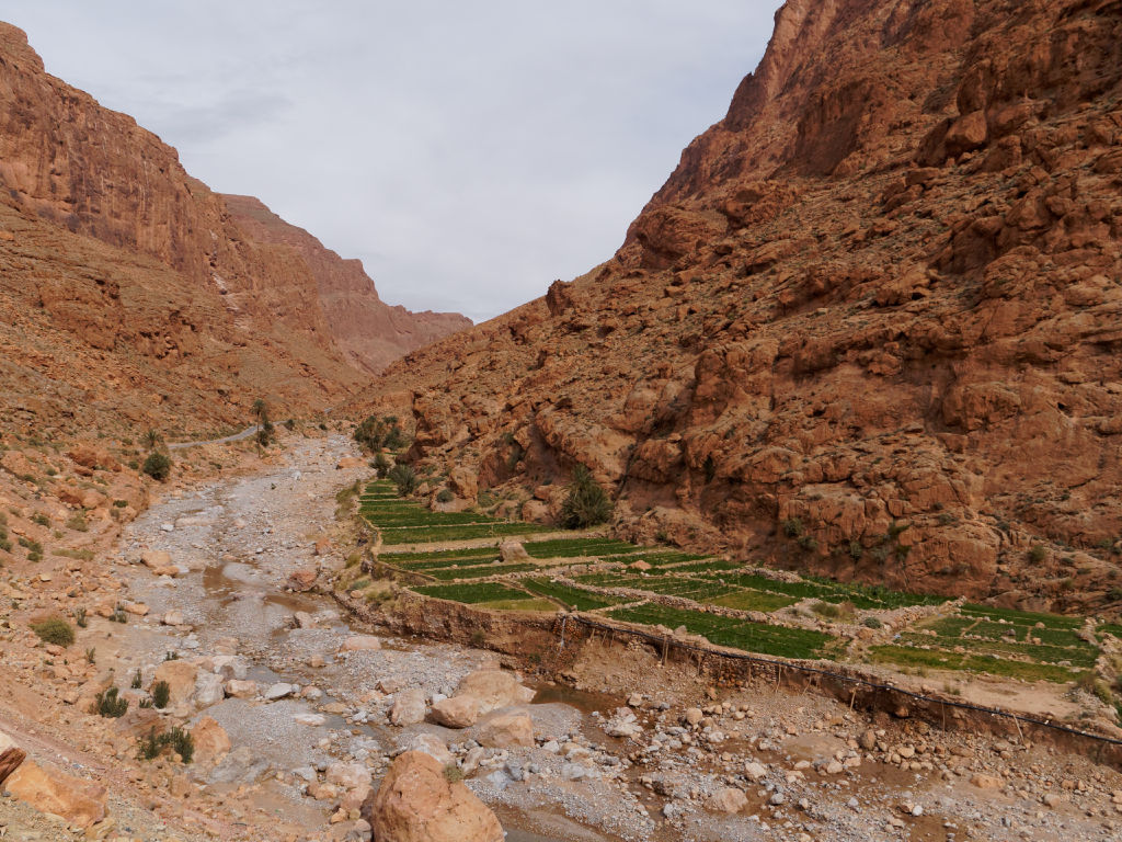 L’Oued a ici creusé profondément dans la roche pour se frayer un chemin tout en courbe, au point le plus profond, il y a 300m de falaise que les passionnés d’escalade ont trouvé comme terrain de jeu exigeant (un villageois m'a dit qu'un français a ouvert au village devant les gorges un magasin de matériel d'escalade).