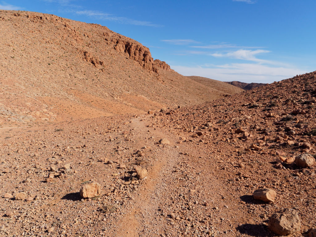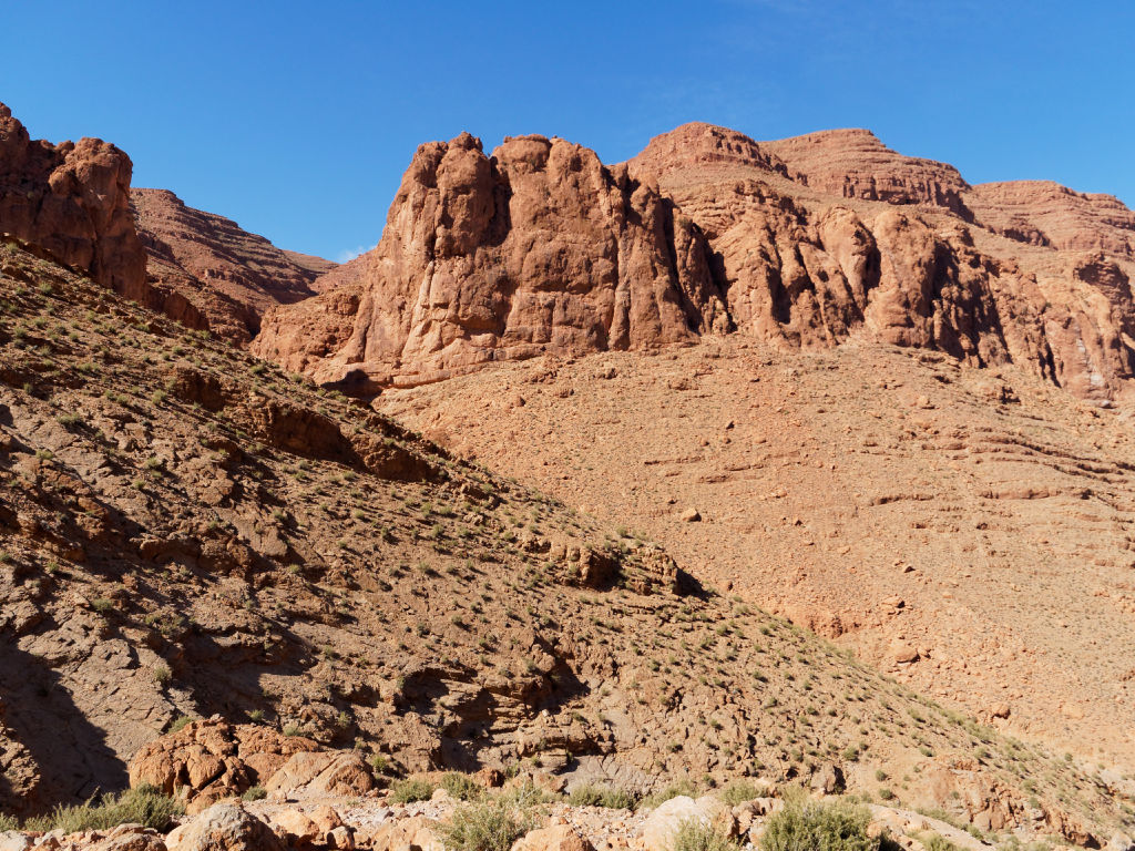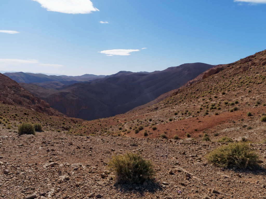 Comme la veille, je prends la route qui remonte le Dades, puis après Boulmanes, je continue tout droit direction Tinghir. Le paysage sur le bord de route est lunaire, les montagnes au loin comme souvent dans la région arborent différentes bandes de teinte pastel. Au Sud, le massif du Djebel Saghro. Pas un arbre dans le coin, pas pratique si on a une envie pressante de faire pipi ?