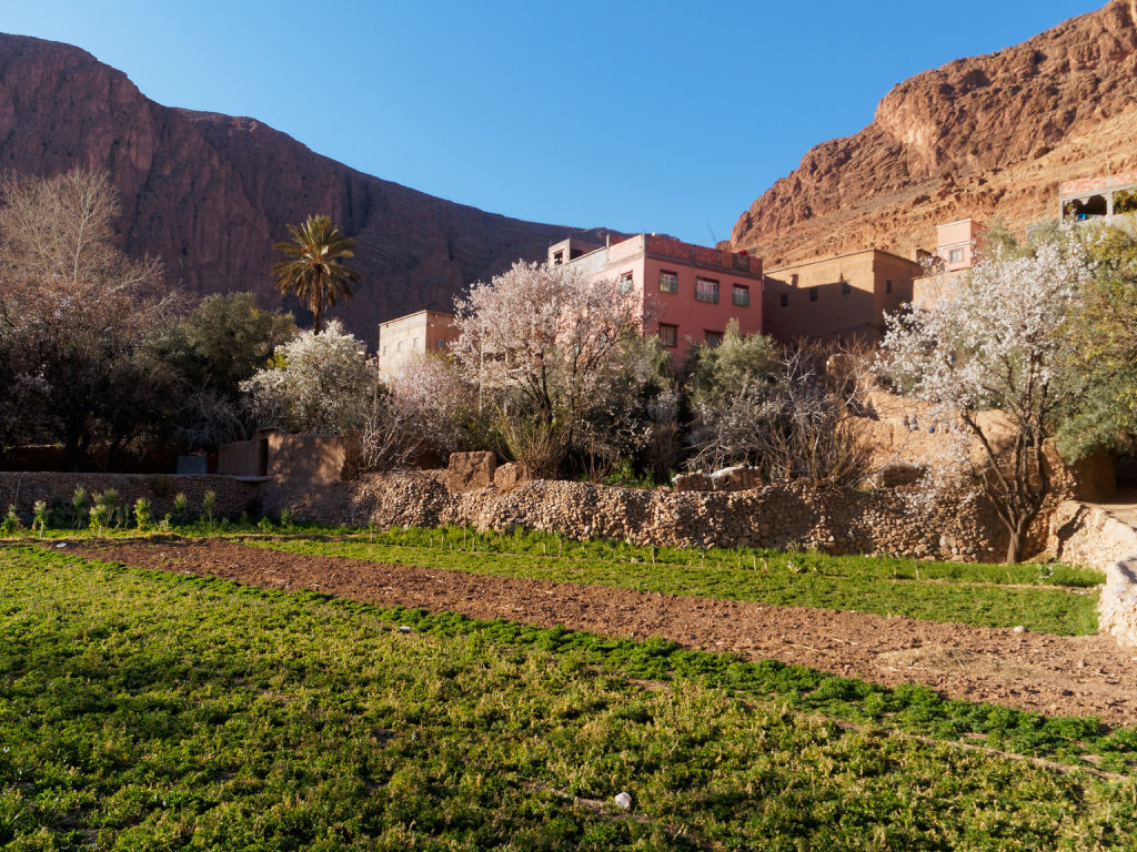 Au contraire, le chemin bifurque vers le Sud afin de contourner les gorges du Todhra et revenir vers le village au pied des gorges, au loin la palmeraie de Tinghir.