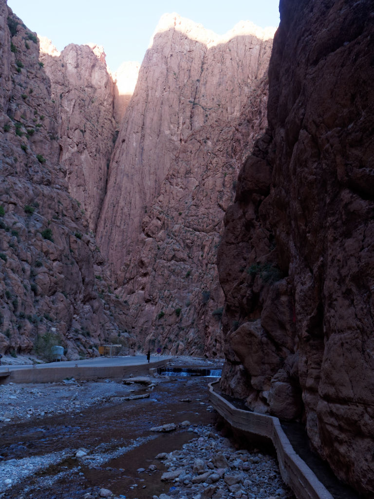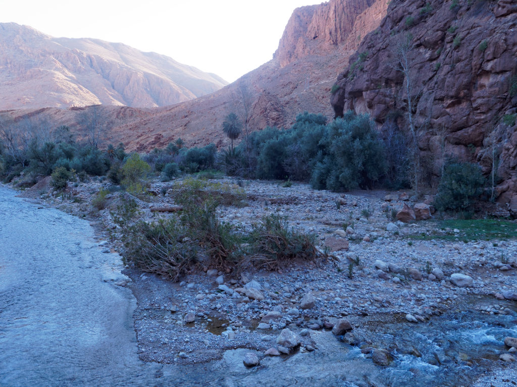 En contrebas il y a un pont de bois, ce qui me ramène au pied des gorges du Todhra. La boucle m’a pris un peu plus de 2h30 jusqu’à la route, puis encore 1h pour remonter tranquillement la route vers la voiture garée de l’autre côté tout en discutant avec un villageois qui se promenait après sa journée de travail. On retraverse ensemble les gorges qui ne sont plus directement éclairées.