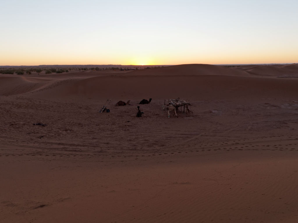 Le sable est froid, je garde mes chaussures, mais ca m’empeche d’avancer très vite car elles se remplissent vite de sable jusqu’à ce qu’il n’y ait plus d’espace disponible entre mon pied et la chaussure. Le sable se tasse et à la fin on a l’impression d’avoir le pied compressé, en plus de peser deux fois son poids. Je m’arrête donc à une dune plus petite juste avant que le soleil pointe son premier rayon.