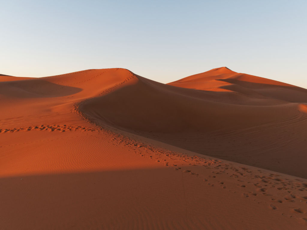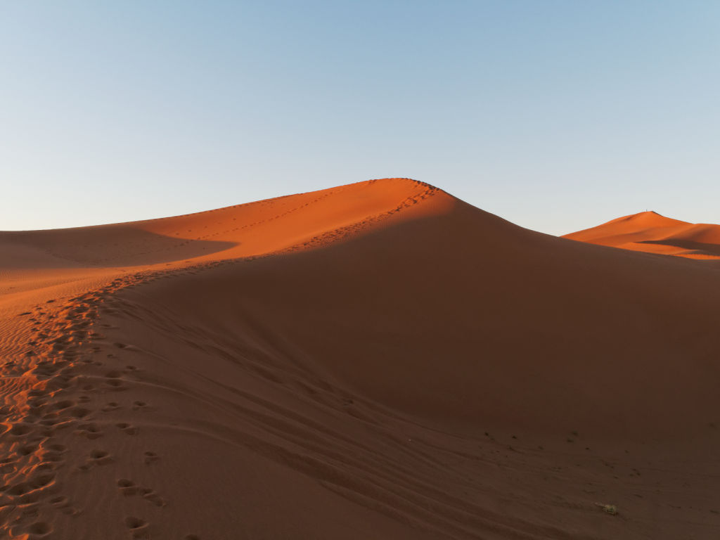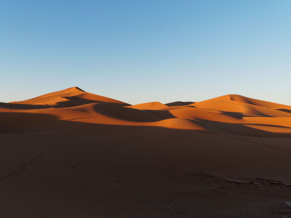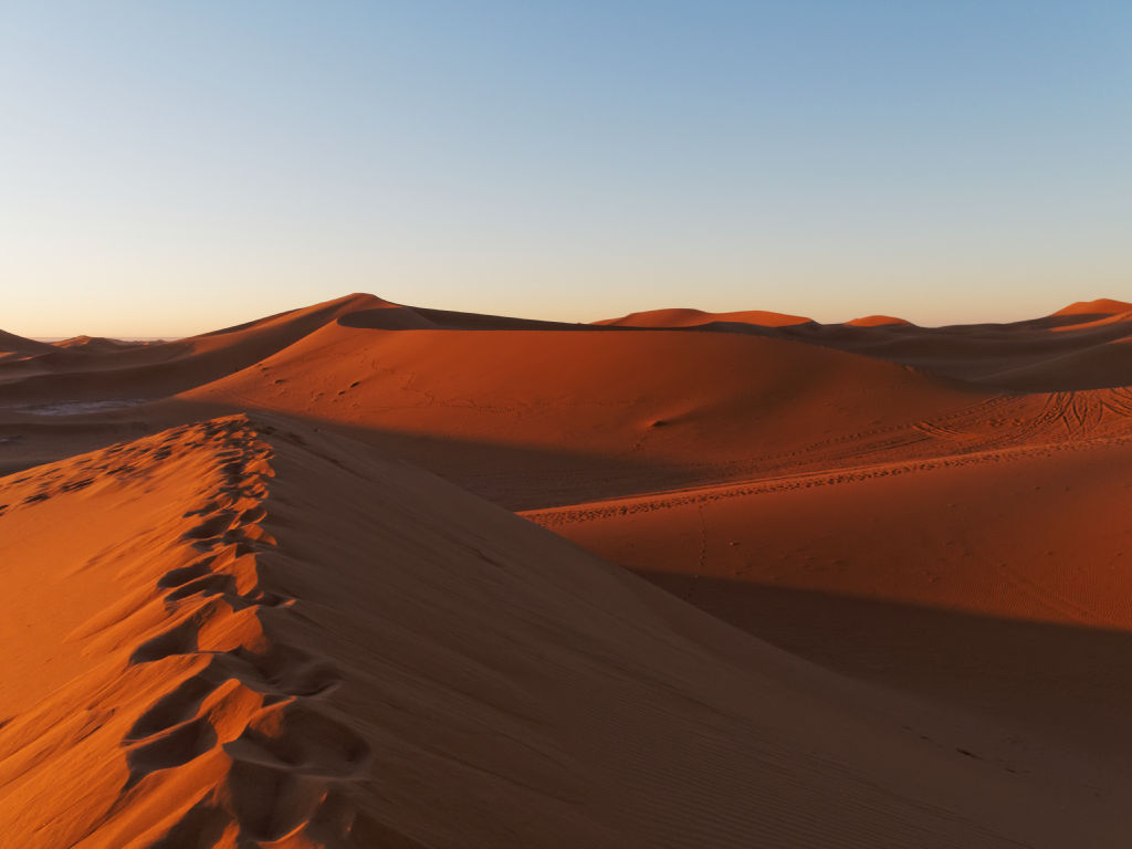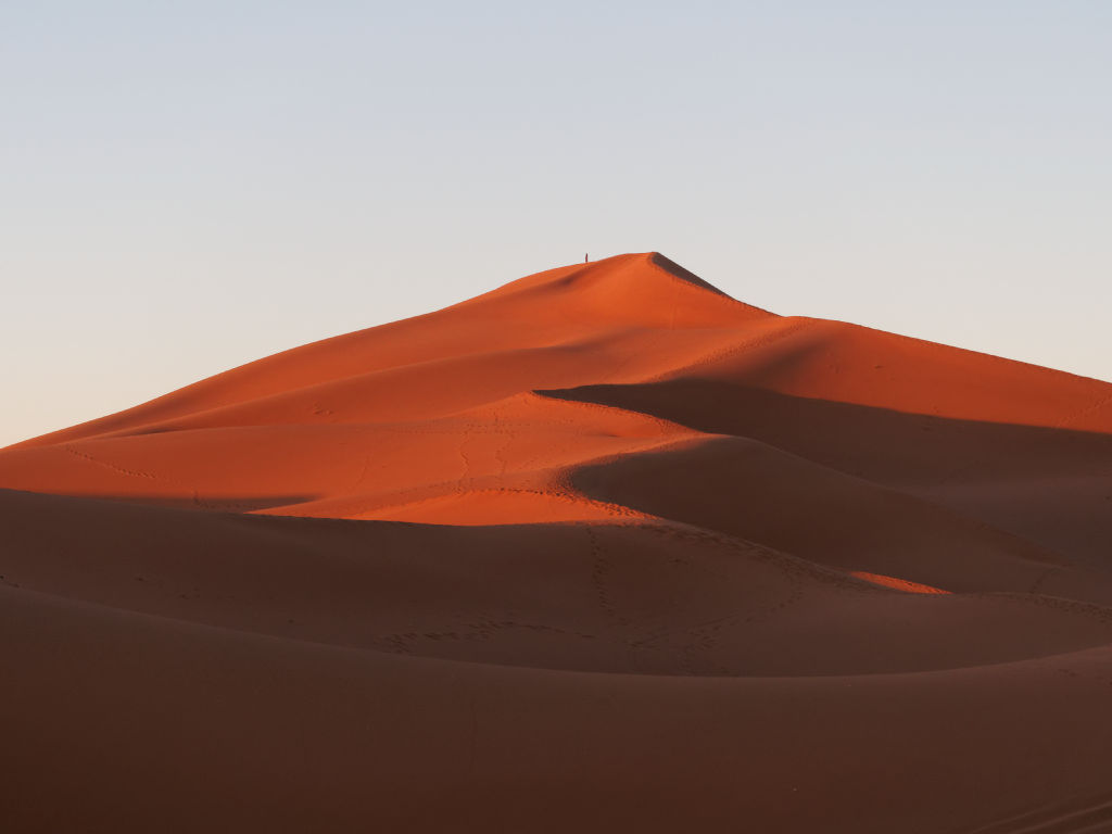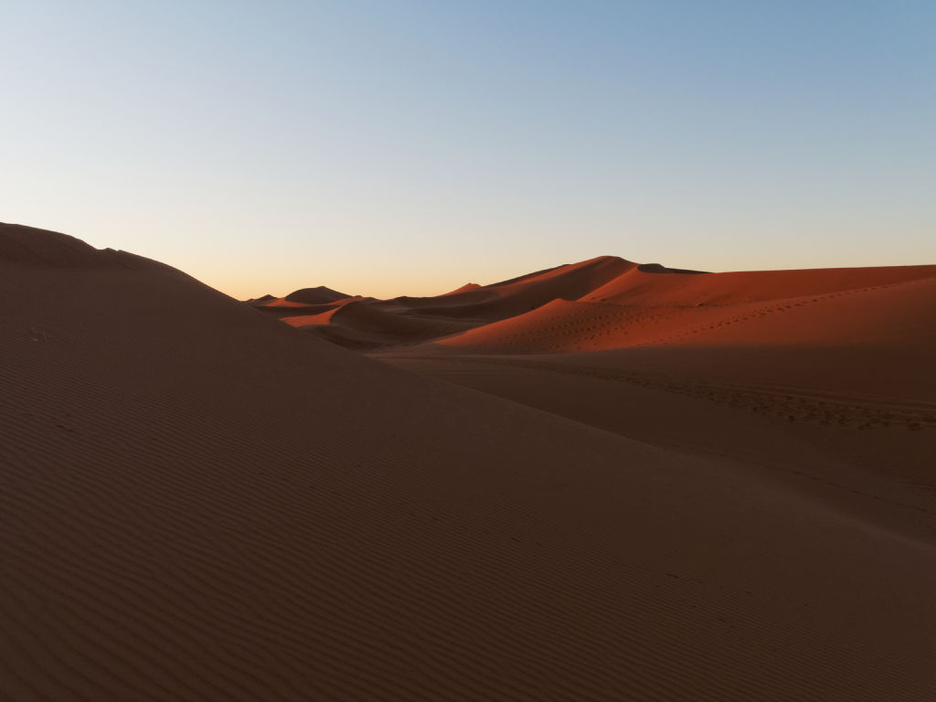 La pointe des dunes s’illumine l’une après l’autre, puis toutes les dunes sont baignées de la douce lumière rasante.
