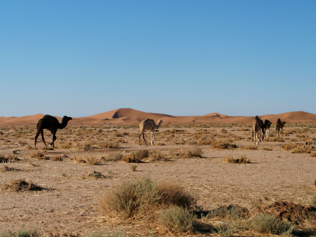 On aperçoit des dromadaires au loin, le chauffeur gentiment fait un petit détour pour que je puisse les voir de près, avec les dunes en arrière plan.