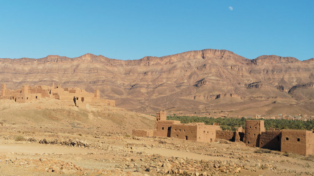Lever de lune sur les kasbahs de la vallée du Draa.