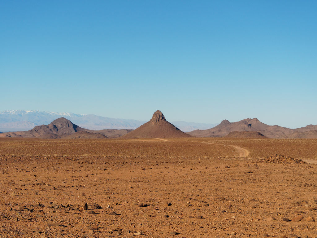 Ca y l'Erg Chegaga s'éloigne... On contourne la mer de sable en prenant une piste de terre durcie plus roulante.