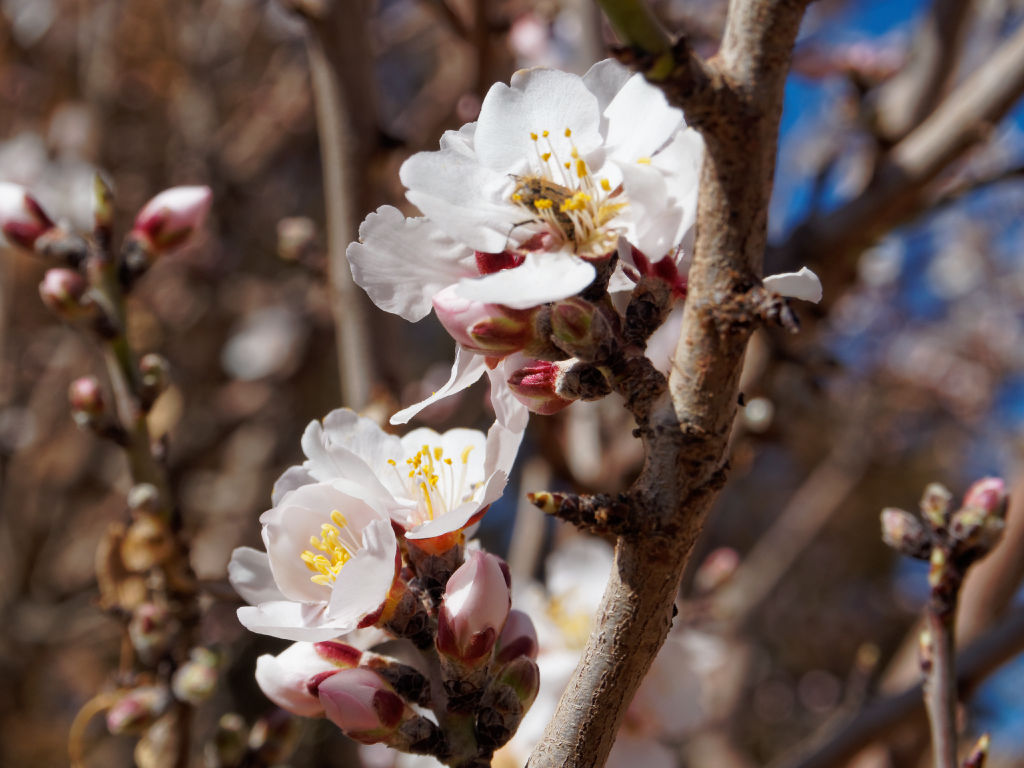 J’ai de la chance car aujourd’hui la plupart des amandiers sont en fleur et le blanc des fleurs donne un magnifique contraste avec le rouge des montagnes et des habitations.