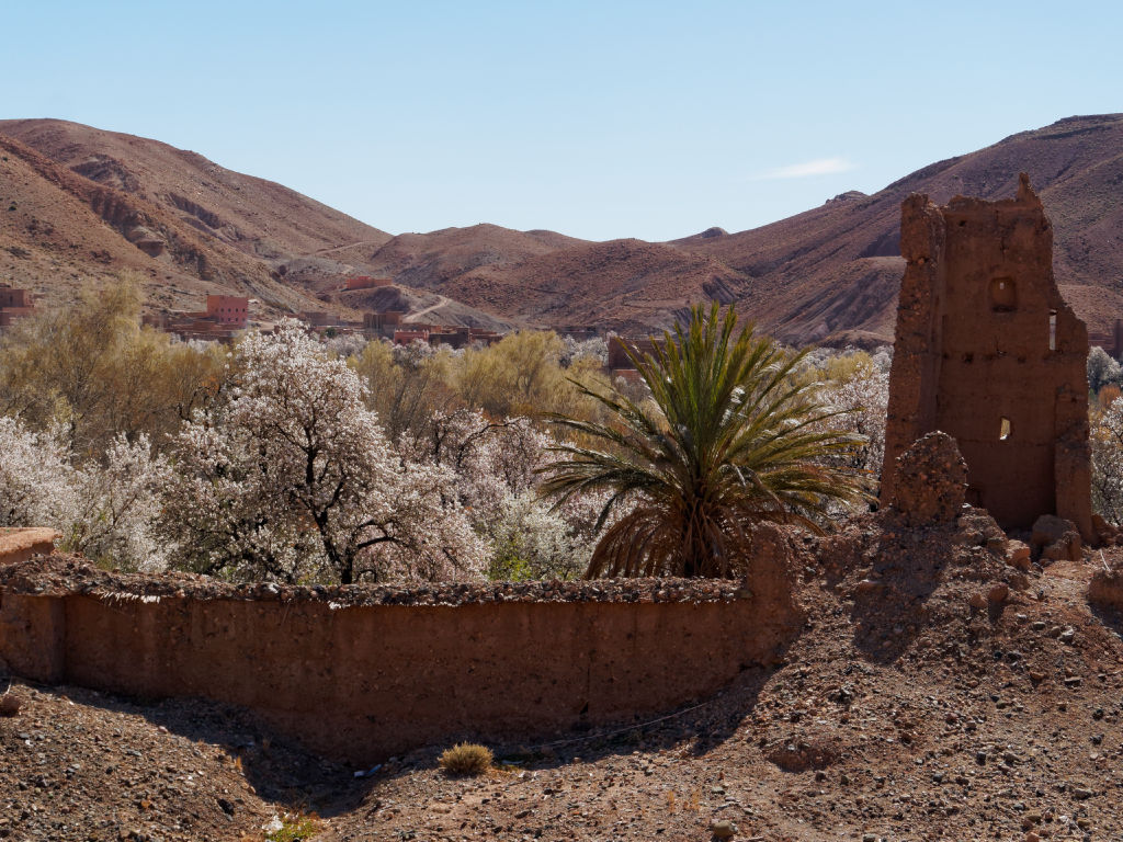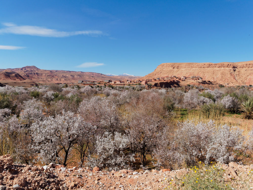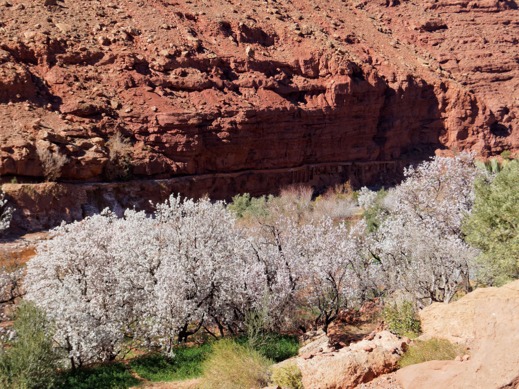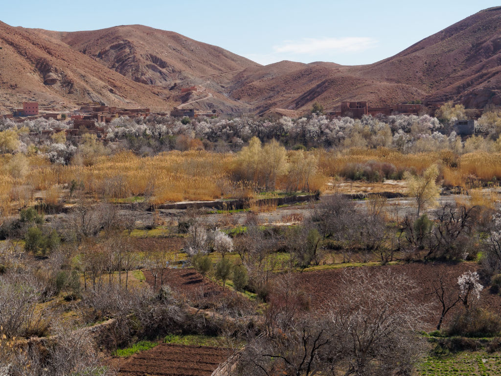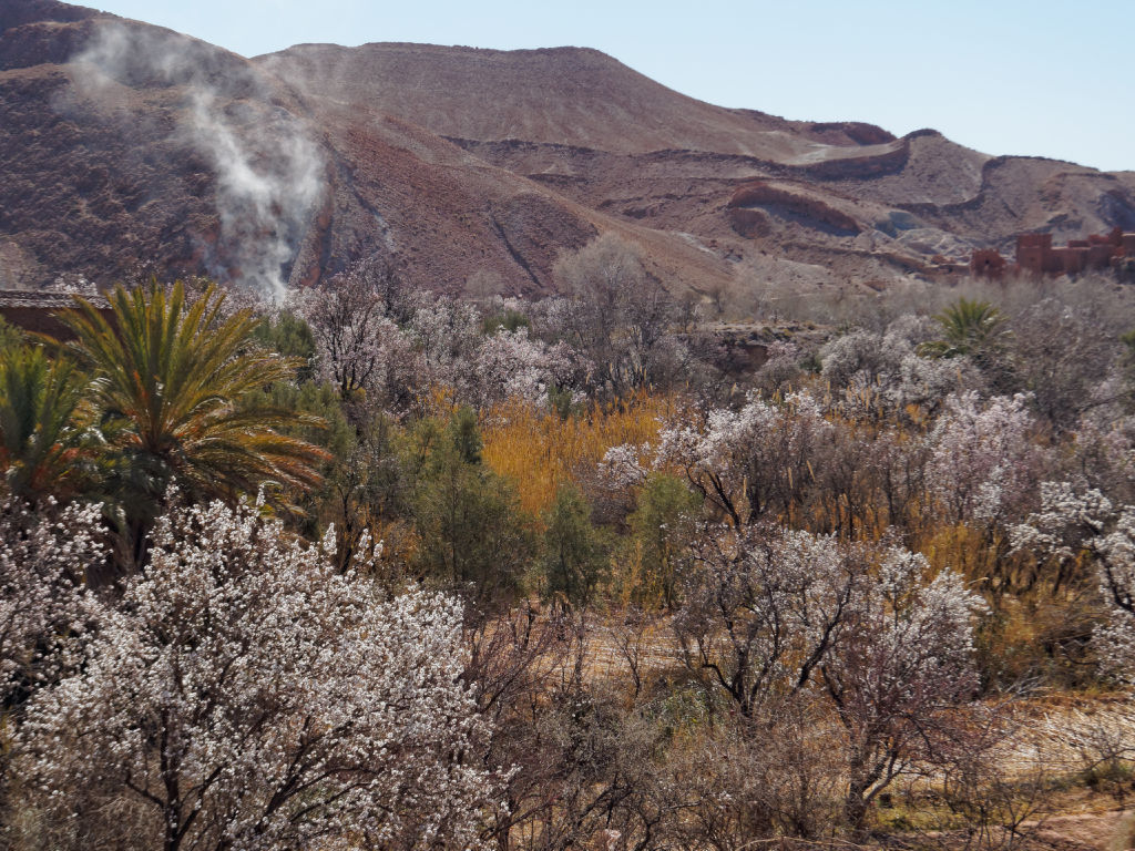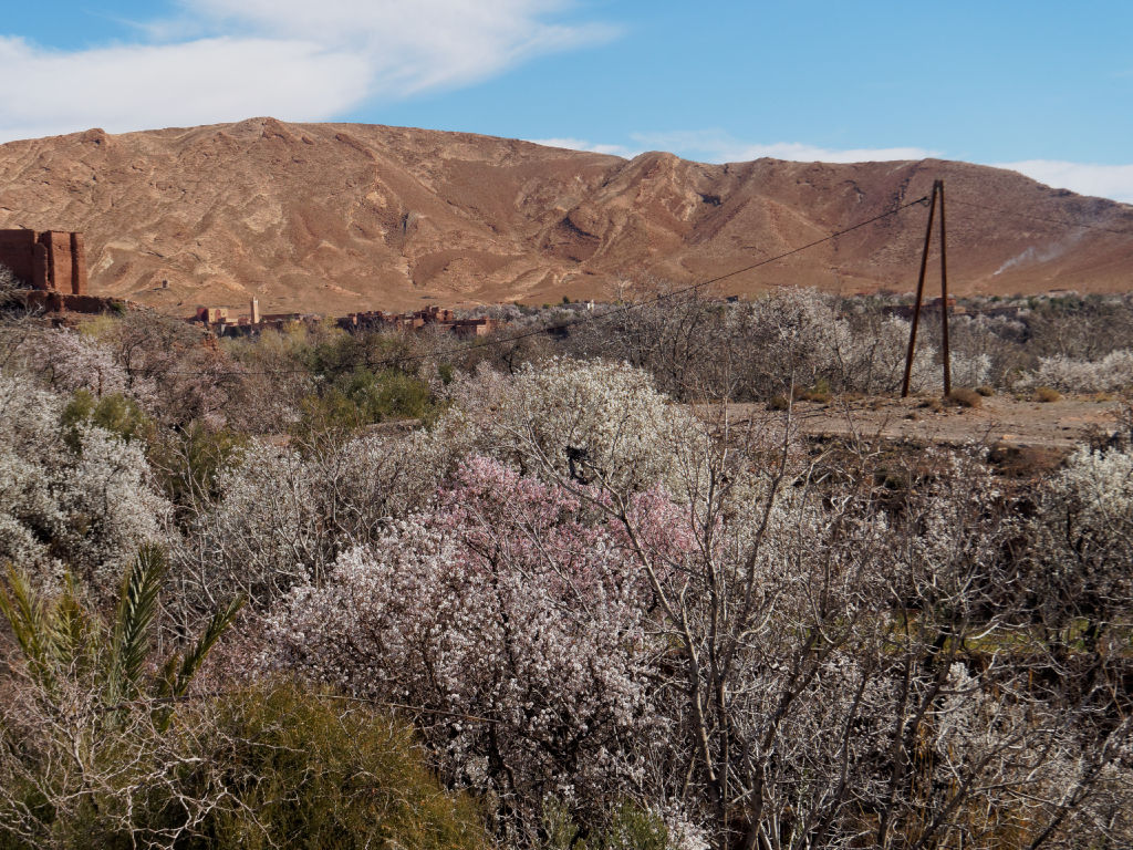 Après Ait Benhaddou, je retrouve les amandiers en fleurs. Il y en a plein ici aussi dans la vallée de l’Ounila, leur couleur blanche donne un magnifique contraste, c’est peut être le meilleur moment de l’année pour parcourir cette route.