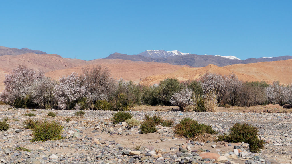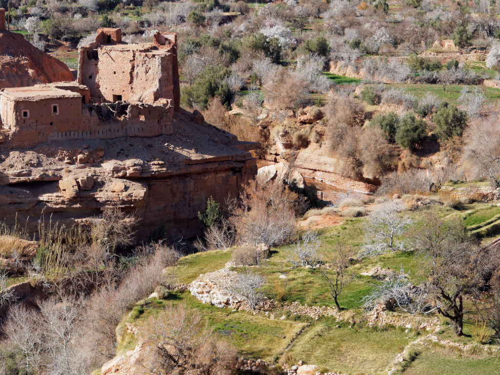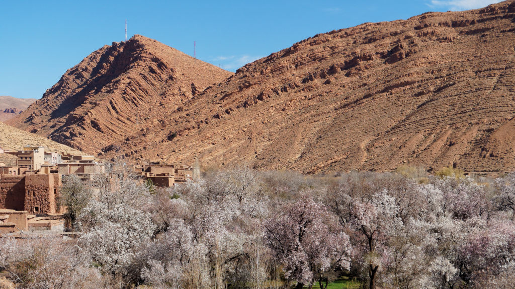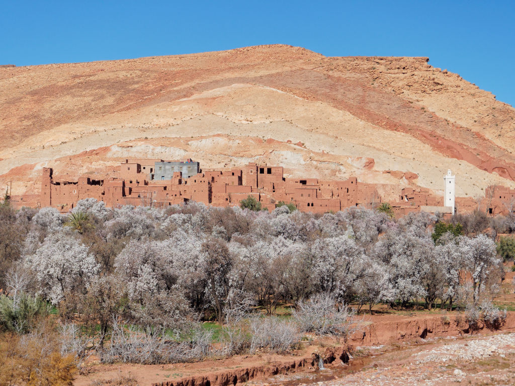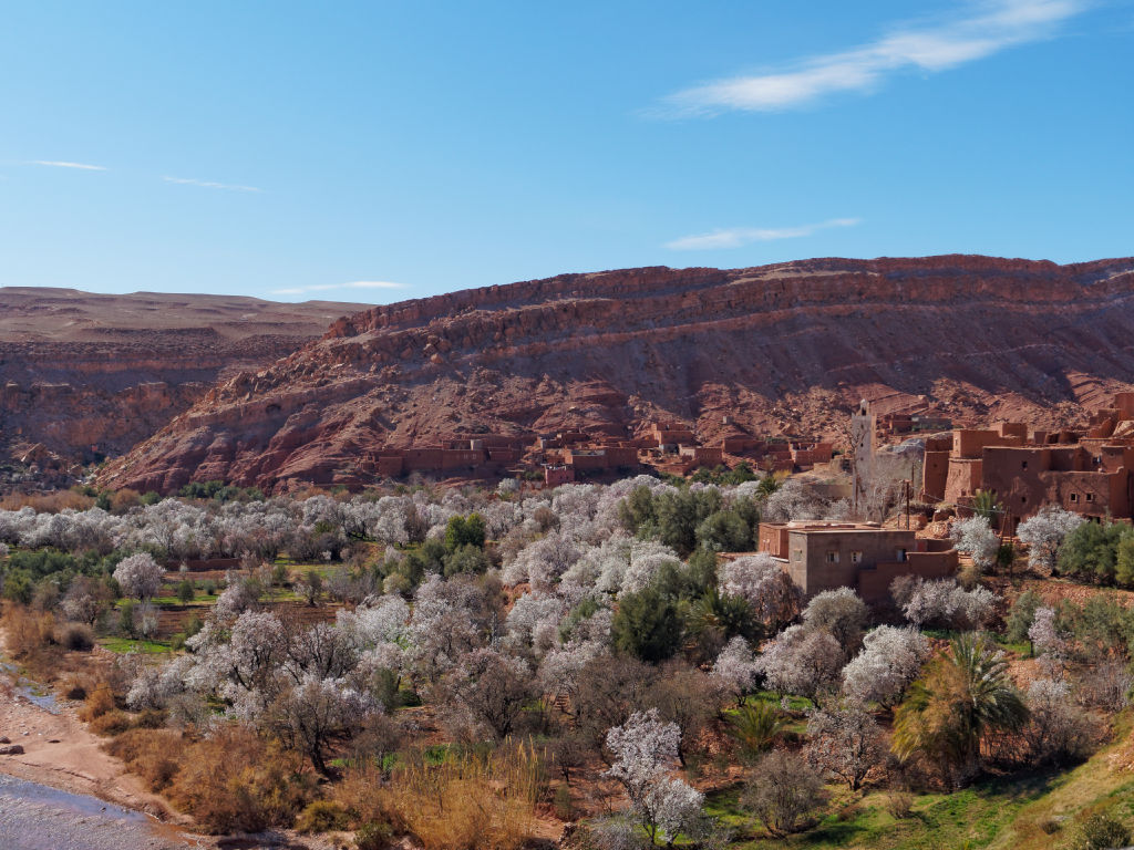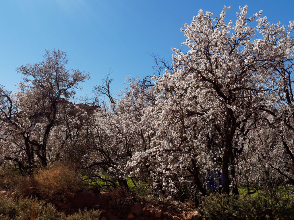Après Ait Benhaddou, je retrouve les amandiers en fleurs. Il y en a plein ici aussi dans la vallée de l’Ounila, leur couleur blanche donne un magnifique contraste, c’est peut être le meilleur moment de l’année pour parcourir cette route.