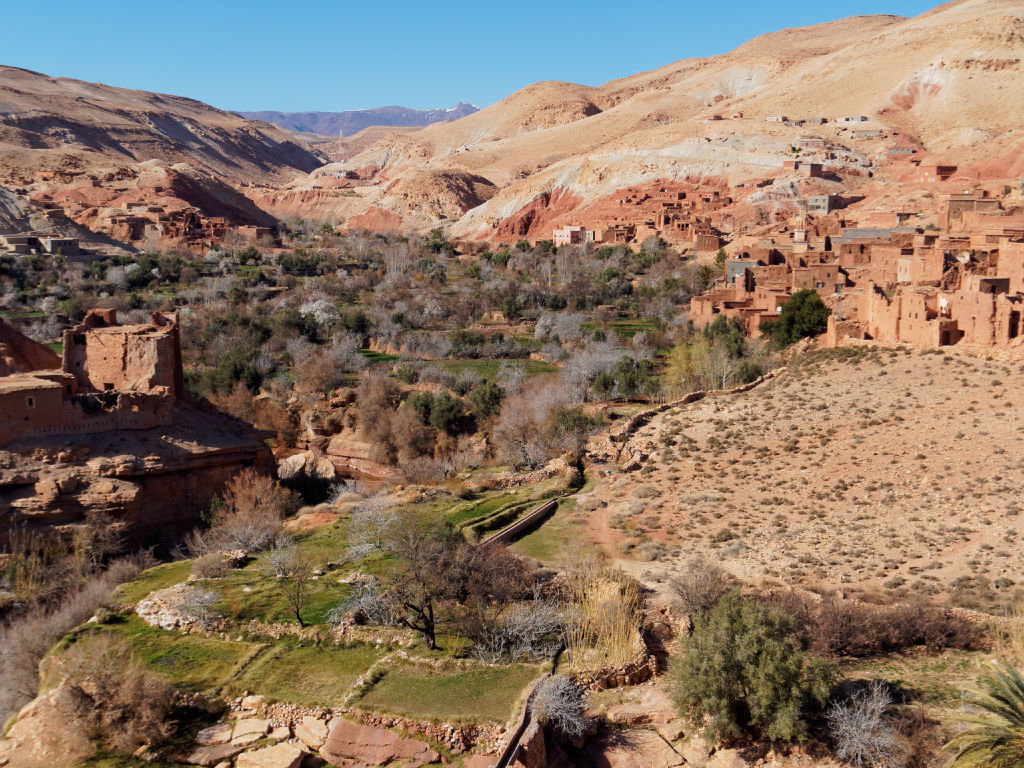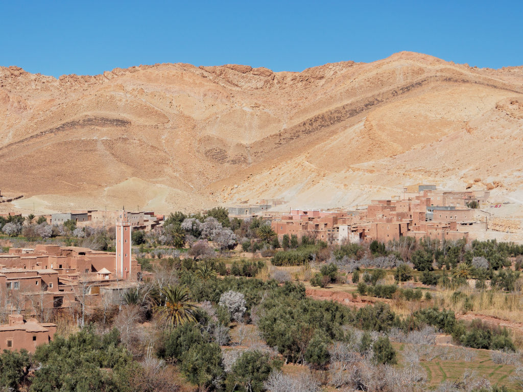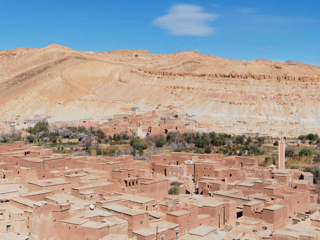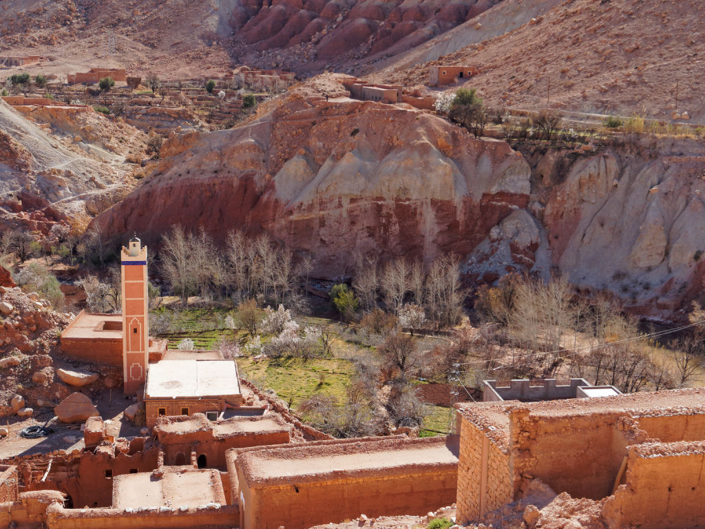 Panorama sur la vallée et les montagnes ocres, ici la mosquée est peinte en blanc.