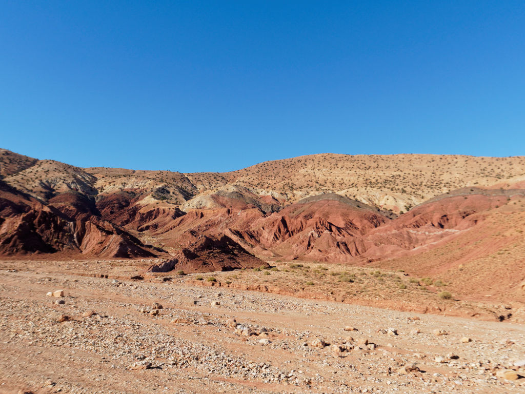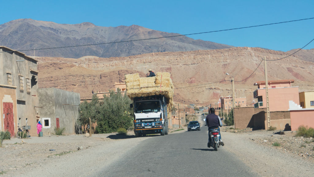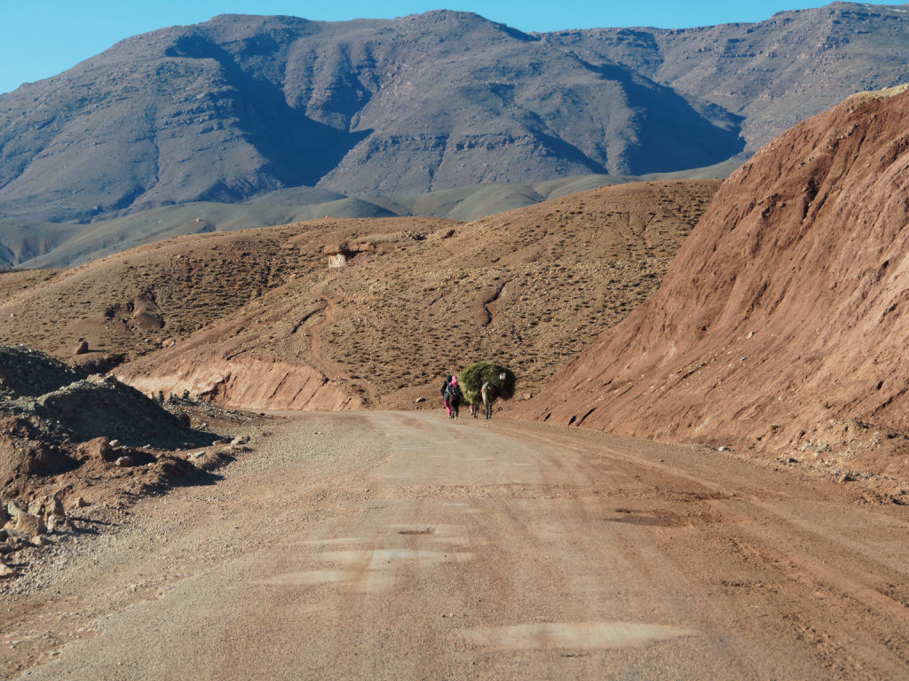 Je préfère détecter un problème proche de Ouarzazate plutôt que perdu en montagne. Le mécanicien accepte de me laisser mettre la voiture sur le pont. Sous la voiture on voit bien le choc de la barre de fer, mais rien de suspect à première vue. J’essaye de répéter le bruit avec le mécano mais rien. Je reprends donc la route un peu plus confiant dans la voiture. Mais quelques temps après le bruit revient, je le localise au niveau de la roue arrière gauche, comme si l’amortisseur ne remplissait plus sa tache et que la caisse tapait directement sur chaque bosse. Le bruit m’accompagnera toute la journée.