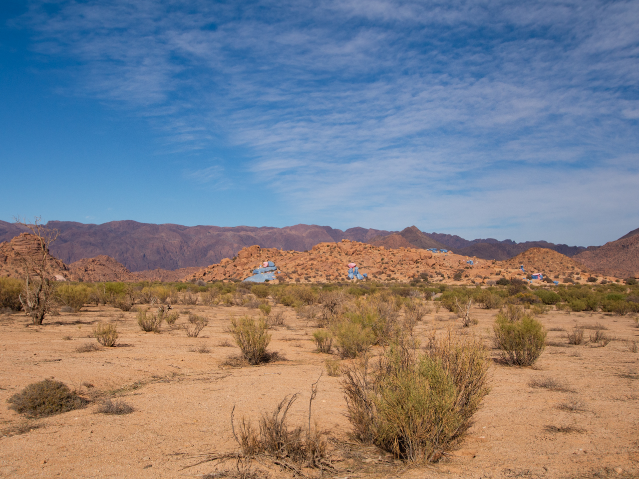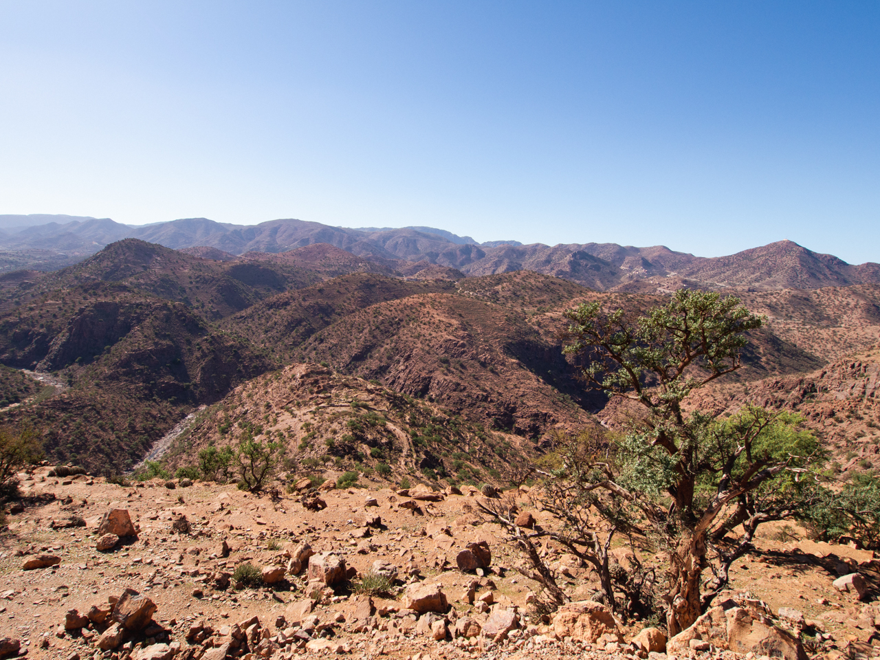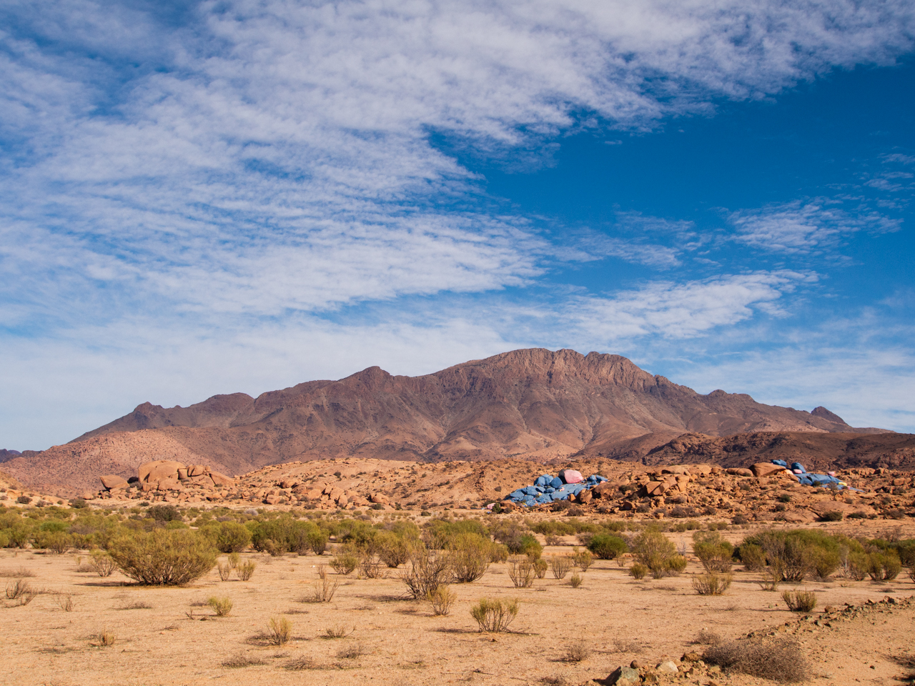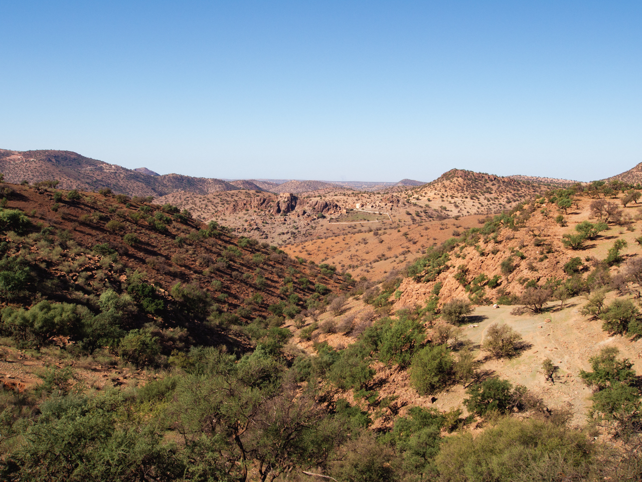 Aujourd’hui commence l’aventure et on part en matinée plein Sud en direction de Tafraout, au coeur de la chaine de montagne de l’Anti Atlas. L’Anti Atlas est la dernière frontière avant le désert du Sahara, avec des cimes culminant à plus de 2000 mètres, un climat sec et une belle coloration ocre. Cette région n’est pas très touristique, la route traverse d’abord la plaine du Souss autour d’Agadir, où l’on aperçoit de nombreux arbres arganiers, reconnus pour la production d’huile d’argan. Ce n’est pas la plus belle section et on passe rapidement sauf pour faire une pause technique.