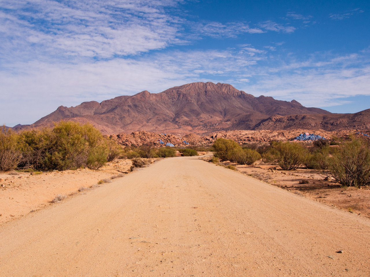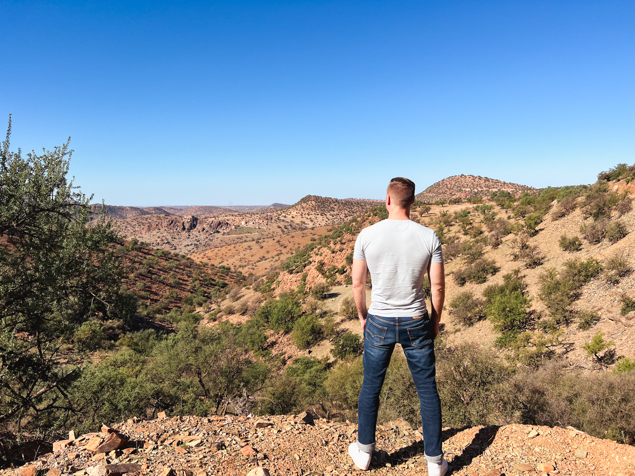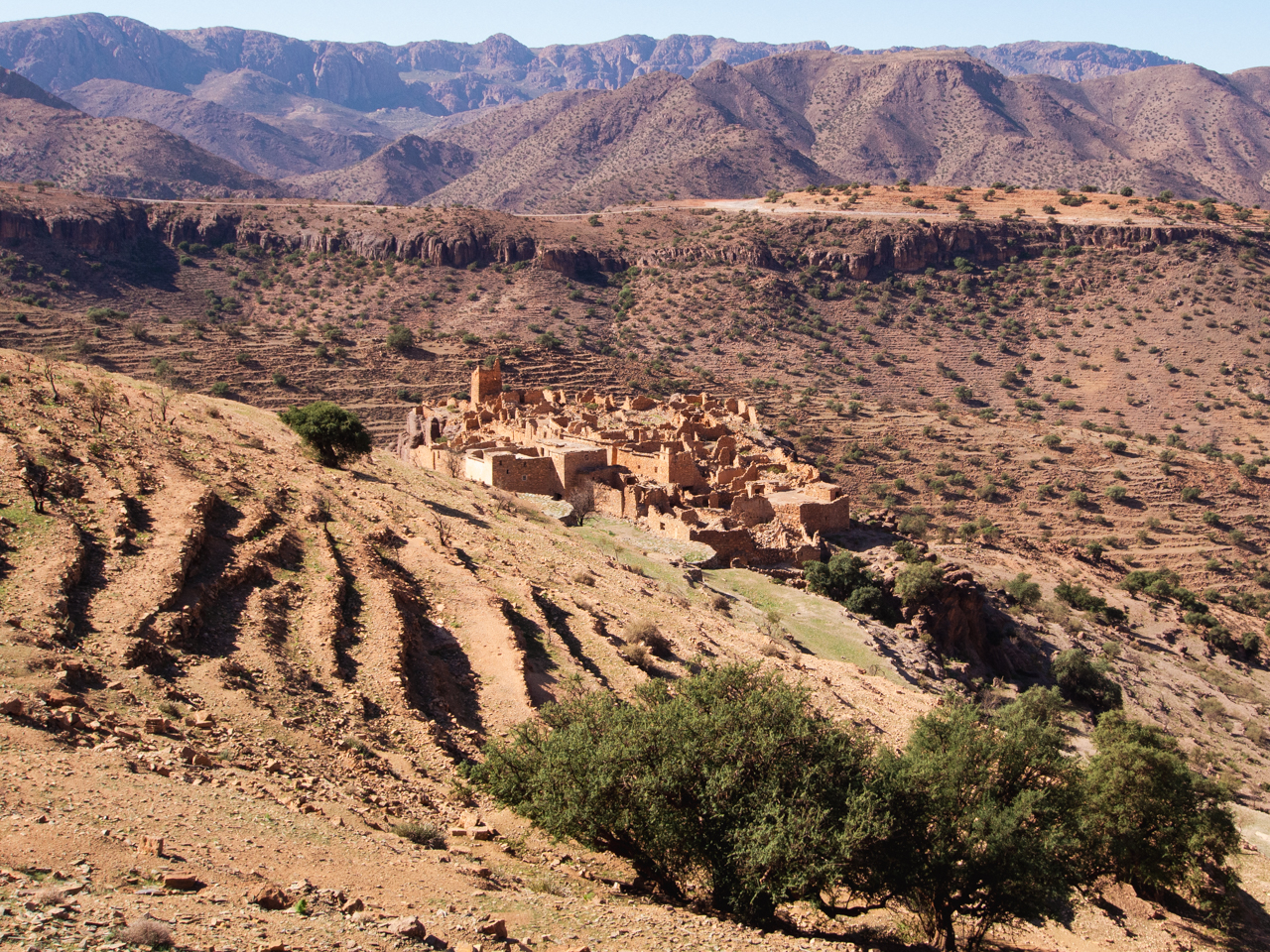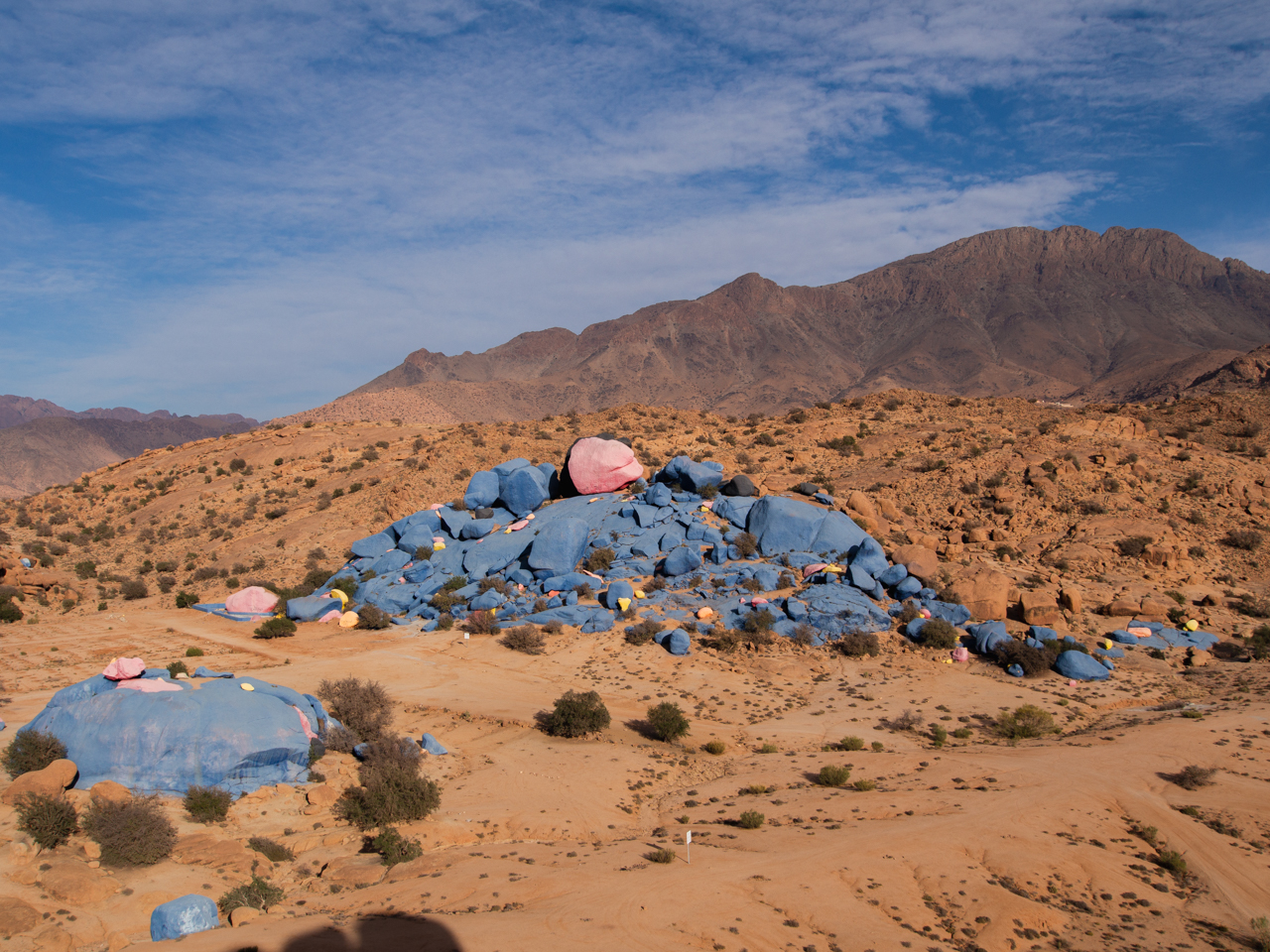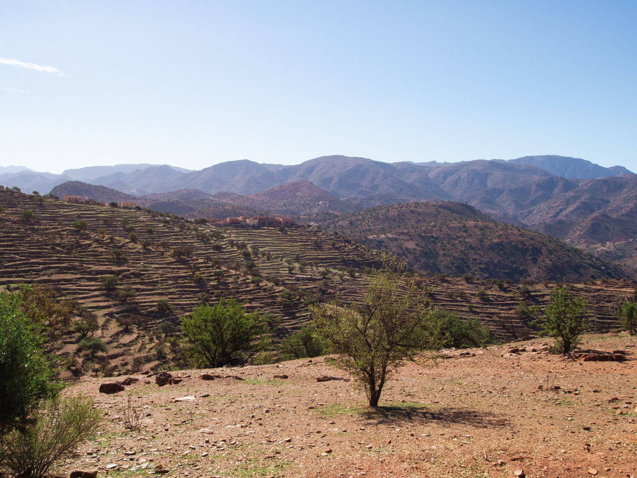Aujourd’hui commence l’aventure et on part en matinée plein Sud en direction de Tafraout, au coeur de la chaine de montagne de l’Anti Atlas. L’Anti Atlas est la dernière frontière avant le désert du Sahara, avec des cimes culminant à plus de 2000 mètres, un climat sec et une belle coloration ocre. Cette région n’est pas très touristique, la route traverse d’abord la plaine du Souss autour d’Agadir, où l’on aperçoit de nombreux arbres arganiers, reconnus pour la production d’huile d’argan. Ce n’est pas la plus belle section et on passe rapidement sauf pour faire une pause technique.