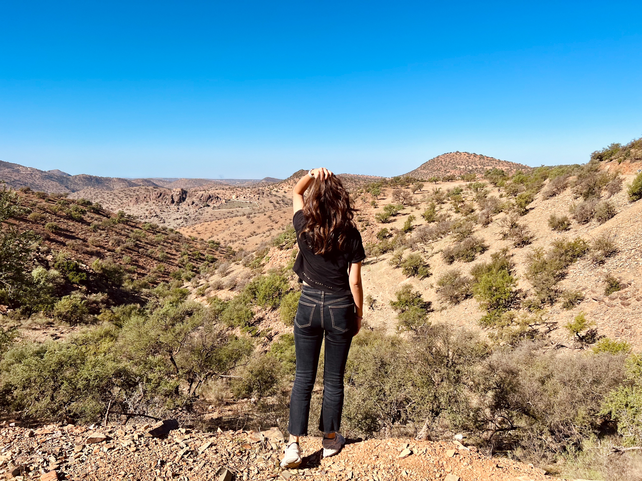 Au début, on avait imaginé dormir ici directement après avoir atterri à Agadir, mais finalement je ne regrette pas d’avoir annulé ma réservation, car la route depuis Agadir mérite quand même d’être parcourue en journée, et avec tous ces lacets, je trouve le périple un peu dangereux. Il vaut mieux prendre son temps et profiter plutôt qu’essayer de courir. Par contre, il est vrai que cet endroit laisse rêveur avec une telle position au milieu des montagnes de l’Anti Atlas. Peut être une autre fois si on revient dans la région. En tout cas, on continue notre chemin jusqu’à Tafraout toujours sur cette route de montagne pas bien large mais les arrêts pour admirer le paysage nous permette de récupérer et de ne pas trop subir la fatigue de la conduite. Il faut dire que le paysage change beaucoup en peu de kilomètres. On s’élève au dessus d’une vallée avant de plonger du côté de notre destination finale.