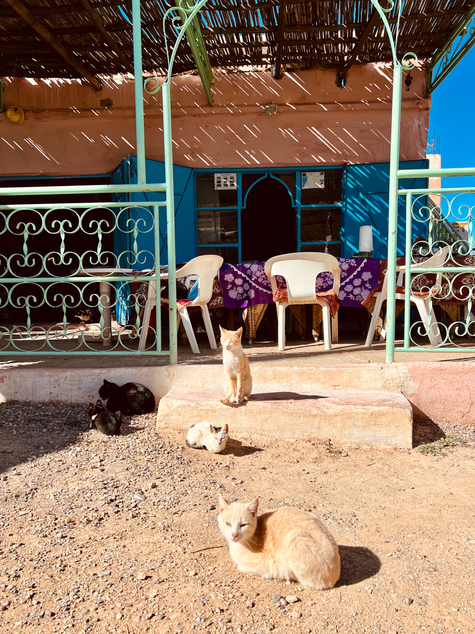 Finalement, on trouve un petit restaurant en bord de route. Un vieux monsieur et sa femme nous accueille avec tous leurs chats, une étape bienvenue car la faim commençait à nous tirailler et on ne voyait pas où on aller acheter quelque chose par ici.