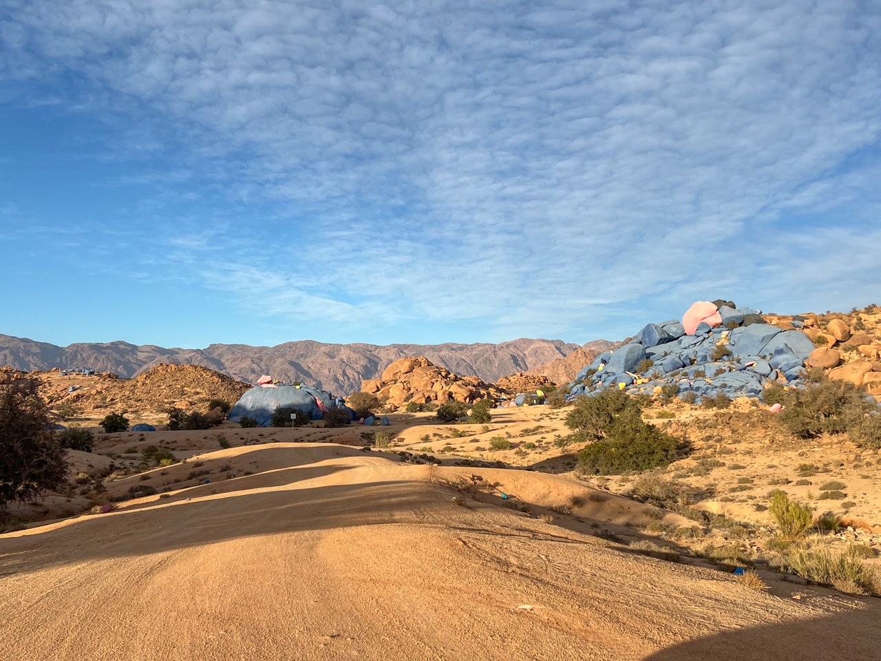 On se gare devant les gros blocs de granit peints. Il y a deux autres voitures sur le parking, autant dire que ce n’est pas la grande foule. On peut grimper sur ces blocs et marcher autour. Cela fait du bien après une journée de voiture.